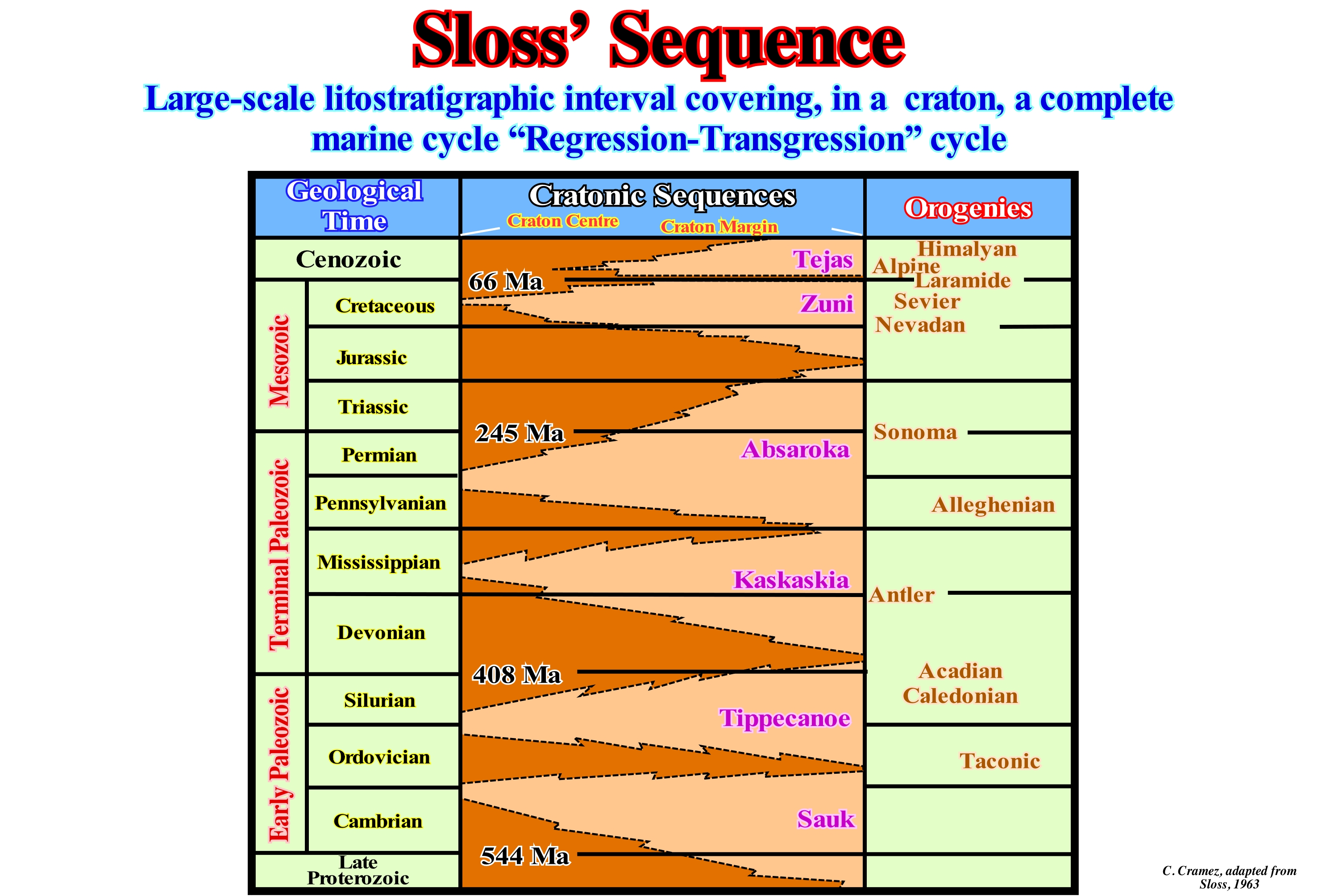 Laurence L. Sloss, in 1949, introduced the term sequence in the stratigraphy to designate a succession of strata bounded by unconformities (erosional surfaces). Later, in 1950, he considered a sequence as a set of depositional cycles (allostratigraphic units) and not as a chronostratigraphic unit, since the unconformities do not coincide with the timelines. In continuation of his works, in 1963, Sloss, already in the University of the Northwest, USA, proposed a new paradigm in the stratigraphy and particularly, In stratigraphic analysis. He recognized, at large scale, the importance of the sedimentary intervals limited by unconformities, which he called cratonic sequences (stratigraphic units of a hierarchy larger than a group, i.e., a megagroup or supergroup, which can be mapped over large areas of a continent and limited by interregional unconformities). This is why a geoscientist with experience in stratigraphy can look at an outcrop and say, for example, these Lower Cambrian sandstones were deposited in the Early Cambrian, or these clay limestones are, probably, of the Cretaceous, without the aid of fossils or a mass spectrograph (an instrument to study the different luminous spectra, especially, the arrangement of the stripes they present, with a photographic plate). Do not forget: Upper Cretaceous is for rocks and Late Cretaceous is for the time (ages). In the same way, a geoscientist in charge of tentative geological interpretation of the seismic lines, nowadays, perfectly, recognizes, for instance, the unconformity SB. 30 Ma, without it being necessary to drill a well in order to give an approximate age to the cuttings. Do not forget, too, that 30 Ma is by convention an age (millions of years ago) and 30 My is an interval of 30 million years, but it may be either Paleozoic and Cenozoic. It was Sloss who began the basic work of what is now called sequential stratigraphy, and it was he who said that each cratonic sequence is characterized by an internal tectonics and an idiosyncratic petrology (different from usual, different from that which is usually done). The depositional sequence of Vail et al., (1977), is a stratigraphic unit that is composed of a, more or less, concordant sequence of genetically related strata and limited at the top and bottom by unconformities or their correlative deep-water paraconformities. However, the depositional sequence of P. Vail has an order of magnitude (smaller hierarchy) than the Sloss' sequence. In the hierarchy "Sequence, Supersequence and Megasequence", initially, proposed by Vail, it is the supersequence that corresponds to the Sloss' sequence. In this figure are shown the North American craton sequences (Sloss' sequences), which are separated by unconformities (erosional surface induced by significant relative sea level falls). In the light brown coloured areas, the sediments have been eroded or not deposited, which means they represent a, more or less, important hiatus. In the cratonic basins and divergent continental margins, sedimentary records, which are, mainly, transgressive episodes (global continentward displacements of the shoreline and coastal deposits in association with an absolute (eustatic) sea level rise** and not relative) and regressive (seaward displacement of the shoreline and coastal deposits in association with an absolute (eustatic) sea level fall), are limited by unconformities. Some unconformities are minor, but others represent very long periods of time and can be recognized over great distances. The Sloss' sequences comprise sedimentary intervals that can encompass various geological systems (in North America, for instance, the beginning of the Ordovician corresponds to the culmination of the great transgressive Cambrian episode that Sloss called the "Sauk sequence."