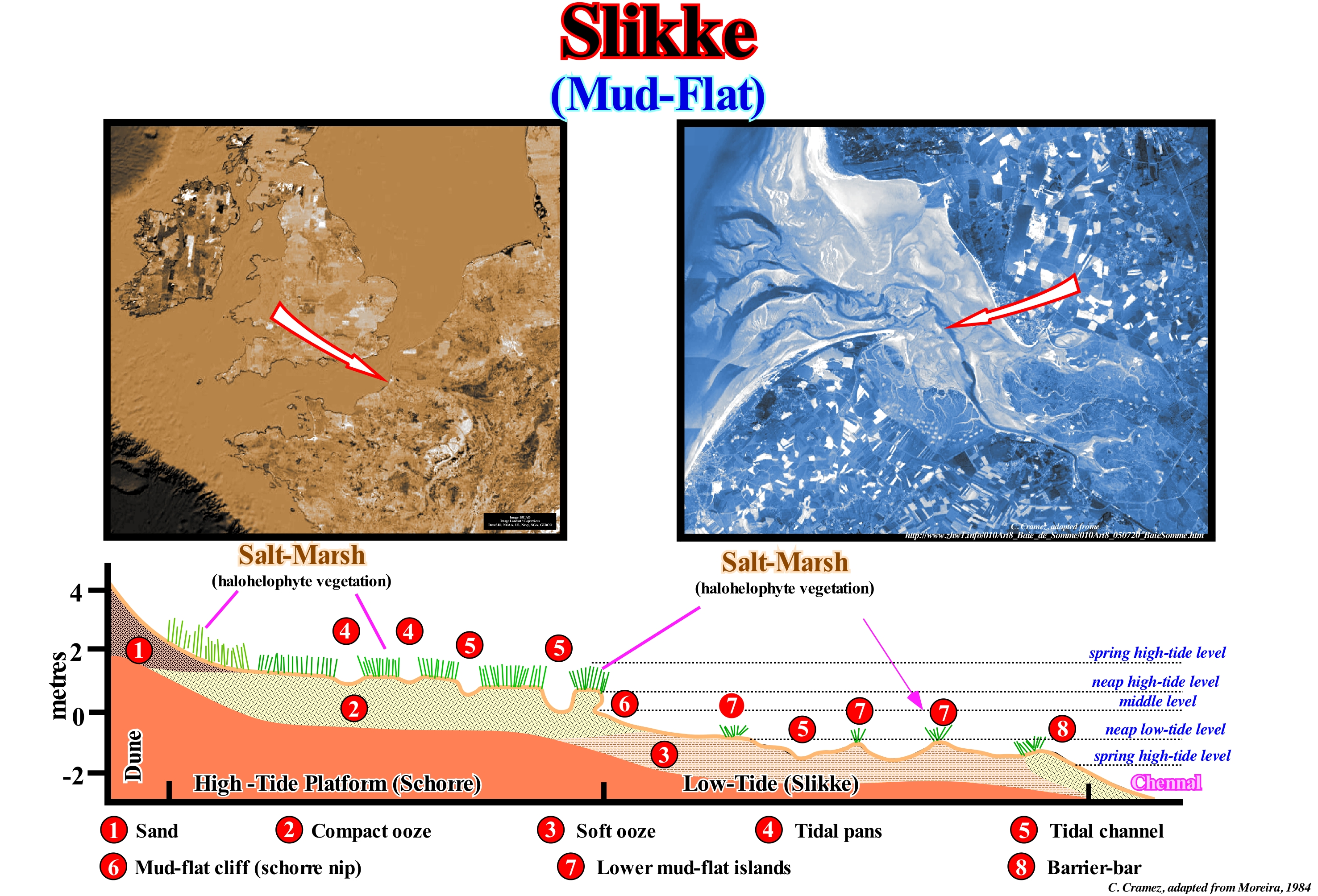 A few years ago, marshes and mudflats (compact and soft), such as those of Somem estuary (France), illustrated in this figure discourage tourists because of their landscape was considered hostile and uninteresting. At present, awareness of the ecological importance of wetlands has, significantly, altered the perception of so-called captivating landscapes. In the slikke sketch shown in this figure, one can recognize: (i) Sand ; (ii) Compacted ooze; (iii) Soft Ooze ; (iv) Tidal Pans ; (v) Tidal channels ; (vi) Mud-Flat Cliffs ; (vii) Lower Mud-Flat Islands (marshes) and (viii) Barrier-Bars. The compacted ooze of the schorre (upper marsh), which is submerged just during spring high-tides, is individualized from the soft ooze of the slikke (lower marsh) by the mud-flat cliff (schorre nip). As illustrated, the slikke emerges only during spring low-tides. Do not forget that the low-tide is the minimum level of water at the end of the ebb, when the current is kept still and that in semi-diurnal tides (when there are two low-tides in the same day) to the lower one is called lower tide as opposed to the one of greater height, which is upper low-tide. On the other hand the spring low-tide, is the low tide that occurs near the equinoxes. On the other hand, the high-tide marks the maximum level of a full tide and the spring high-tide the high-tide occurring during the equinoxes. The soft ooze has little vegetation, but has a huge bacterial biomass that plays a fundamental role in the processes of auto-depuration and recycling of dead organisms. It houses a wide variety of bivalve species (clams, cockles, etc.), small grass gastropods, green crabs, herbivorous fish and hunters (mules, plaice, snapper, etc.). Worms and molluscs that live in the salt water are the preferred food of many birds.