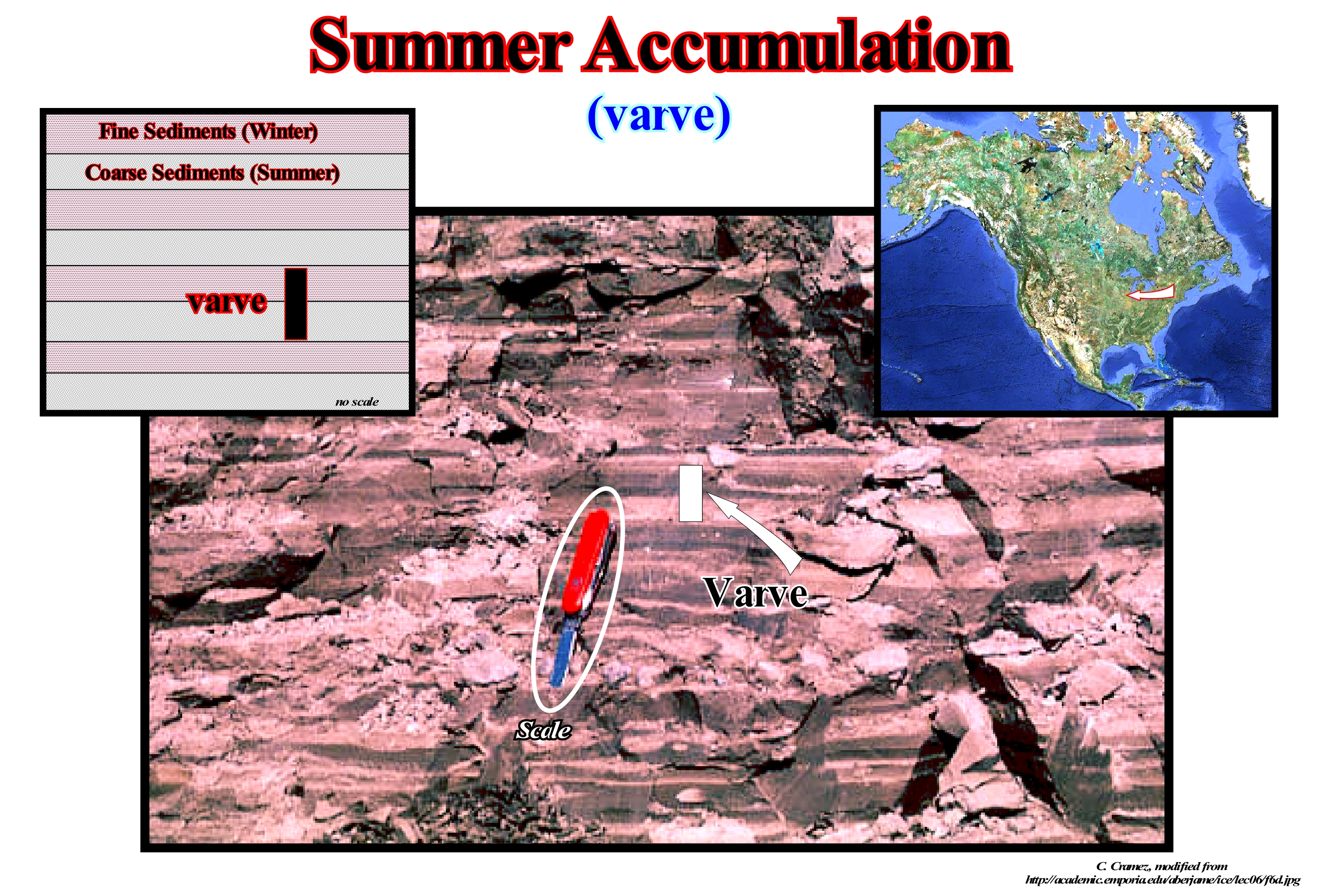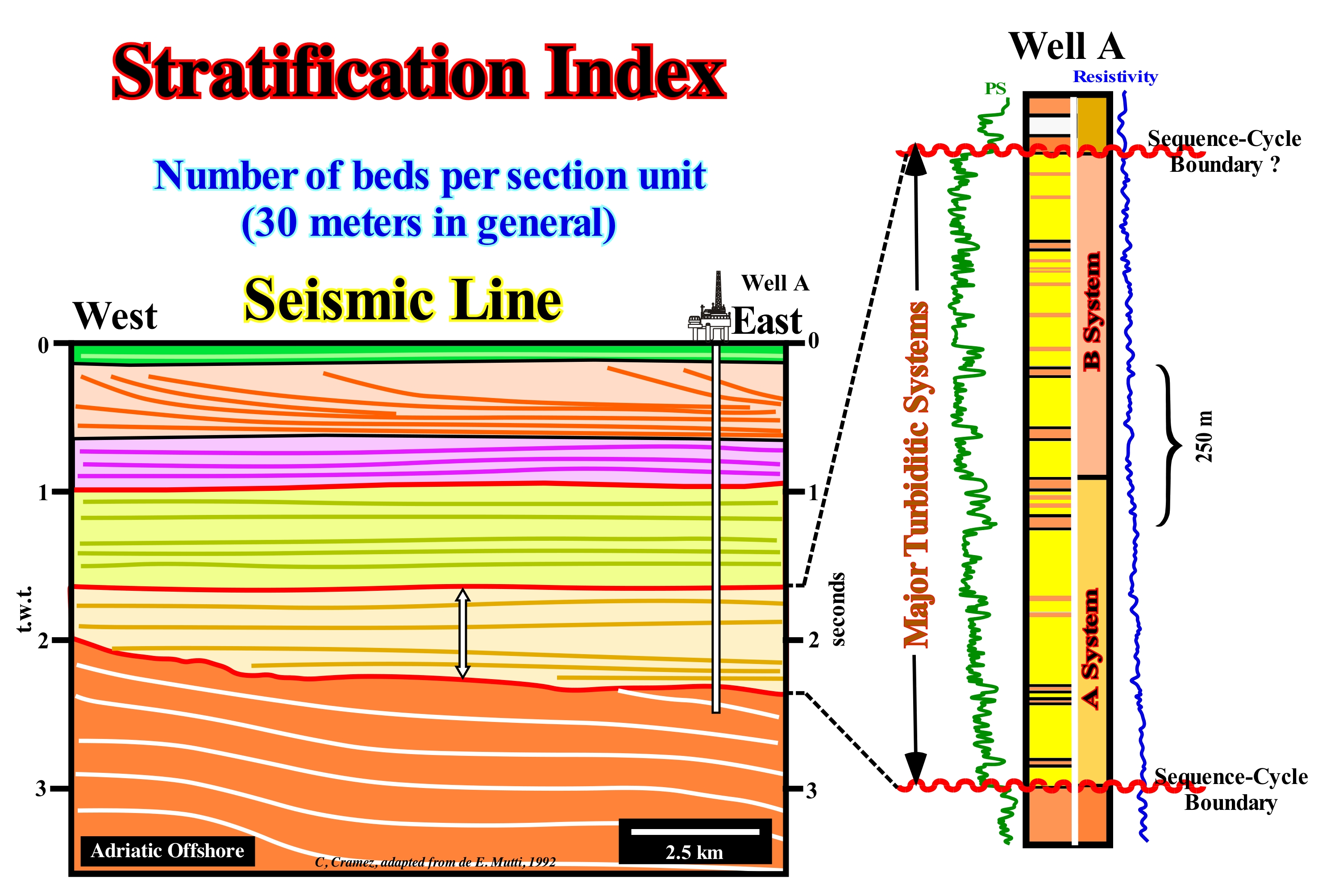 The stratification index is significant when each layer underlines a particular geological event and independent of the relative sea level change, that is, of accommodation, which is the case of turbiditic deposits. Each turbidite lobe represents a current of turbidity induced or not by a relative sea level fall (there are turbiditic deposits deposited during highstand geological conditions). In platform deposits, the stratification index is dependent on the creation of available space for the sediments (accommodation), that is, relative sea level rises, not from geological time. Stratigraphic systems, such as in the Silurian or Cretaceous, deposits are episodic, incomplete, with numerous erosion and nondeposit hiatus, and they do not translate the equivalent duration of geological time. The hiatus of the great majority of the stratigraphic sections is, generally, more important than the total time of effective deposition of the preserved sediments. The deposition time is inversely proportional to the settling velocity, i.e., the higher the sedimentation velocity, the shorter the deposition period. Most periods of no deposition go unnoticed. This has led some geoscientists to consider the sedimentary records as short periods of "terror" separated by long periods of "calm" where nothing or almost nothing happens. The validity of the stratification index depends, also, on the preservation of deposits. Some, such as fluvial and, in particular, overbanking deposits, have a weak preservation (they settle down above the base depositional level). Others, such as the turbidite deposits, illustrated in this figure, which underline episodic geological events have an excellent preservation. Finally: (i) Bedding surfaces represent a small hiatus ; (ii) If the hiatus is large, the surface is considered an unconformity (the term large is relative and depends on the time scale considered) ; (iii) The term unconformity is used when the hiatus is by erosion; (iv) The hiatus varies along a bedding surface and (v) The stratification concept is dependent on the time scale and the rocks considered.