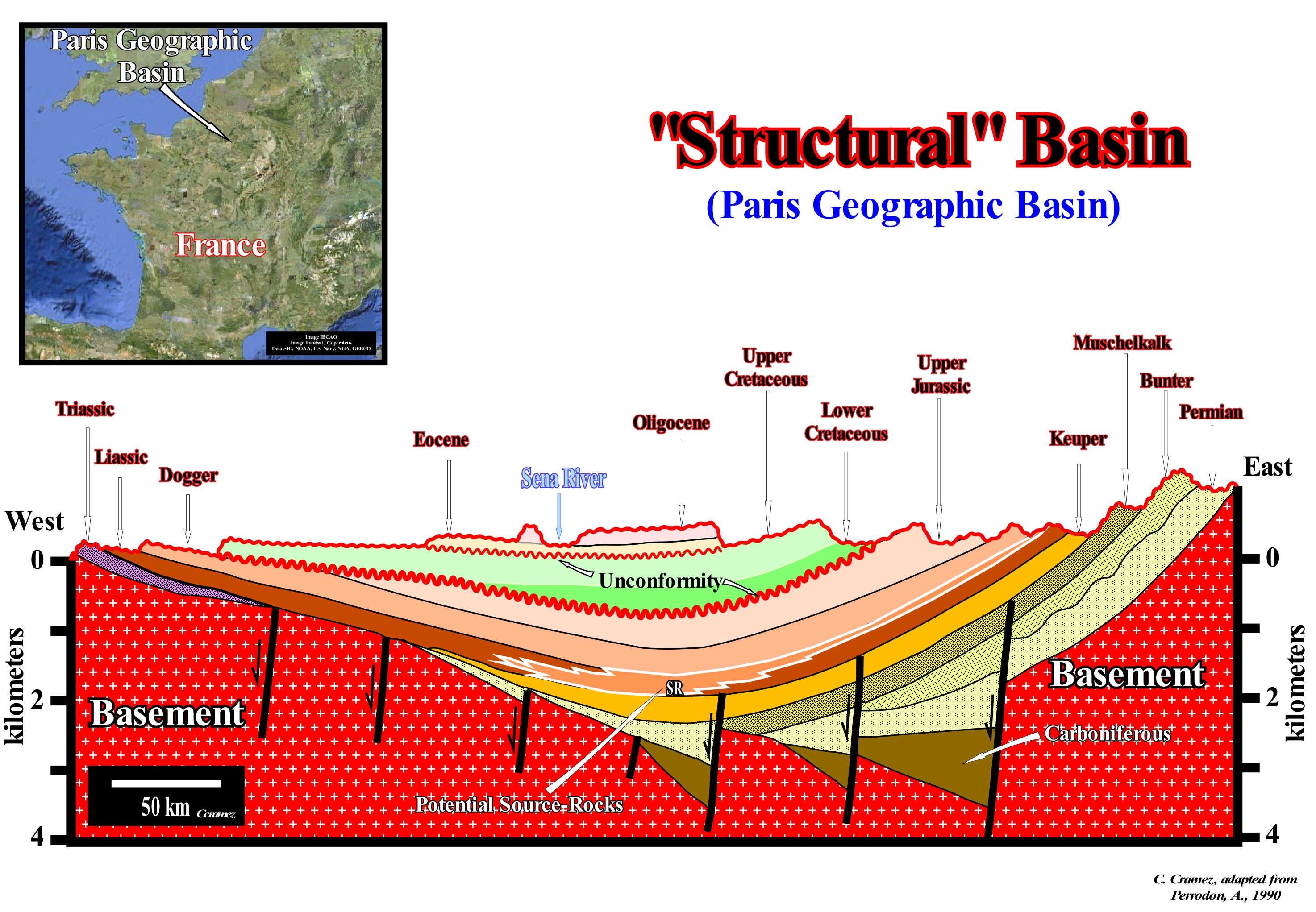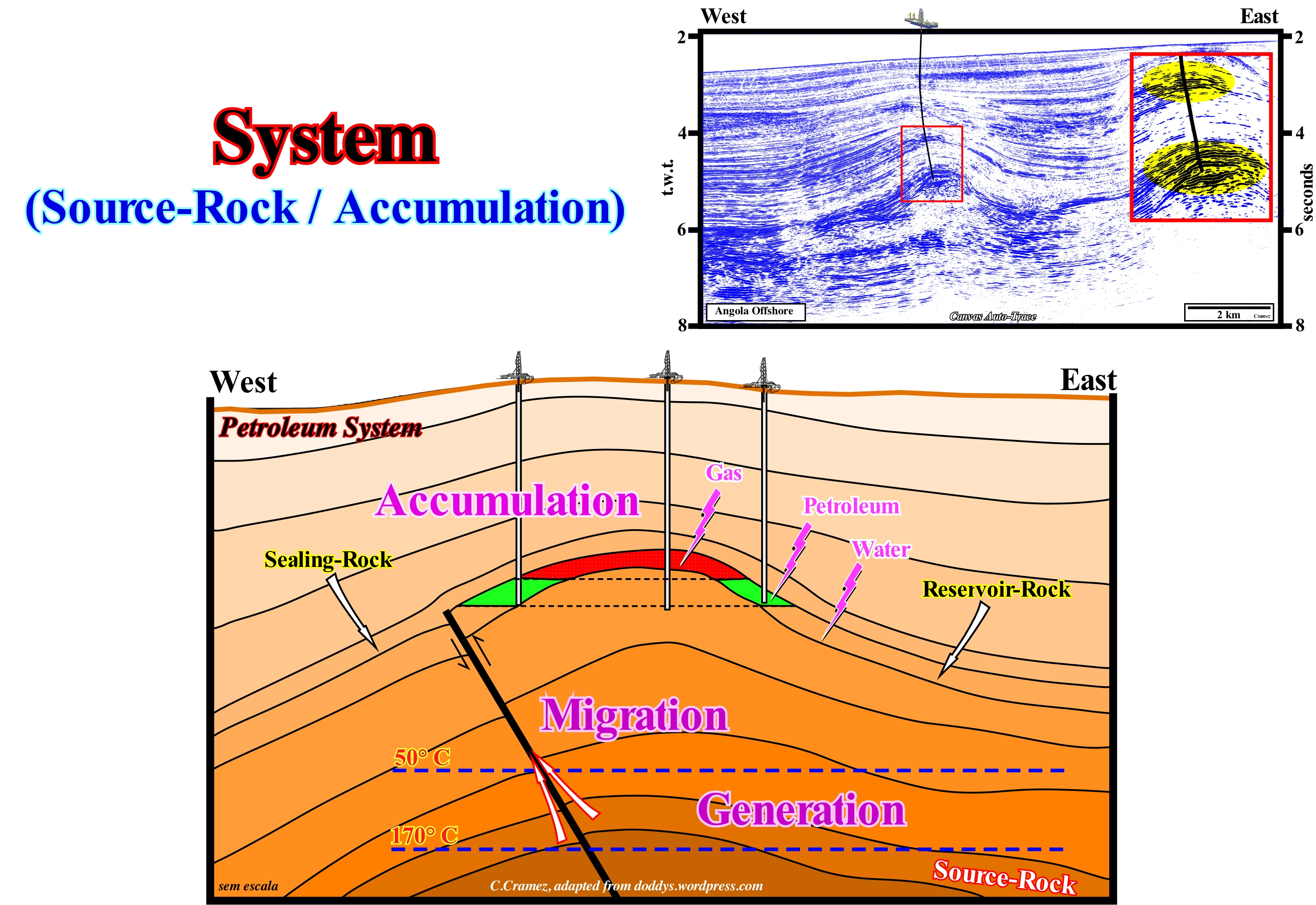 Many of the geoscientists using Sequential Stratigraphy use adopt an analytical or reductionist methodology, which is based, primarily, on the mechanical conception of nature and man (Descartes), that is to say, on the conception that everything and everyone can be divided into parts each time which can be analyzed and studied separately. They follow the old Cartesian analytic paradigm with which western science has progressed greatly: "The Whole is equal to the sum of the Parts." Some geoscientists still believe that in certain complex geological systems, such as tectonics, paleontology, stratigraphy, etc., the behaviour of the "Whole" can be understood from the study of the "Parts". They think it is possible to understand (not to be confused with describing) the filling of a sedimentary basin by making only analytical studies of sedimentary intervals (whether they are continental encroachment cycles, continental encroachment sub-cycles or sequence-cycles). They work by induction and try to progress from the particular to the general, that is, from the "Parts" to the "Whole," rejecting the hypothesis that "Theory precedes Observation" (K. Popper). However, the vast majority of geoscientists know that the great scientific shock of the last century was the introduction of systems, which can not be understood by analysis. In a systemic approach the fundamental concepts are: (i) Entropy (every system undergoes more or less important deterioration) ; (ii) Syntropy, also called Negentropy or Negative Entropy (for the system to continue to exist, it has to develop opposing forces to entropy ; (iii) Homeostasis (ability of the system to maintain equilibrium) ; (iv) Heterosexuals (since there is improper action or wear of the system, it tends to balance). The holistic or contextual method (or systemic method) and the global way of thinking, which implies that the properties of the Parts of a Whole are not intrinsic and that the "whole" "Is more than the sum of the" Parties ", are undoubtedly finding a growing acceptance in the scientific community. In petroleum geology, for example, the petroleum system, which is a genetic relationship between a source-rock and an accumulation of hydrocarbons. An oil system ("Whole"), as illustrated above, consists of several sub-systems: (i) Generating Subsystem ; (ii) Trapping / Migration subsystem* ; (iii) Preservation-Subsystem (encompasses changes in accumulations during the preservation period, such as re-migrations, physical and biological degradations or complete destruction of hydrocarbons), etc. However, the petroleum system is much more than a simple addition of the generating, trap/migration and other subsystems. In a sedimentary basin if there is one of such subsystem, the presence of an petroleum system is impossible. In petroleum exploration, it is not worth starting to spend money on seismic if, for instance, geoscientists did not recognize in the stratigraphic column of the basin, one or more, sedimentary intervals rich in organic matter, i.e., one or several potential source-rocks, which may form the generating subsystems if they are or have been sufficiently buried. The probability of finding a petroleum system (i.e., the "Whole"), that it be (i) Known (!) ; (ii) Hypothetical (.) or (iii) Speculative (?) is the product of the probability of presence of the petroleum parameters (i.e. the "Parts"), mainly of the source-rock, reservoir-rock, migration (age of migration in relation to the age of the trap) and preservation. If the probability of presence of one of these parameters is zero, the probability of presence of the petroleum system will be zero. A petroleum system is Known (!) when, on the basis of geochemical information, a positive correlation is defined between a source-rock and the petroleum found. A petroleum system is Hypothetical (.) when a source-rock has been identified, but there is no information, in particular, in geochemistry, to correlate such source-rock with the petroleum found. A petroleum systems is Speculative (?) when the presence of a source-rock or an oil field are defined by geological and geophysical evidence.