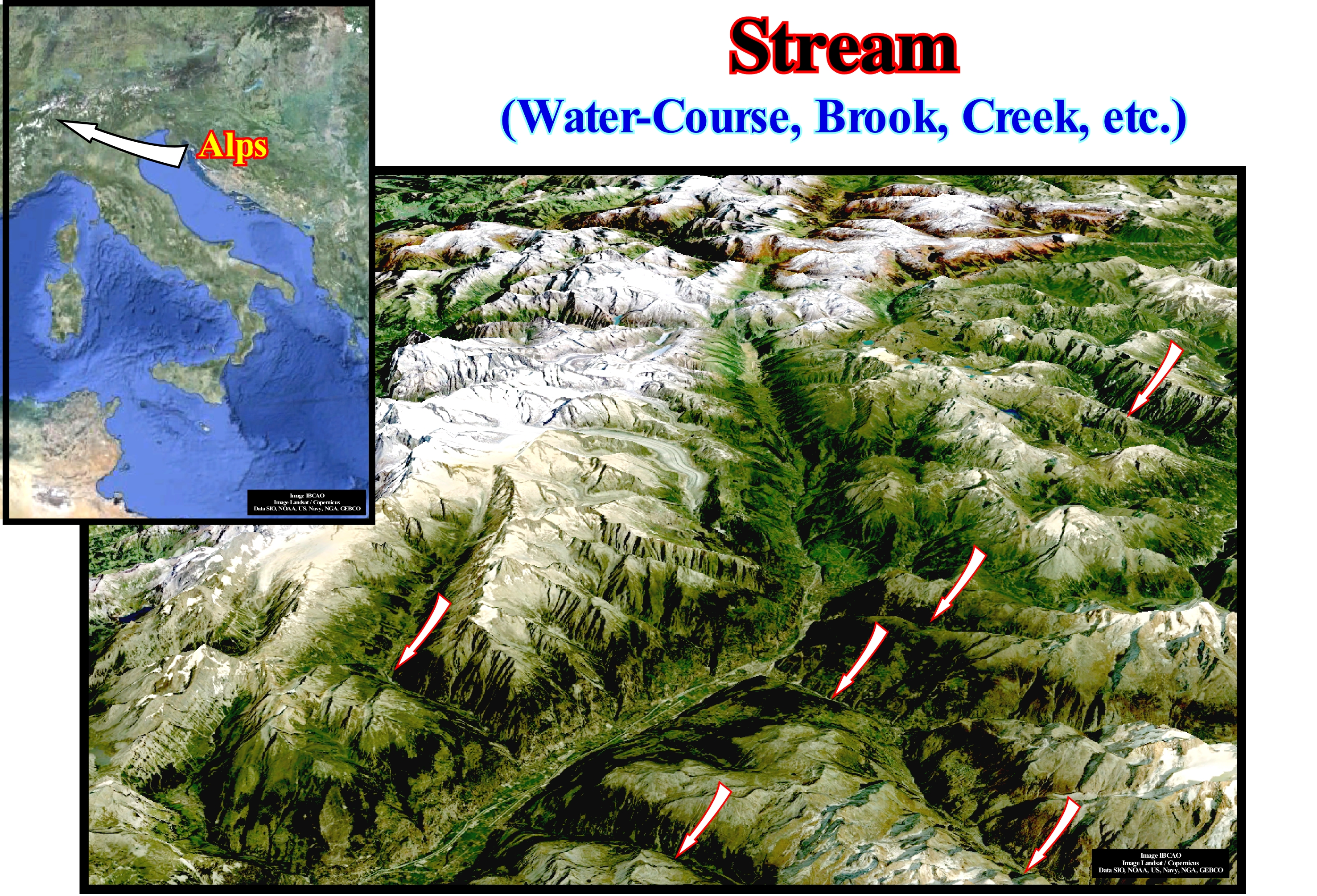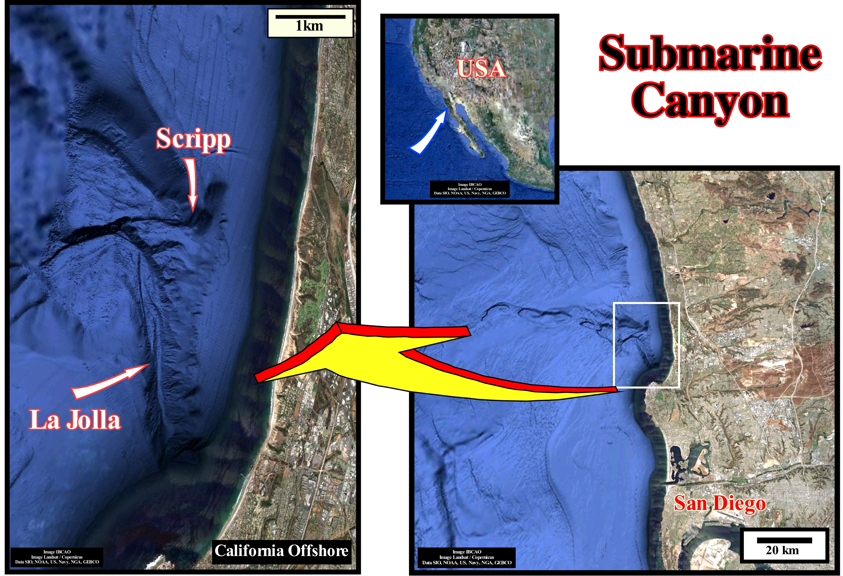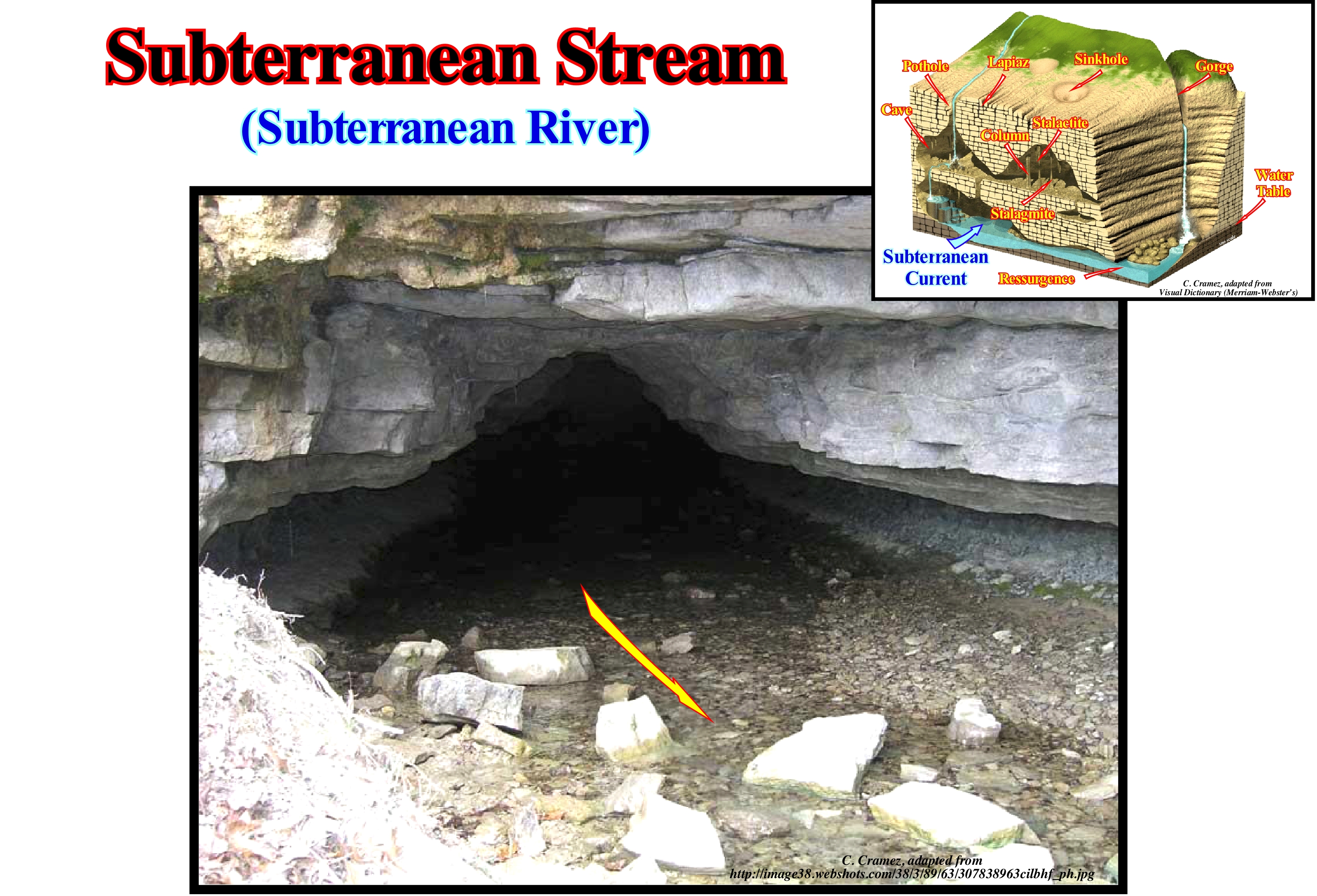 The photograph shown at the top right of this figure shows a sink that removes water from the river that overflows the main bed during the rainy season when the amount of water the river carries is greater than the volume of the bed. As can be seen, the bed of the river, like the swallow hollow, is carved in calcareous rocks where the phenomena of dissolution and chemical erosion are very abundant. Most of the time the water that flows on the surface may disappear altogether in a swallow hollow, as illustrated in the diagram of this figure, and often it disappears into several swallow hollows, which certain geoscientists also call the entrance, after a subterranean path, more or less, complicated to resurge or exit, in a topographically lower area, as illustrated above. However, sometimes water disappears in a sinkhole without its resurgence point being exposed, as if it were lost in a deep towel or directly on the sea bed. Between the point of entry and the exit point, the course of the underground stream is entirely independent of the layout of the ancient surface rivers. There is no submarine current under the canyons (subaerial or submarine). The directions of the submarine currents sometimes cut off those of the missing subaerial currents. The underground passage is made by wells and galleries, whose sections differ according to which the stream flows freely, by gravity with interposition of air to the normal pressure between the water and the vault of the galleries, or overpressure in what the speleologists call wet vaults. In the first case, the sections of the galleries are very variable and the rooms with stalactites are very frequent. In the second case, the profile of the galleries is, more or less, elliptical, since it is modelled by dissolution. These galleries, where water circulates overpressure may present against slopes and siphons which sometimes create intermittent resurgence.