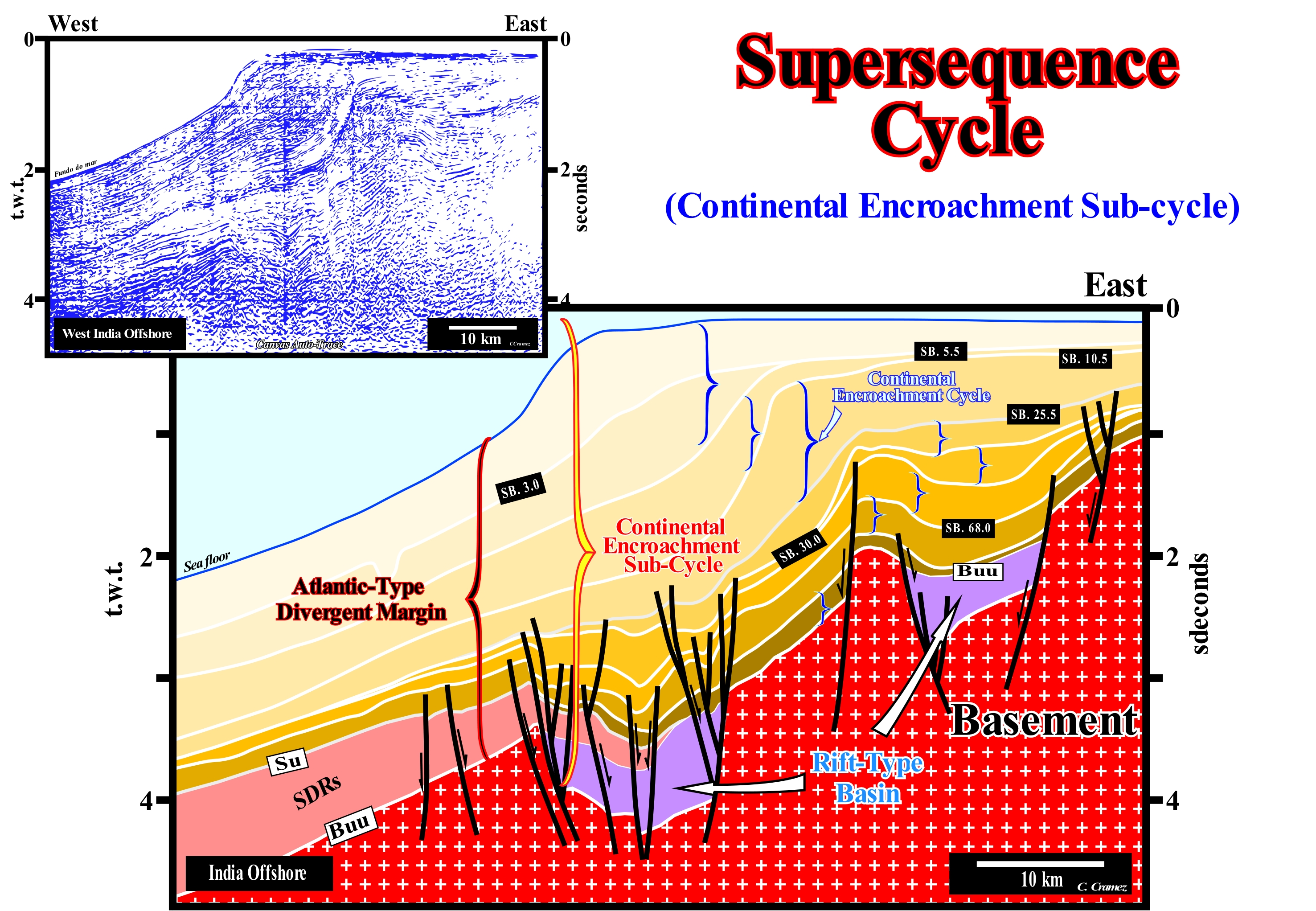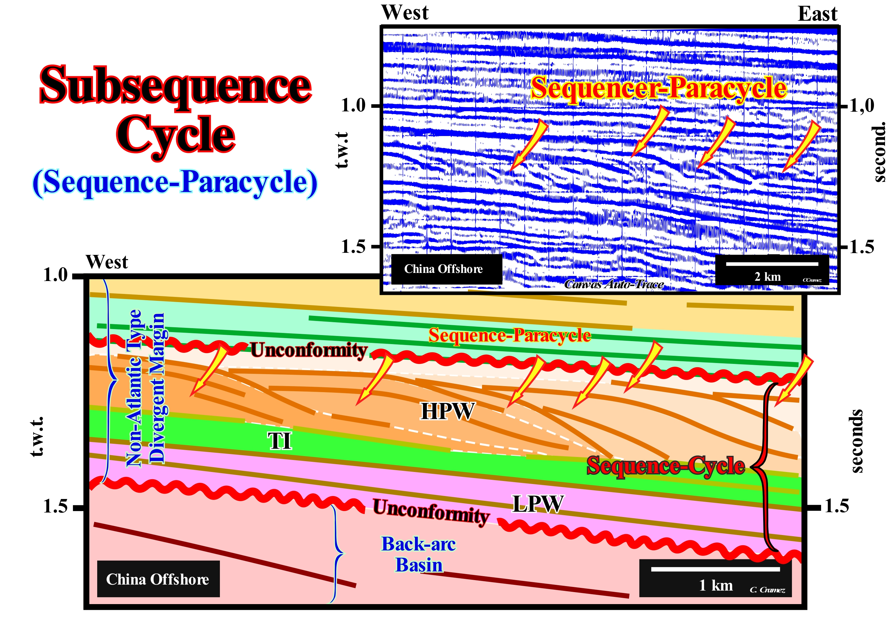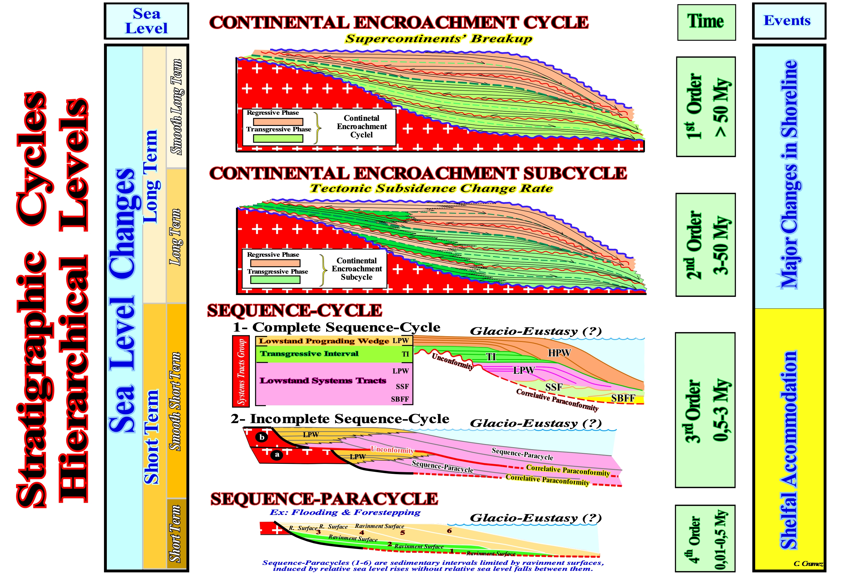 One of the basic principles of sequential stratigraphy is the conjecture that stratigraphic cycles are induced, primarily, by eustasy (changes of the absolute or eustatic sea level, i.e., from the supposed global sea level referenced to a fixed point, which is, in general, is the Earth's centre, The absolute sea level is dependent on (i) Tectono-Eustasy (controlled by the volume variation of the ocean basins) ; (ii) Glacio-Eustasy (controlled by the variation of ocean water volume, mainly associated with the amount of ice) ; (iii) Geoidal-Eustasy (controlled by the distribution of ocean water caused by variations in the terrestrial gravity field) and (iv) Thermal expansion of the oceans or steric sea level rise (if the temperature of the oceans increases, the density of the water decreases and for a constant mass the volume increases.) Eustasy is the main factor responsible for cyclicity and an important factor in the creation of available space for sediments (accommodation). As far as cyclicity is concerned, since B. de Maillet (around 1690) and Lavoisier (1789) until today, almost no geoscientist has any doubts. With regard to the amplitude of space created during a relative sea level rise, it depends, fundamentally, on subsidence and/or uplift of the sea floor, since, relative sea level is the result of the combined action of absolute (eustatic) sea level and tectonics. The hierarchy of stratigraphic cycles depends on the order of the eustatic cycles, which induced them. In general, in seismic stratigraphy, made from seismic data (taking into account the seismic resolution), three main stratigraphic cycles are considered, which are deposited during 1st, 2nd and 3rd order eustatic cycles, that is, cycles eustatic cycles with time-durations, respectively, greater than 50 My (1st order), between 50 and 3-5 My (2nd order), between 3-5 and 0.5 My (3rd order*): (i) Continental Encroachment Cycle ; (ii) Continental Encroachment Subcycle; (iii) Sequence-Cycle and High Frequency Cycles **. The sequence-paracycles that form a sequence-cycle are not cycles. There is no relative sea level fall between them. They are bounded by flooding surfaces. Continental encroachment cycles are associated with the break-up of supercontinents (Protopangea or Rodhinia and Pangea supercontinent, for instance), as it is the case of the two Paleozoic continental encroachment cycles of the Phanerozoic. Continental encroachments subcycles are associated with changes in velocity of tectonic subsidence (sediment thickness plus water-depth decreased by the isostatic compensation effect, due to sedimentary overload, and increased compaction effect). Sequence-cycles are associated with relative sea level changes, in which glacio-eustasy plays an important role. In fact, the imprisonment of water in the glacial caps and glacier during glaciations decreases the volume of water in the oceans, which creates a significant absolute (eustatic) sea level fall and causes a displacement of the shoreline seaward (marine regression). On the contrary, the melting of the ice caps and glaciers, during the thaw, creates an absolute sea level rise with a consequent water encroachment over the continents, creating a marine ingression or marine transgression. The sequence-paracycles are, also, associated with glacio-eustasy. Sequence-cycles are the building blocks of sequential stratigraphy. It is from the study of the sequence-cycles, which are composed of different groups and subgroups sedimentary systems tracts, that lithological predictions can be advanced. The terminology here presented is less misleading than the, initially, proposed by the Exxon geoscientists (Megasequence, Supersequence, Sequence and Parasequence), since it takes into account two basic characteristics of Geology: (i) All geological interpretation is scale dependent and (ii) In a hierarchy the criteria of discernment must be constant. On a seismic line the differentiation between a deltaic and continental slope is only possible if the seismic line has a vertical scale (time or depth) and a horizontal scale (metric). It is for this reason, that for a time, many geoscientists working in oil companies (the first to use sequential stratigraphy) interpreted Exxon's megasequences as "mega" sequence-cycles consisting of "mega" sedimentary systems tracts, which is totally wrong, and that led some of them to predict "mega" turbidites, which the exploration wells, totally, refuted.