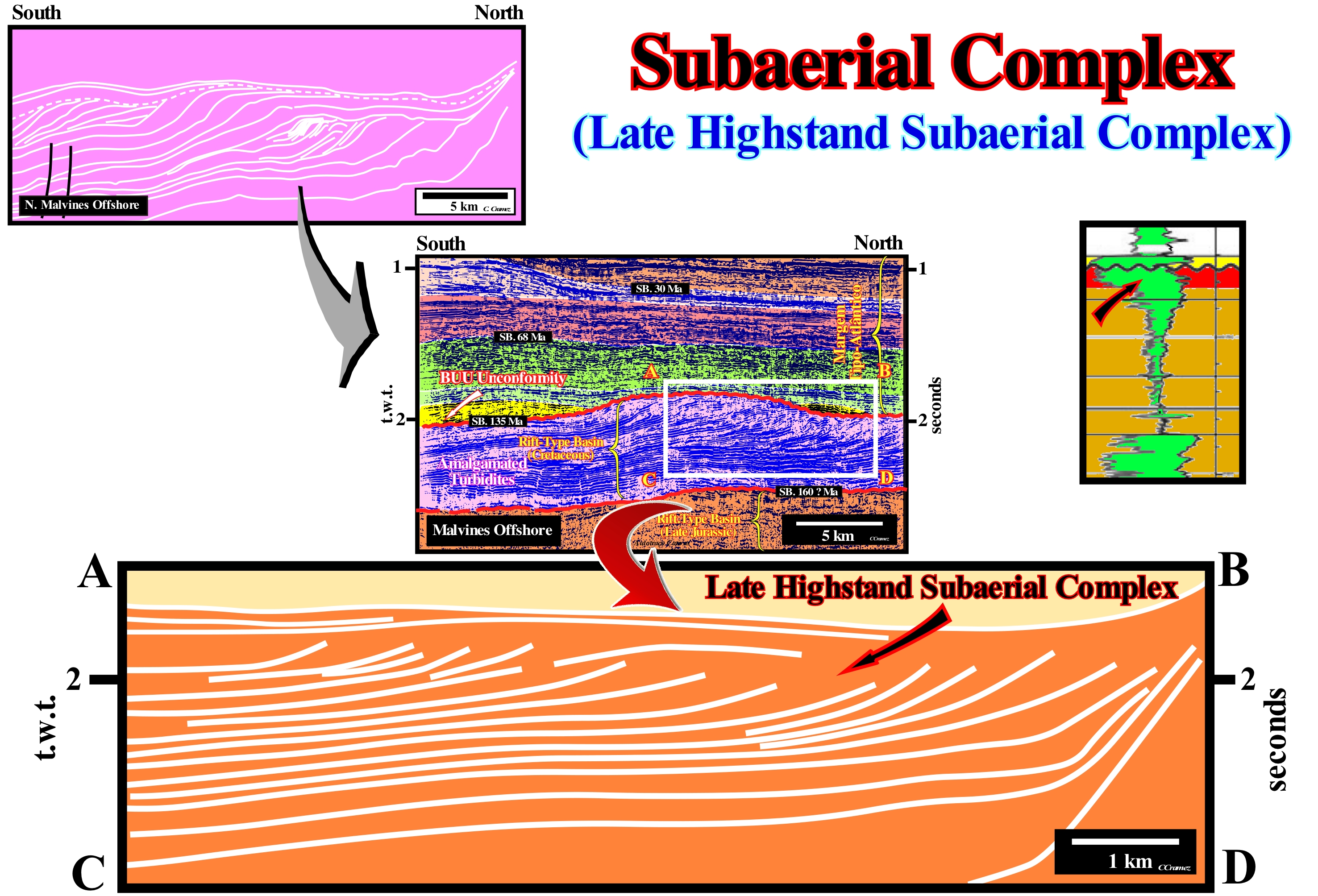 As a function of the geological context, this group of sedimentary systems tracts is presented in three different configurations associated to geological settings, where the passage coastal plain / basin is made: (i) By a well-marked continental slope ; (ii) By a growth fault and (iii) By a gradual dipping ramp. In general, the lowstand systems tracts group consists of three sub-groups: (i) Submarine basin floor fans (SBFF) ; (ii) Submarine slope fans (SSF) ; (iii) Lowstand prograding wedge (LPW) and, locally, incised valley fillings (Ivf). In a ramp context, the lowstand systems tracts are, generally, composed just by (a) lower lowstand prograding wedge , (b) upper lowstand prograding wedge and locally, incised valley fillings.