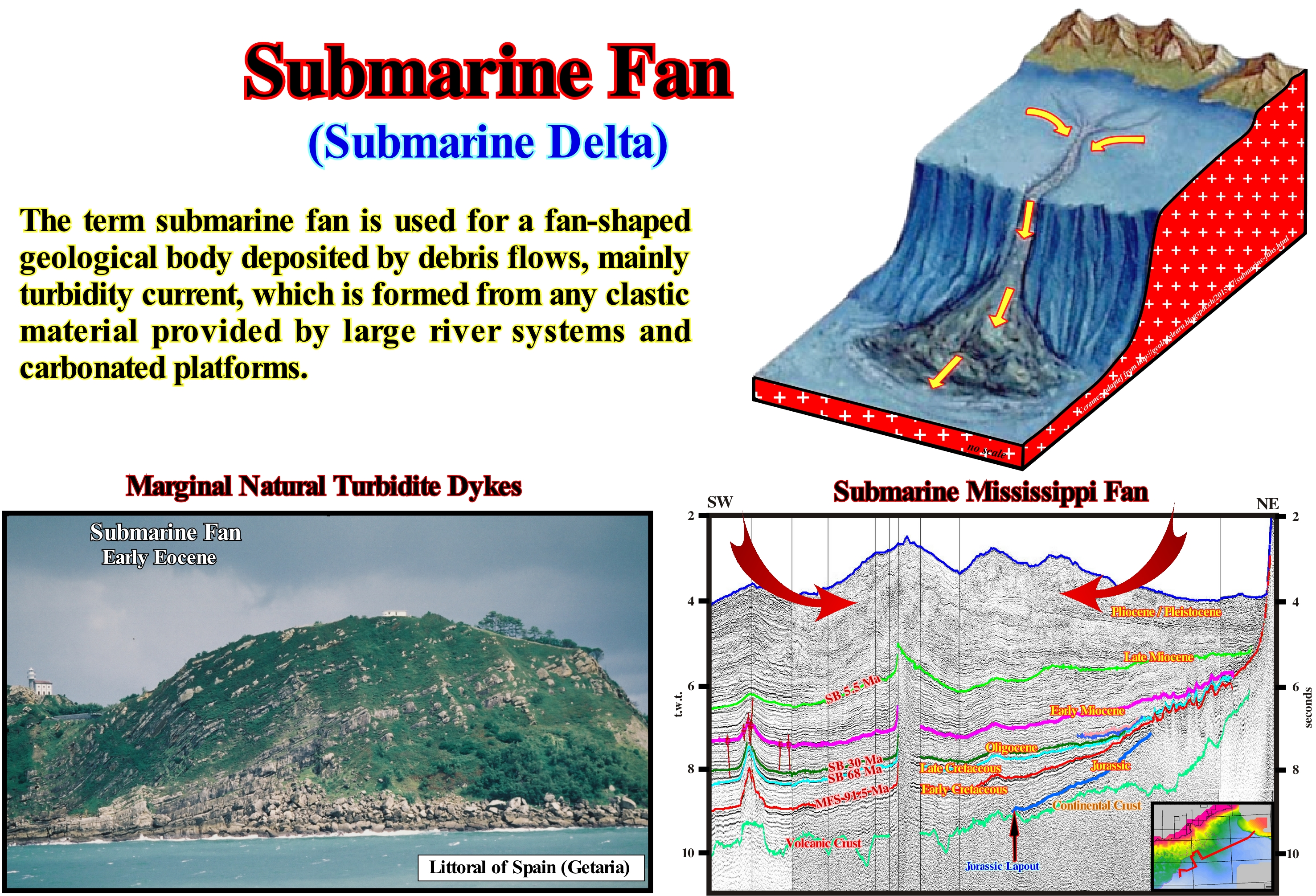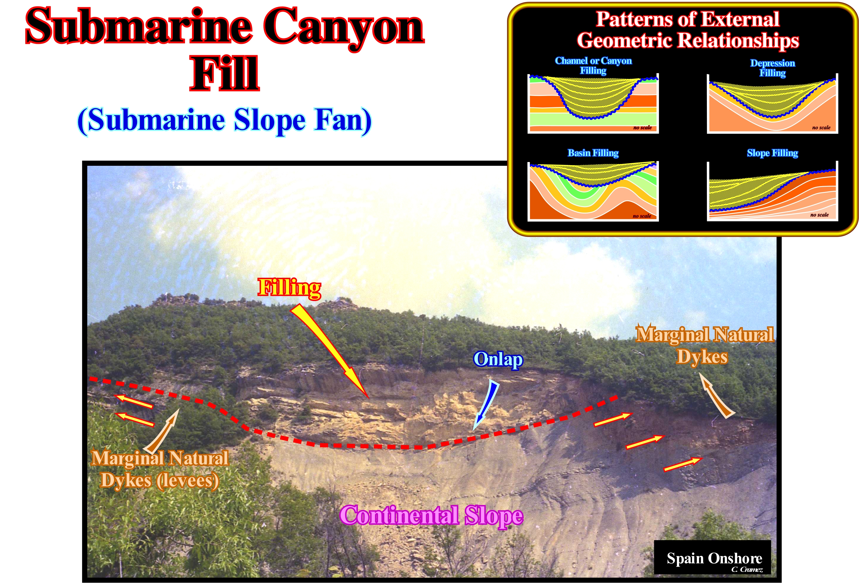 These submarine fans are deposited when the relative sea level falls faster than the subsidence of the basin edge. The relative sea level fall produces a total exhumation of the coastal plain and the formation of incised valleys and submarine canyons, which direct the sediments basinward where they deposit in the form of submarine fans.3.2- Submarine Slope Fans (SSF)