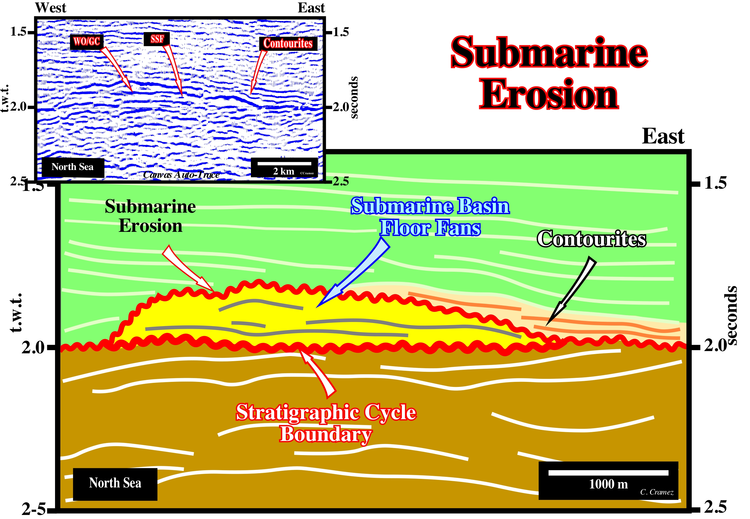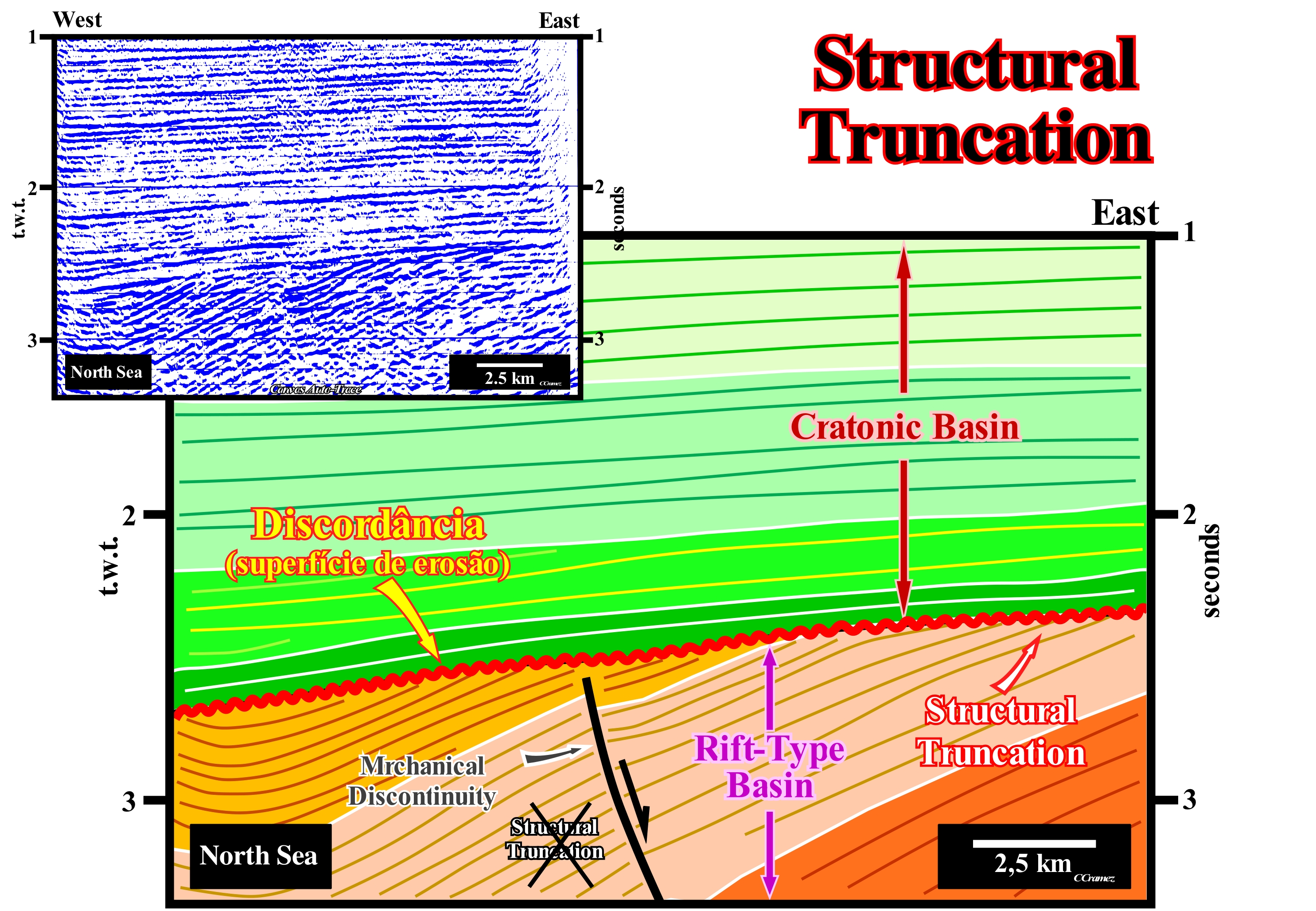 (*) Unconformity that is not, at least locally, tectonically enhanced and difficult to recognize. This type of unconformity is very frequent in basins where extensional tectonic regimes are predominant. This is particularly true continentward of the basin edge and in deep-water. The unconformities are cryptic, since the erosion that characterizes them is difficult to put into evidence. Continentward of basin edge, just the fills of the incised valleys underline, clearly, the erosional surface, which accompanies the relative sea level fall. Seaward of the basin edge, fillings of submarine canyons and valleys allow the identification of the limits of the stratigraphic cycles, that is, the unconformities and their correlative paraconformities.