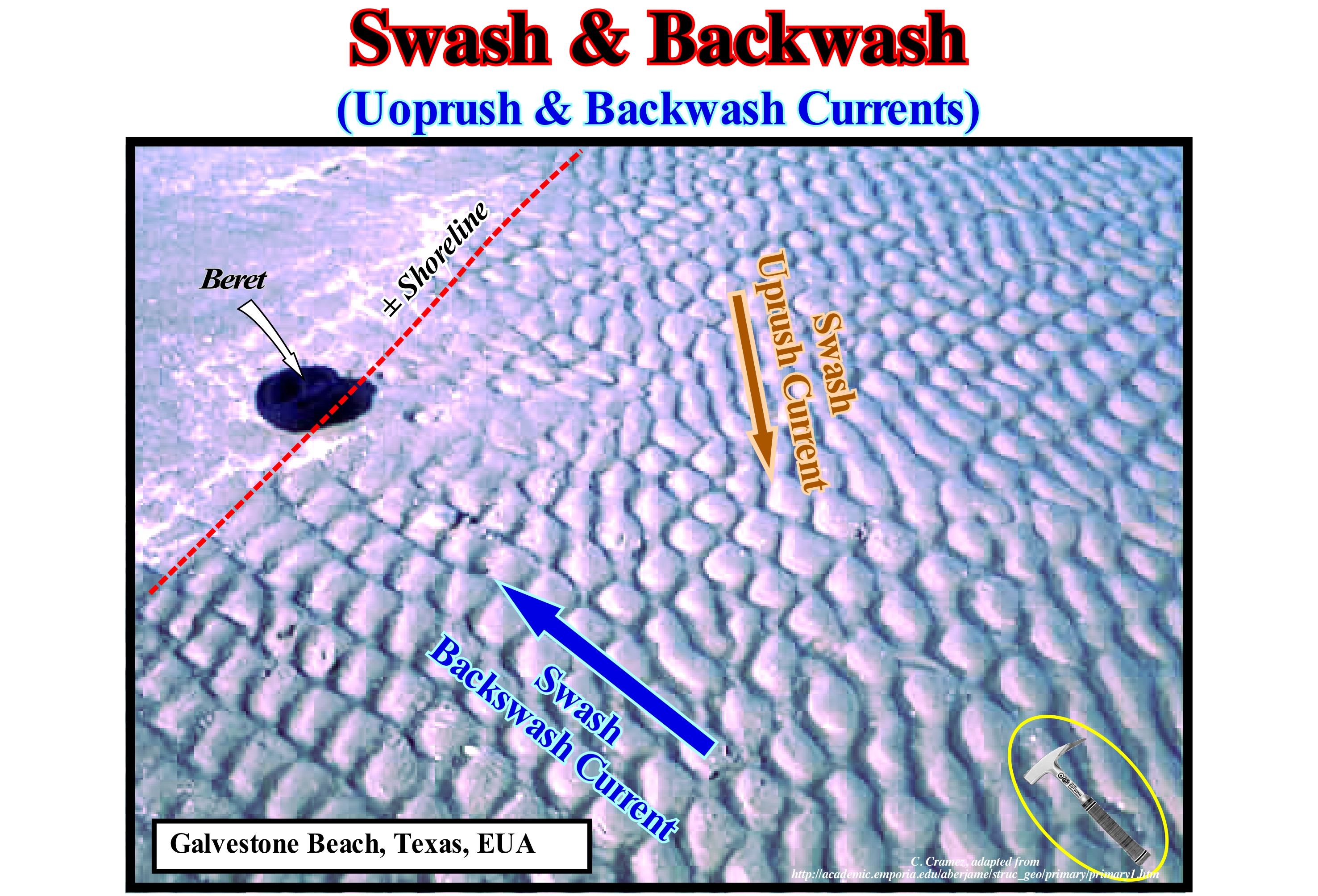 This photograph gives an instantaneous position of the shoreline (dry-wet limit) in the swash zone. On the other hand, as shown in the diagram (top left of this figure), the swash zone is limited upstream by the uprush limit and, downstream, by the backwash limit. The swash area, which is also called the swash strip, is the beach region, alternately, covered by the uprush and backwash currents of inflow induced by wave breaking (surfing). The uprush current is the swash current, which is directed towards the coast, after the surfing of the waves. The backwash current is the swash current, which is directed seaward. The first one advances to the beach, perpendicularly, to the direction of the waves, while the second (backwash), which results from the inversion of the uprush, due to the loss of energy caused by the inclination and attrition of the sea floor, follows the slope of the sea-bottom. As the direction of the sea-waves is not always parallel to the shoreline, the swash currents (uprush and backwash) may follow different trajectories. The swash zone is a highly dynamic environment in which currents have flow velocities often exceeding 2 m/s. In the swash zone, a large amount of sediment is transported from coast to coast and downstream, and the difference between upstream and downstream transport determines whether the beach is eroded or whether, on the contrary, it progrades seaward. It is in the swash zone that the erosion of the shoreline is more evident. The morphology of a beach is determined by the complicated interactions between waves, currents, sedimentary transport and by its own morphology. Many hypotheses and models based on diverse concepts of the forces and interactions in question have been proposed to explain the morphology of beaches. Do not confuse the swash area, which is the swash band, with the swash that is the intertidal band, that is, space between the highest and lowest tide levels.