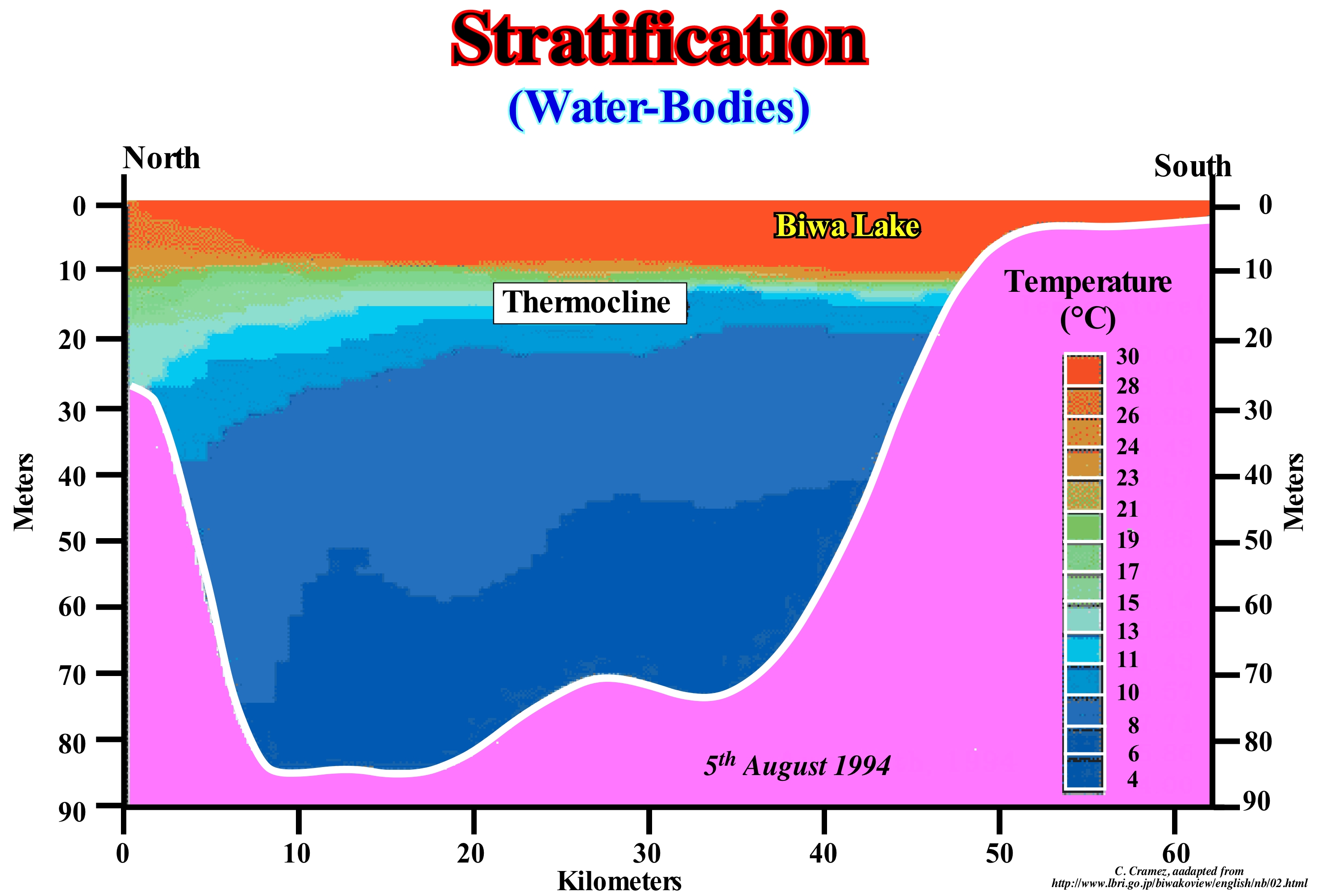Within a water column, the mixing layer is characterized from top to bottom by poor gradients of water characteristics, which may increase, sharply, downward, so that the values of these characteristics are linked to those of the deep-waters. The transition zones are designated according to the characteristics considered by terms using the suffix "cline". Thus we can speak of pycnocline (density), halocline (salinity), thermocline (temperature), oxycline (oxygen), etc. Water stratification occurs when water with high and low salinity (halocline), or hot and cold water (thermocline) form layers that act as barriers to miscibility of the water (miscible, i.e., that can be mixed). The thermocline corresponds to a sudden change in temperature at a given depth of a water-body. In low and middle latitudes, under the surface layer of the sea, there is a layer with maximum decrease of temperature per unit of depth, that is called thermocline. In high latitude regions such as the polar regions the sea does not have any thermal, cold stratification, which allows easy mixing between surface water and deep-water. In oceanography, halocline is a interval of water column in which the salinity of water changes rapidly with depth. It designates a strong vertical gradient of salinity. It may be permanent, such as occurs at the mouth of a river, or transient, such as occurs after a heavy rain at sea. As salinity affects the density of sea-water, it exerts, for instance, an important role in the vertical stratification of water. An increase in salinity of 1 kg/m3 creates an increase in density of about 0,7 kg/m. In areas of medium latitude, when there is an excess of evaporation, in relation to precipitation, the surface water becomes saltier than deep-water. In these regions, vertical stratification is mainly driven by the difference in temperature between hotter surface waters and cooler deep-waters. The process of formation of dense waters is mainly linked to the reduction of temperature or increase of salinity due to the formation of ice, generally, thermohaline currents originate in high latitudes. These cold, dense waters sink and slowly flow towards the equator. Turbiditic currents are subaquatic and turbulent density currents in which the density difference is caused by suspended sedimentary particles as they transport the grains in a solution composed of water and dispersed sedimentary particles, which are kept in suspension due to turbulence. The thermocline is a relatively thin, but very characteristic horizon of the oceans, lakes or even the atmosphere, where the temperature changes much more rapidly, in depth, than what happens in the overlying and underlying horizons. In the ocean, the thermocline separates the upper horizons, where the water is very mixed and agitated, from the deep lower horizons, where the water is almost at rest. The halocline circulation refers to the global ocean circulation induced by differences in the salinity of ocean waters**. Depending on the seasons, latitude and turbulence created by the winds, the thermocline can be semi-permanent or change a lot of thickness and depth. Thermocline has a great importance in the distribution of aquatic organisms, it acts as a barrier to them, since changes in water temperature imply changes in density, viscosity, pressure, solubility and oxygen, which in turn can influence the buoyancy, locomotion and respiration of organisms. This figure illustrates the thermal stratification of the water of Biwa Lake in Japan. In summer, the gradient (rate of change of a physical quantity as a function of distance or time) changes very, sharply, between hot, surface water, and the underlying cold water. The barrier between these two levels, i.e., the thermocline, corresponds in this example to a (light blue) horizon, whose thickness is about 10 meters, and whose depth is 15 meters in the southern part of the lake and about 30 meters in the North. In this lake, in addition to the surface waves, which are often as high as the sea waves, the thermocline propagates like a great wave across the lake.