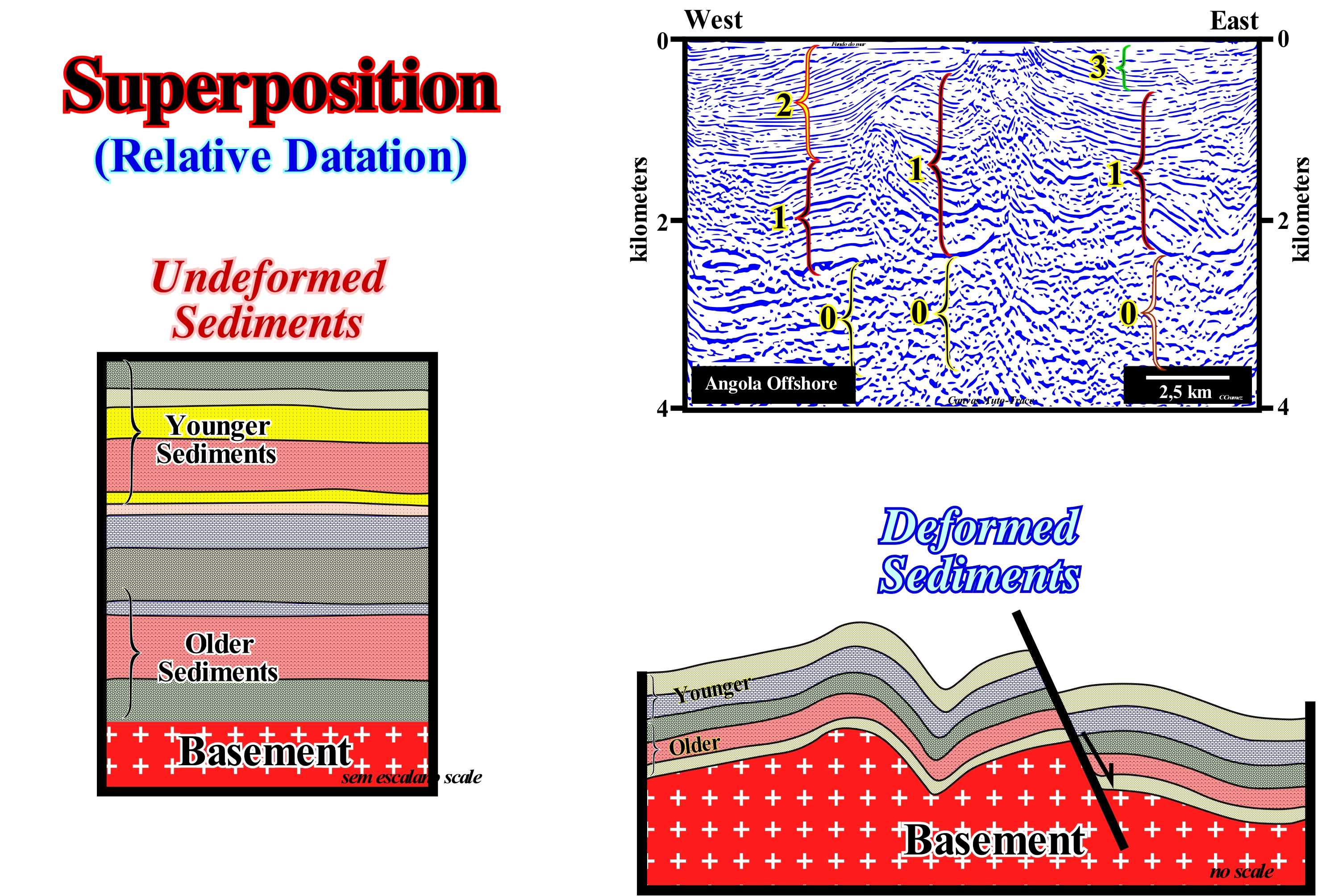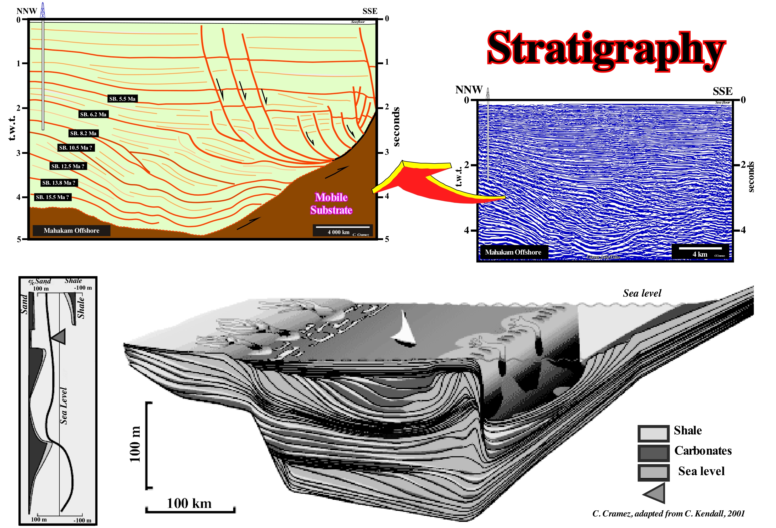 In addition to the main objectives of the stratigraphy: (i) To determine the relative age of rocks relative to each other and from their fossils ; (ii) Determine the environments in which the rocks formed, using their physical and chemical characteristics and their fossils ; (iii) To correlate the layers of rocks that occur in different regions or even in different continents, in the petroleum exploration, it also allows: (a) Determine potential source-rocks, that is, rocks rich in organic matter, that when buried, can generate hydrocarbons ; (b) Determine the most likely reservoir-rocks, that is, rocks with a porosity and permeability that allow them to store hydrocarbons and, in that case, an eventual economic production and (c) Determine the sealing-rocks, which can close vertical (structural traps) or laterally the reservoir-rocks (nonstructural traps, whether morphological or morphological by juxtaposition*). The determination of potential source-rocks is easier in the genetic stratigraphy, in which the different sedimentary packages are limited by downlap surfaces, which means that the genetic stratigraphy divides the stratigraphic column into cycles of sedimentary transgresions-regression. Within a sequence-cycle, that is particularly true upstream of the continental edge (limit between the slope and the continental shelf), where the sequence-cycles are just constituted by the transgressive interval (increasingly important marine ingressions and increasingly smaller sedimentary regressions), and the highstand prograding wedge (increasingly smaller marine ingressions and increasingly important sedimentary regressions), since, globally, the lowstand systems tracts group (submarine basin floor and slope fans and lowstand prograding edge) are regressive (when submarine basin floor fans basin are not well developed). Potential marine source-rocks are, generally, associated with the interfaces between sedimentary transgressions (set of increasingly important marine ingressions or eustatic paracycles and increasingly smaller sedimentary regressions) and sedimentary regressions (set of increasingly smaller marine ingressions or relative sea level rises in deceleration and increasingly important sedimentary regressions), i.e., associated with downlap surfaces. A marine transgression is a sea level rise (relative or eustatic) that moves the shoreline continentward, with a small ravinment surface forming in the pre-existing topography, but without deposition. This means that a marine transgression increases or creates available space for the deposition, which occurs only during the stability period of relative sea level which occurs after marine ingression. The relative sea level is a local sea level referenced to base of the sediments (top of the continental crust) or to the sea floor, which is the result of the combined action of the tectonics (subsidence or uplift of the sea floor) and absolute (eustatic) sea level, which is supposed to be global and referenced to the Earth's centre. The reservoir-rocks are more easily determined in sequential stratigraphy, which subdivides the stratigraphic column into discrete sedimentary packages, that is, by erosional surfaces induced by significant relative sea level falls. All potential reservoir-rocks, whether deposited in low or highstand geological conditions, are onlapping against unconformities, either by marine onlaps (for the reservoir-rocks associated with the submarine basin floor or slope fans) or by coastal onlaps (for reservoir-rocks of the lowstans prograding wedge, transgressive interval and highstand prograding wedge). The location of the sealing-rocks is more difficult since it requires a stratigraphic analysis at the hierarchical level of the sequence-paracycles, which are deposited during the stability period of relative sea level that occurs after each eustatic paracycle or, in other words, after each increment of relative sea level rise, that form the different subgroups of sedimentary systems tracts of a sequence-cycle. During a relative sea level rise there may be several marine ingressions, but between them there is no relative sea level fall.