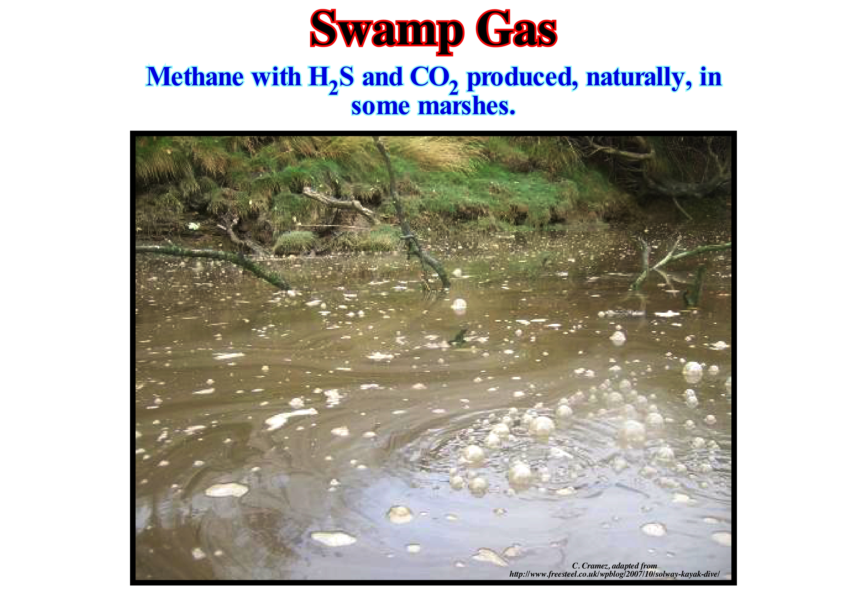 One of the first geoscientists to say that swamp gas ("ignis fatuus" fire of the idiots) was inflammable was Corliss, WR (1832): "Swamp water is ferroginous and covered with an iridescent crust. As I suspected there was some connection between these flames and the air bubbles, I located during the day the place where the bubbles were more abundant, and I visited the during I was very great when I observed the flames and I did not hesitate to approach them, but when they approached they disappeared, and all the attempts I took to observe them were ineffective, and on another day, at twilight , I returned to the place and waited for the fall of the night. The flames became little by little visible, but redder than before, which shows that the gas burned all day. Convinced that they would return again, when the agitation donate I stood, still and motionless, and I saw that they began to appear little by little. How I could reach them I tried to burn them to a piece of paper, but because of my breathing I could not. So I put a handkerchief between the front of my face and saw that the paper became, little by little, brown and covered with a viscous liquid. Then I used a strip of paper and had the pleasure of seeing him burn. The gas was obviously flammable, not phosphorescent, as some claimed ". In this figure, the gas bubbles that rise to the surface of the swamp are probably methane, as they ignite as a burning match approaches and burns (as in the case described by Corliss) This gas results from the decomposition of the organic matter at the bottom of the marsh, where there is no oxygen or very little, which allows the development of anaerobic bacteria, i.e. bacteria that do not tolerate oxygen and high concentrations of sulfate. Although the vast majority of geoscientists think that swamp gas results from the disintegration of fats, cellulose and proteins by anaerobic bacteria, others dispute this origin, which means that the origin of the swamp gas origin is subject to controversy.