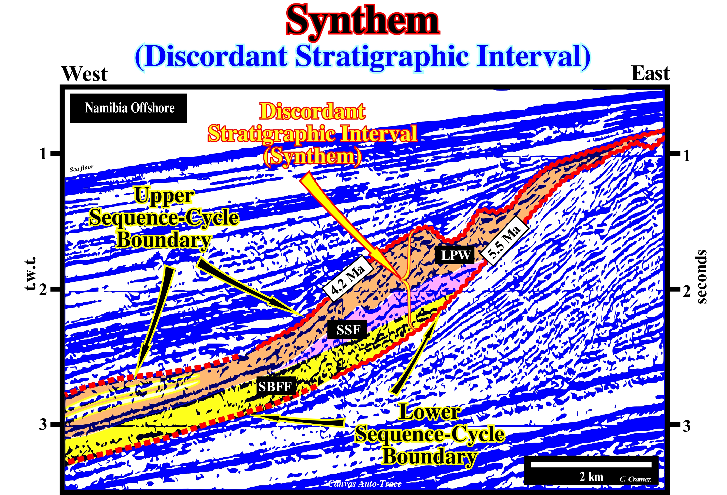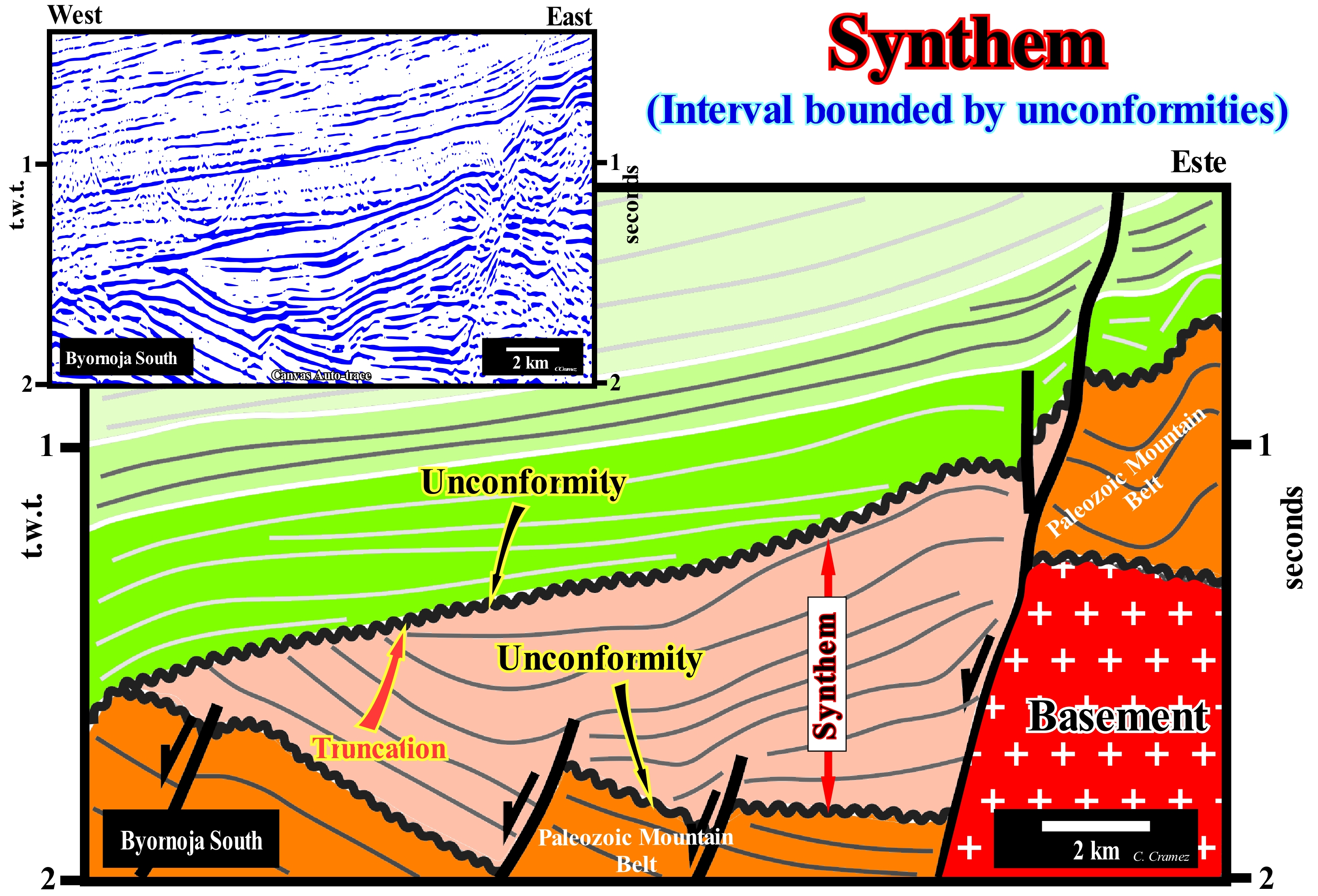 In sequential stratigraphy, the stratigraphic boundaries that interest us most are the boundaries between the stratigraphic cycles, that is, the unconformities (erosional surfaces) created by significant relative sea level falls, which has nothing to do with the five types suggested by the International Stratigraphic Guide (ISI, 1980), where the prefixes holo-, para-, lento-, no- and hypo- are used to designate certain characteristics of the units or a stratigraphic boundary, but, in fact, any geoscientist use them. We only consider the unconformities and the downlap surfaces. On this tentative geological interpretation of a Canvas auto-trace of a detail of a seismic line shot in Algeria onshore , from bottom to top, different sedimentary intervals, limited by unconformities, can be recognized: (i) The Basement, that corresponds to a Precambrian substrate ; (ii) A Cambrian / Ordovician interval, with a, more or less, parallel internal configuration, which rests in discordance on the Precambrian basement and which was, deeply, eroded during the Late Ordovician glaciations (the filling of glacial valleys is evident) ; (iii) A Glacial interval (Glacial 1), almost concordant with the Cambrian/Ordovician complex, and, practically, with no internal reflectors ; (iv) Filling of the Glacial Valleys, created during the great phase of glacial erosion of the Late Ordovician (Glacial 2), whose internal configurations are sub-horizontal, probably related with the Silurian marine ingressions, with which are deposited sediments rich in organic matter (potential source- rocks) ; (v) A Late Silurian shaly interval with a parallel internal configuration, parallel with the filling of the underlying glacial valleys and (vi) Post-Silurian sediments, which have a parallel internal configuration. The erosional surfaces of glacial origin that delimit the glacial cycles appear, often, to be angular unconformities (cryptic unconformities tectonically enhanced), while the boundaries between the different marine intervals correspond to, more or less, cryptic * eustatic unconformities, induced by significant falls of the relative sea level. The relative sea level is a local sea level, referenced at any point on the Earth's surface, which can be the base of the sediments or the sea floor and which is the result of the combined action of absolute (eustatic) sea level (supposed global and referenced to the Earth's centre, and tectonics). The internal configuration of the glacial intervals is, practically, without reflections, whereas the marine intervals have a parallel internal configuration. The boundaries between these intervals are stratigraphic. They underline a hiatus, which when important, corresponds to an unconformity. Along a stratigraphic boundary the hiatus varies from place to place. The concept of bedding or stratification surface is totally dependent on the time scale and the rocks considered. Unconformities, in the deep parts of the basins, have a minimum hiatus that gives the age of unconformity (age of the relative sea level fall, which created the erosional surface that characterizes it and that in deep-water correlates with a paraconformity). The boundaries of a sequence-cycle correspond to erosional surfaces in the proximal part of the basin (coastal plain, platform and upper continental slope) and to their correlative paraconformities in deep-water). The age of an unconformity can just be, correctly, determined dating to the pelagic horizons that cover the turbiditic layers of the submarine basin floor fans. The Earth's climate history since 2.5 Ma was controlled by Milankovitch's planetary orbit variations, comprising alternating periods of glaciation and thawing with a dominant frequency of 41,000 years. Concurrently, eustatic sea level fluctuated from 70 to 130 meters, causing marine ingressions and rapid sediment regressions of the shoreline on all continental shelves of the world.