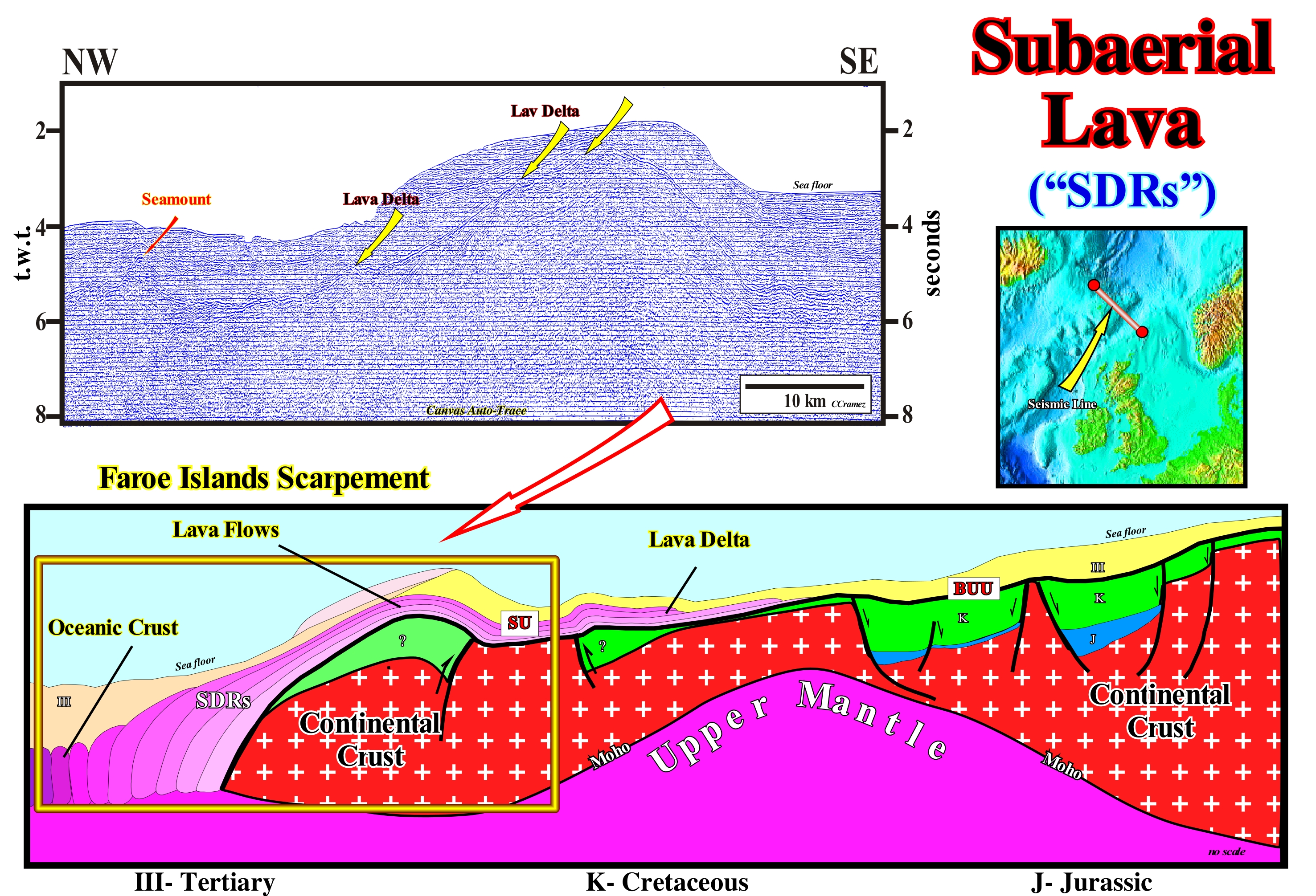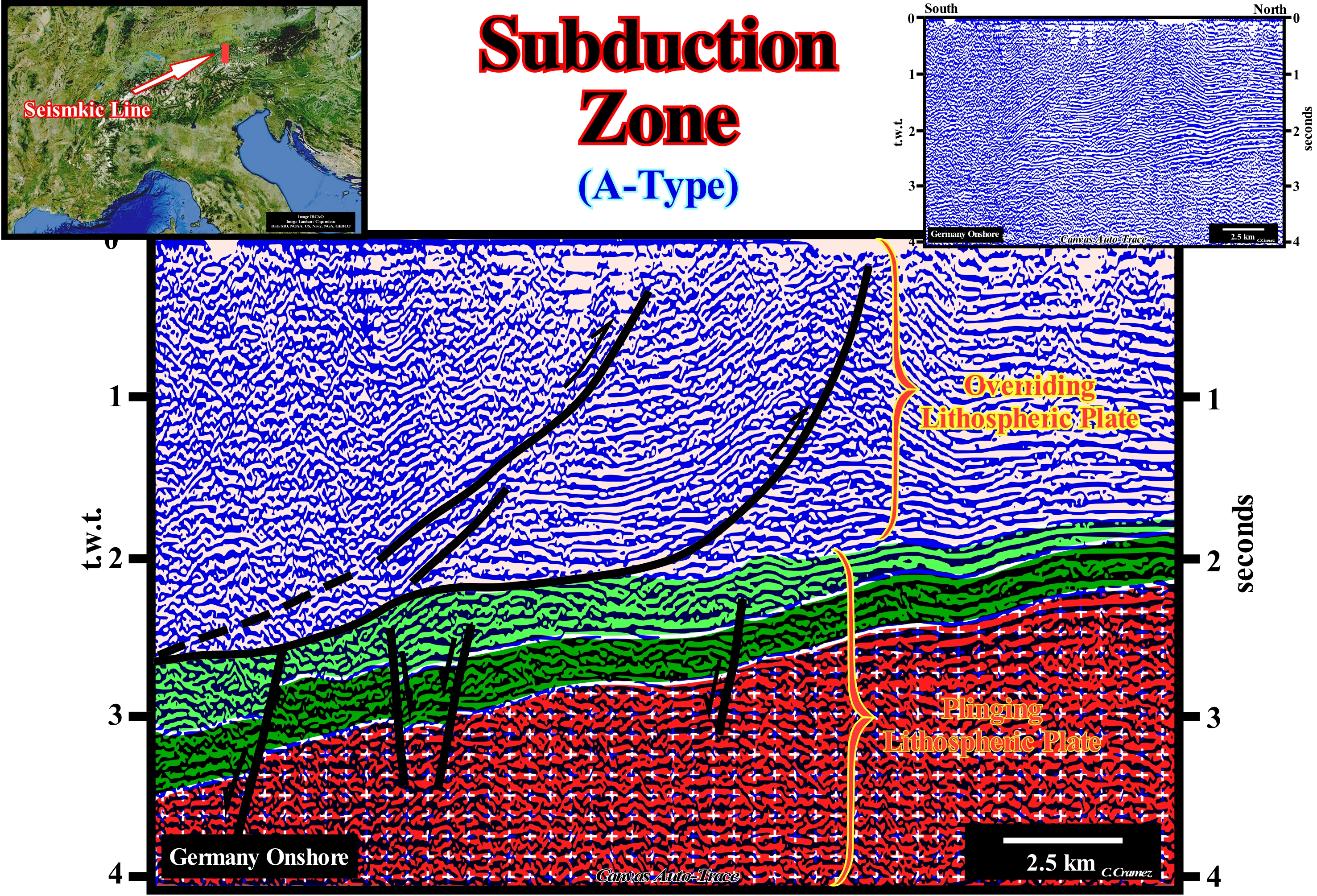 All types of terminations of the strata are illustrated in this sketch, in which a large number of depositional systems can be seen, which lie in the stratigraphic cycles called sequence-cycles, which are induced by eustatic cycles of 3rd order, whose time-duration varies between 0.5 and 3/5 My. In this particular geological sketch, two incomplete sequence-cycles are represented. They are separated by an unconformity, that is, by an erosional surface induced by a relative sea level* fall, which put the level of the sea lower than the basin edge (continental edge when the basin has a continental shelf or during the 2nd stage of development of the highstand prograding wedge, PNA, of a sequence-cycle). At the level of a sequence-cycle, in the deep part of the basin, the limit between the two sequence-cycles is made by a paraconformity that correlates, upstream, with the unconformity. In addition to the geometric relationships between the strata, the erosional surface limiting the sequence-cycle is also emphasized by the filling of an incised valley upstream of the last basin edge of the lower sequence-cycle and the filling of a submarine-canyon downstream. The lower sequence-cycle consists of the two groups of sedimentary systems tracts deposited under highstand geological conditions, that is, the transgressive interval (TI), green coloured, and the highstand prograding wedge ((HPA) coloured in orange. The transgressive interval (lower sub-group of highstand systems tracts group) has a retrogradational geometry, whereas highstand prograding wedge (HPW) has a progradational geometry. The retrogradational geometry of the transgressive interval (TI) is the result of the stacking of increasingly smaller smaller sedimentary regressions induced by increasingly important marine ingressions, while the progradational geometry of the highstand prograding wedge (HPW) is the result of overlapping , more or less, vertical of increasingly important sedimentary regressions induced by increasingly smaller marine ingressions. A downlap surface separates the transgressive interval (TI) from the highstand prograding wedge (HPW). The upper sequence cycle-consists of the lowstand systems tracts group (LSTG), coloured in blue, in which the three subgroups of sedimentary systems tracts that comprise it are recognized. From the bottom to top, they are: (i) Submarine Basin Floor Fans (SBFF) ; (ii) Submarine Slope Fans (SSF) and (iii) Lowstand Prograding Wedge (LPW), and by the lower highstand systems tracts sub-group, i.e., the transgressive interval (TI). The submarine basin floor fans (SBFF) have a rectangular morphology with abrupt boundaries between the different lobes. The submarine slope fans, which are formed by complexes of turbiditic natural marginal dikes (levees) and fills of the depressions between them, have an internal geometry, similar to the wings of a seagull in flight (the wings simulate the natural marginal dykes). The lowstand prograding wedge (LPW) has, of course, a progradational geometry, but most of the sequence-paracycles are spindle-shaped (sigmoid progradations) which creates an important aggradation, but largely inferior to the progradation. The terminations and shape of the reflectors define the geometric relations that can be interpreted as relations between strata. Several types of terminations (lapouts) can be considered within interval with two mainly configurations: (1) Convergent, set of seismic reflectors, interpreted as strata, that thin sideways towards the basin (can develop anywhere within a stratigraphic cycle, should not be confused with onlapping over unconformities) ; (2) Divergent, set of seismic reflectors, interpreted as strata, which thicken laterally, etc. In this figure, note the difference in scale between the photograph (strata on the Italy onshore) and the seismic reflectors of an auto-trace of an Australia offshore seismic line.