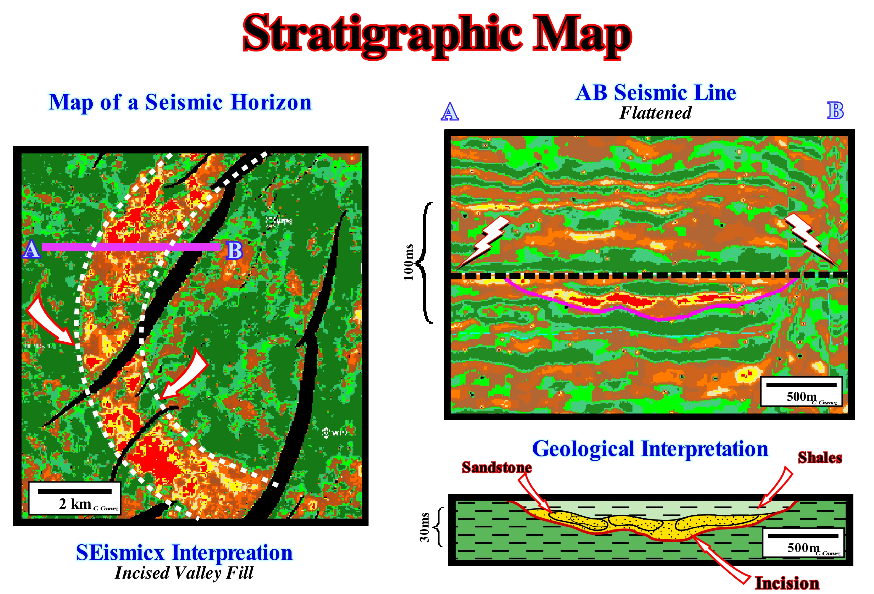 On this tentative geological interpretation of certain seismic data (3D) of a Thai oilfield, certain sedimentary attributes are illustrated. In the map on the left, is illustrated the map of the seismic amplitude along a given reflector (in fact, it is not the amplitudes of a reflector but rather the stacking of amplitudes of a time interval of, more or less, 100 milliseconds). This type of map corresponds, roughly, to a geological map (with a flat topography) and is interpreted in the same way. The problem is that at present-time, the vast majority of geoscientists, who work in the oil companies, can not read a geological maps. In this example, a number of normal faults and the filling of an old channel are, easily, recognized. Regionally, this filling corresponds to an incised valley fill, which a water-course was forced to incise since the provisional equilibrium profile of the water-courses were broken by a significant relative sea level fall. Indeed, a relative sea level fall may displace several kilometers seaward the shoreline and, thus, the mouth of the rivers. Since the relative sea level (eustasy plus tectonics) begins to rise, the incised valley is filled during the final deposition of the lowstand prograding wedge (LPW), that is to say, immediately before relative sea level floods the plain coast and, once again, displaced the mouth of the rivers continentward. The geometry of the incised valley fill is, perfectly, visible on the seismic line (right at the top). On this line (flattened in relation to the first flooding surface of the transgressive interval), the base of the incision is underlined by a continuous line (in red) and the first flooding surface by a dashed line. The sandy fill (reservoir-rock of the oil field) is underlined by strong seismic amplitudes as illustrated in the geological interpretation (bottom right).