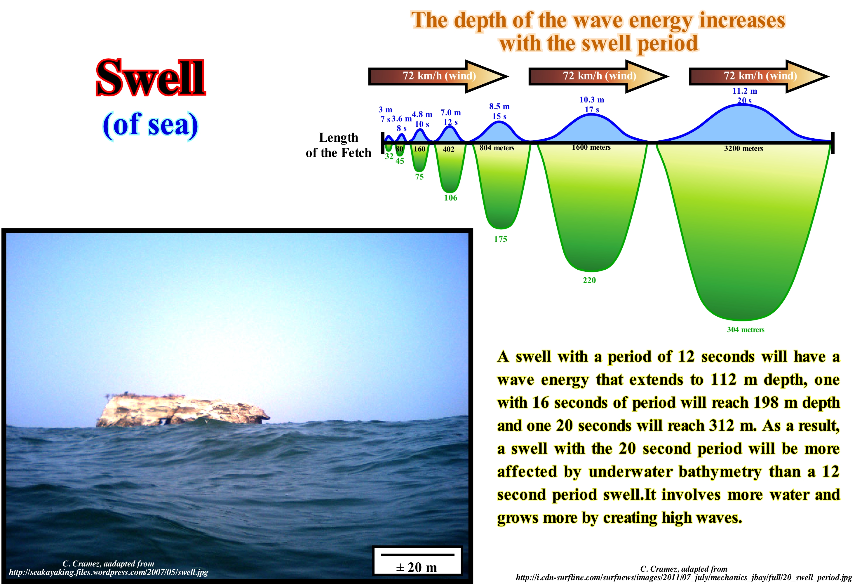 Deformation of the water surface of the seas and oceans due to the spreading of the sea waves, i.e., is a series of mechanical waves that propagate along the interface between water and air and so they are often referred to as surface gravity waves. The swell is characterized by a large period (30-300 seconds), great wavelength (several hundred meters) and a relatively important height (several meters). It is created by storms and travels at great speed (several hundred kilometers per hour) through the ocean (sometimes more than 10,000 km) without great loss of energy. When approaching the continent, the amplitude of the swell increases significantly.