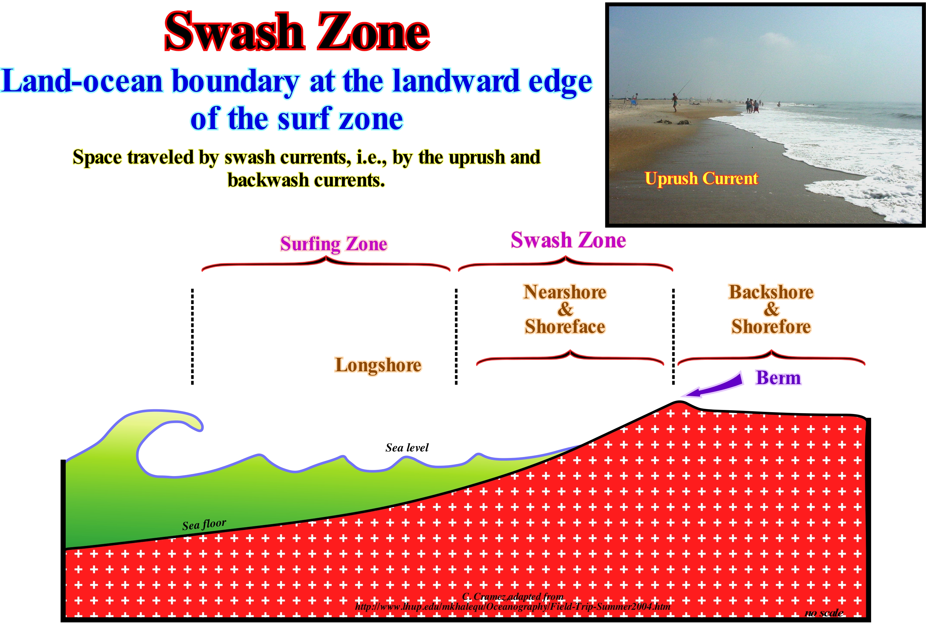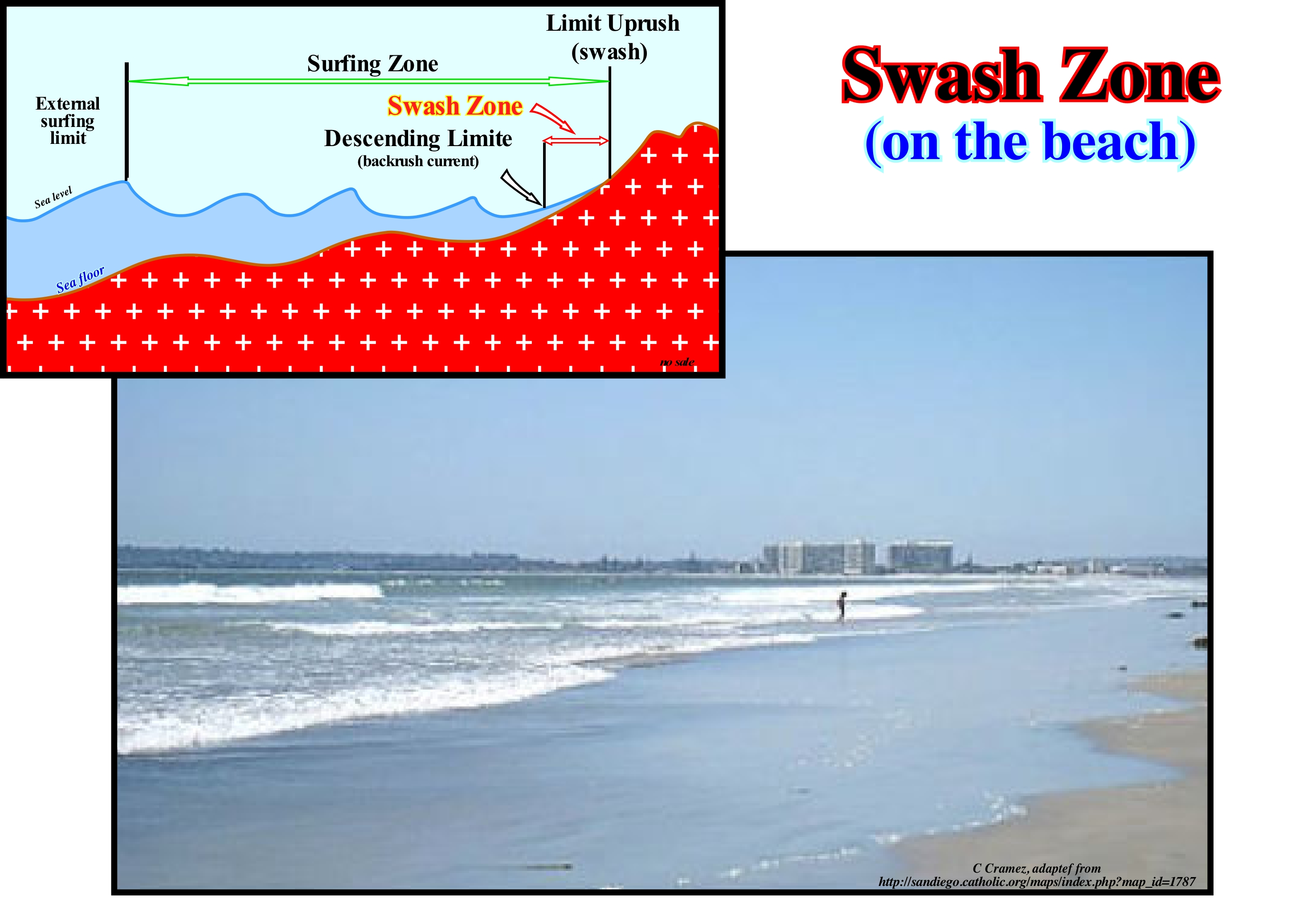 The swash range corresponds to the swash, that is, zone of action of the waves on the beach, which varies according to the water levels, and which extends between the maximum limit of that of the uprush current. When the depth of the sea floor is less than half the wavelength of the waves, the crests of the waves of oscillation become very abrupt and the crests break towards the continent, which transforms the waves of oscillation into waves of translation. As a result of which the waves burst, as is, generally, said, a stream of water is formed in the direction of the continent which moves, more or less, parallel to the direction of the waves. This current is called the uprush current, whose intensity decreases as it moves in the swash range, until its movement is zero. From this moment, another swash current is formed, which now moves from the mainland seaward. It is the backrush current. However, in the backrush current the motive force is no longer the force created by the wave burst, which is perpendicular to the wave direction, but the gravity. Thus, the backrush current is oriented, perpendicularly, to the slope of the beach and not, in parallel, to the direction of the waves. The swash currents have different directions (when the direction of the waves is oblique to the shoreline). It is this difference in the direction of the swash currents that creates the so-called coastal drift current, which is more or less parallel to the coastline and which can have a very important erosive action. The swash domain, which certain geoscientists call the swash zone is the area where the uprush current and the backwash current are active. The swash range is also known as the coastal zone, since it is also the area at the edge of the sea, in which the seabed is exposed during low-tide and submerged at high-tide, i.e., the inter-tidal area. This area is characterized by: (i) A supply of water ; (ii) Wave action is important ; (iii) Significant sun exposure and temperature variations and (iv) A strong salinity, since salt-water stagnant in puddles or puddles evaporates and causes salt deposits.
