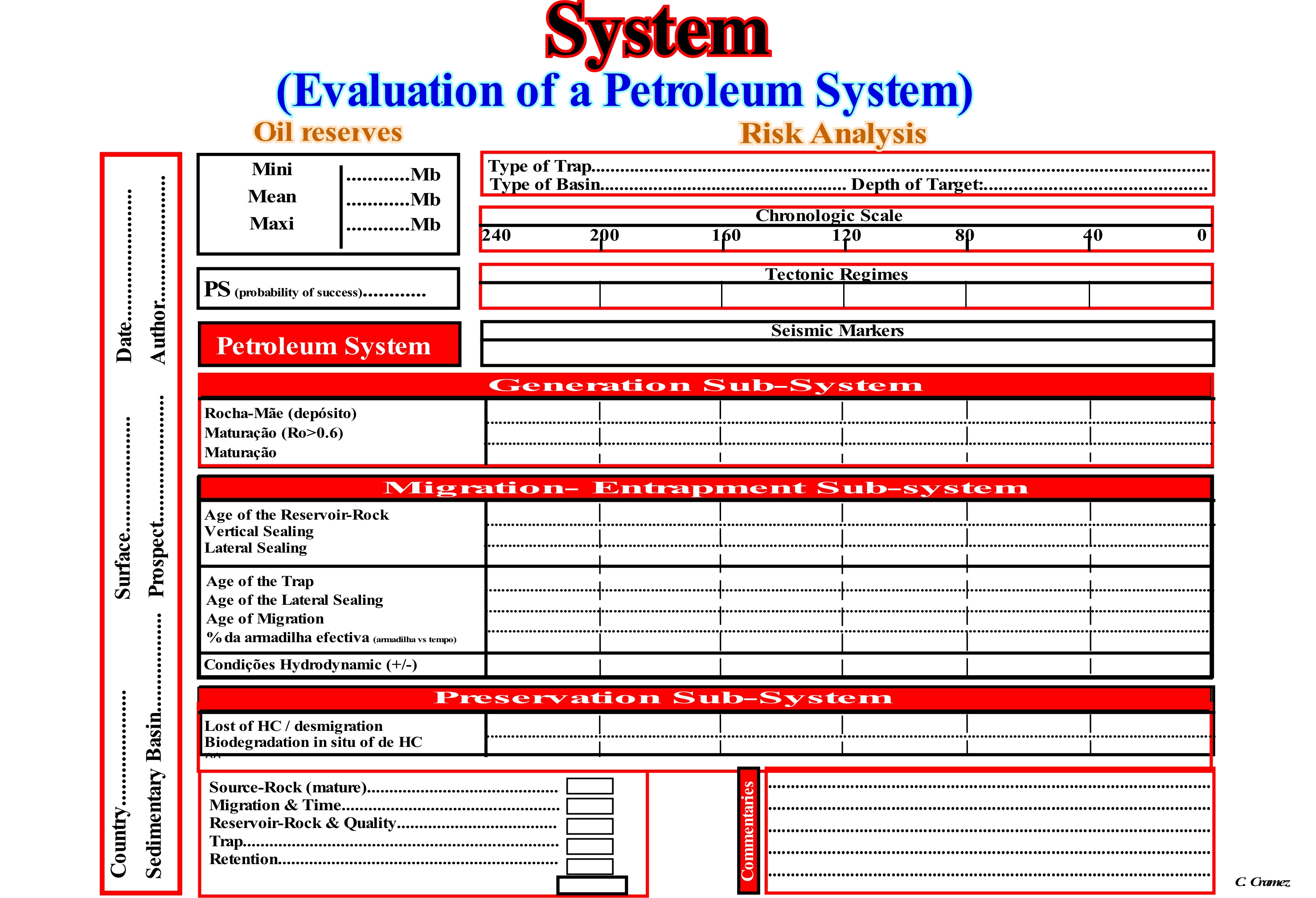 The term system comes from the Greek where it means "to combine," "to fit," "to form a set." The whole system, whether it be geological, petroleum, or otherwise, has a general goal to be achieved. A system is a set of functional organs, components, entities, parts or elements and the relationships between them. The integration between these components can be accomplished by flow of information, flow of matter, flow of energy, etc. The good integration of the components of a system is the synergy, which determines that the transformations occurring in one of the parts will influence all the others. The high synergy of a system makes it possible for it to fulfil its purpose and achieve its goal efficiently. A system is more than the simple sum of its parts. The Cartesian method (individual study of the parts to understand the whole) does not work, particularly, in the petroleum geology. In this figure is illustrated one of the many study charts of an petroleum system (genetic relation between a source-rock and an accumulation of oil), with a risk analysis, a probability calculation of success (noneconomic geological) and a calculation of the reserves in Minimum (5% of cumulative probability), Mean or most likely (cumulative probability curve inflection point) and Maximum (90-95% cumulative probability). A petroleum system consists of three subsystems: (i) Generator Subsystem; (ii) Migration-Entrapment Sub-system and (iii) Preservation Subsystem , in which different petroleum parameters should be considered: (a) Source-Rock; (b) Reservoir-Rock; (c) Sealing-Rock (lateral and vertical); (d) Maturation (organic matter) ; (e) Migration; (f) Trap; (g) Preservation*, etc. It is the interaction between all these parameters that can create a petroleum system, which can be: (i) Known System, symbolized by a sign of affirmation (!), when, based on geochemical information, a positive correlation is defined between a generating rock (source-rock) and the petroleum found ; (ii) Hypothetical System, symbolized by a point (.), when a source rock has been identified, but there is no information, in particular geochemistry, to correlate such source-rock with the petroleum found and (iii) Speculative System, symbolized by a question mark (?), when the presence of a source-rock or an oil field are defined by geological and geophysical evidence. Do not confuse system, which is a whole formed by several interconnected parts, with theory. A theory is a coherent set of hypotheses tested (guesses or conjectures, which can be refuted, but never verified) by evidence and reasoning, which has a great explanatory power, which is to say, that a theory is a set of inter-connected hypotheses based in evidence or observations, in reasoning or logical, coherent and internally consistent. A scientific approach to petroleum systems is a holistic approach, in which the Whole (system) is more than the sum of the parts (petroleum parameters), which means that studies of the characteristics of petroleum parameters, rarely, allow to recognize the petroleum system characteristics. Systems theory says open systems those that undergo interactions with the environment where they are inserted. In this way, the interaction generates feedbacks that can be positive or negative, creating a regenerative self-regulation, which in turn creates new properties that can be beneficial or harmful to the whole independent of the parts. Every organization is an open system, just like every petroleum system. Closed systems are those that are not influenced by the environment in which they are inserted, in such a way that it feeds on itself. Entropy only remains constant in closed systems. Just as it is impossible to try to understand how a car works by looking at its parts separately, the observer may not be able, even, to understand what a car is by looking at its parts. The same is true with a petroleum system. You need to understand how the different parts of the system interact. This interaction of the elements of the system is called synergy. The entropy of a system can be considered as the disorder or absence of synergy. A system stops working properly when internal entropy occurs. (https://pt.wikipedia.org/wiki/System_theory_of_the_systems)