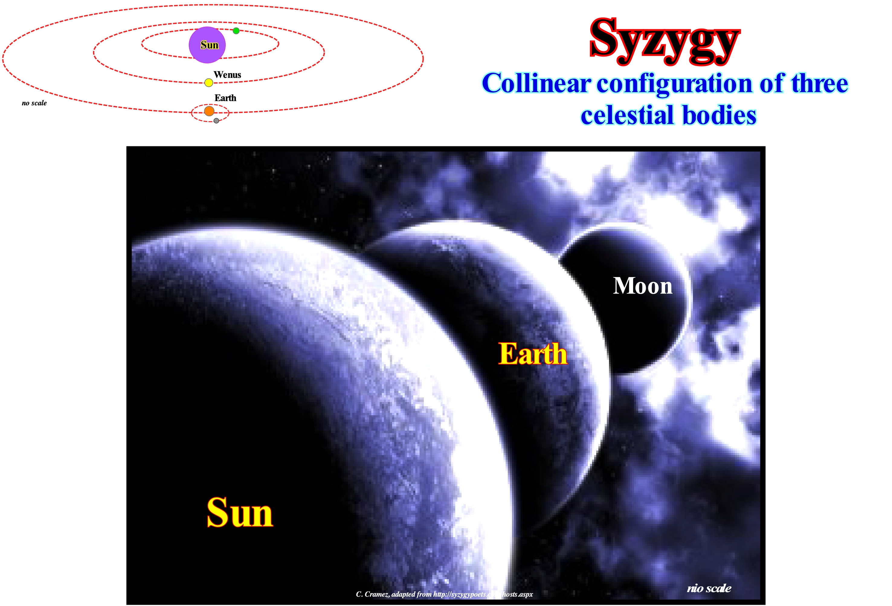 In Oceanography, the tides of syzygy are tides that occur in the new and full moons, when the lunar and solar effects reinforce each other, producing the highest high-tides and the lowest-tides. Indeed, as illustrated in this figure, i.e., the adjective of syzygy, it describes the alignment of three or more celestial bodies of the same gravitational system along a line. In other words, in astronomy, a syzygy is a straight configuration of three celestial bodies (such as Earth, Sun, and Moon) in a gravitational system. This term is, generally, used in reference to the Sun, the Earth and either the Moon or a planet, where the latter is in conjunction (this means that when viewed from somewhere, usually, from Earth, two celestial bodies appear close to one another in the sky, which is, also, sometimes known as an apules) or opposition (when two celestial bodies are on opposite sides of the sky when viewed from a particular place, usually, Earth, i.e., two planets are in opposition to each other another when its ecliptic length differ by 180°). The eclipses of the Sun and the Moon occur in moments of syzygy. This term is, also, applied to every instant of new moon or full moon when the Sun and Moon are in conjunction or opposition, even though they are not exactly on a line with Earth. The term syzygy is, often, used in astronomy more, generally, to describe particular configurations of planets, as in the case of March 21, 1894, around 11:00 p.m., when Mercury travelled through the Sun, seen from Venus and Mercury, and Venus simultaneously passed the Sun seen from Saturn. The transit, in astronomy, is the passage of an inferior planet in front of the Sun, or of a moon or its shadow on the face of a planet. Syzygy is also used to describe situations in which all planets are on the same side of the Sun, although they are not necessarily along a straight line. The term syzygy is also used in mathematics, medicine, music, philosophy, zoology and other science disciplines with to describe totally different things.