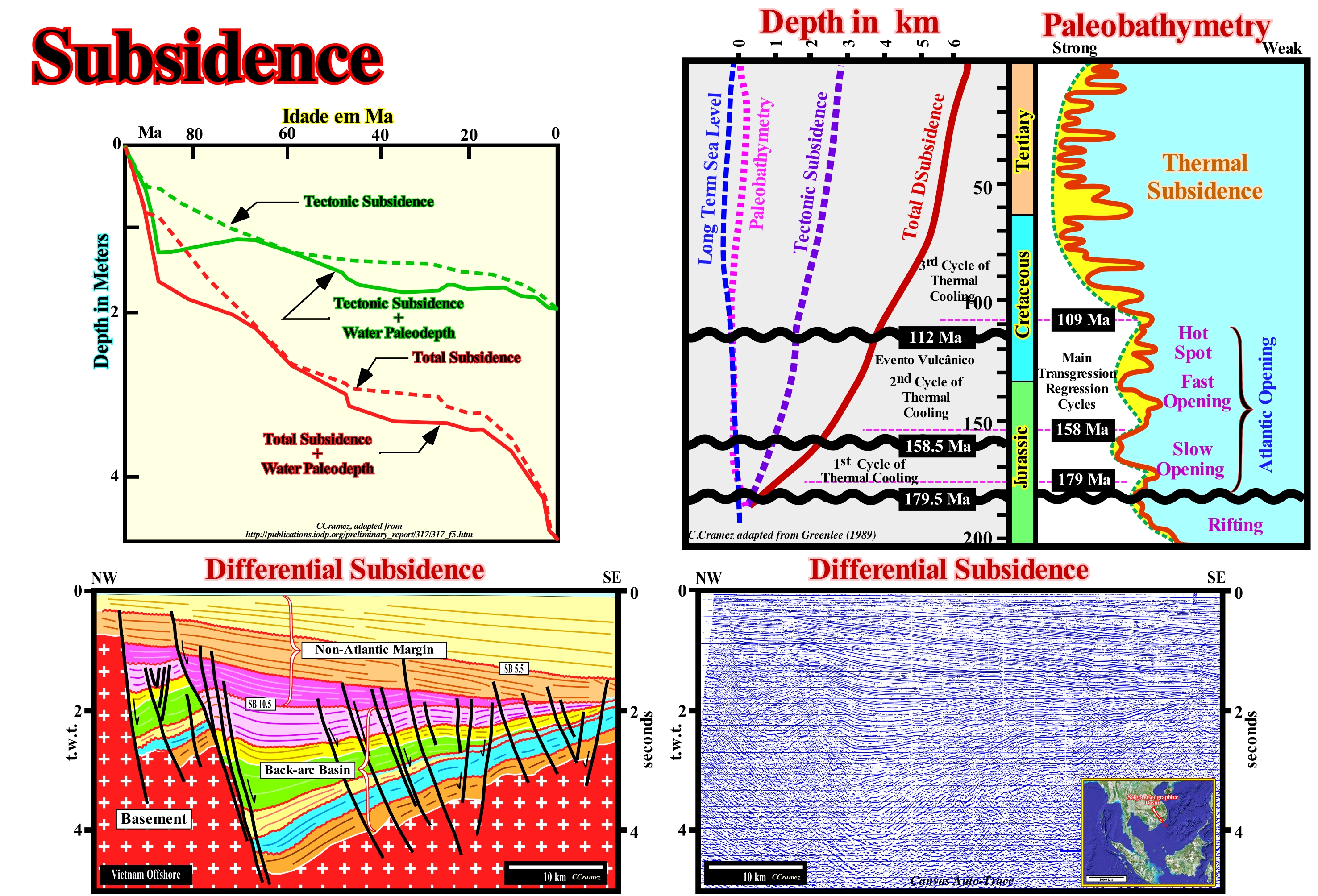 (*) Do not forget that in sequential stratigraphy it is fundamental not to confuse the relative sea level with absolute (eustatic) sea level. The first is a local sea level, referenced to any fixed point on the Earth's surface, which can be the base of the sediments (top of the continental crust) or the sea floor. The second is supposed to be global and referenced to the Earth's centre. The relative sea level is the result of the combined action of absolute (eustatic) sea level and tectonics (subsidence or uplift of the sea floor). The absolute sea level is the result of the combination of: i) Tectono-Eustasy that is controlled by the volume variation of the ocean basins in association with oceanic expansion following the break-up of the supercontinents ; (ii) Glacio-Eustasy, which is controlled by the variation of water volume of the oceans as a function of the amount of ice (assuming that the amount of water in all its forms is constant since the formation of the Earth, around 4.5 Ga) ; (iii) Geoidal-Eustasy, which is controlled by the distribution of ocean water caused by variations in the Earth's gravity field (where gravity is stronger than normal, sea level is thrown to the centre of the Earth) and (iv) Thermal expansion of the oceans or steric sea level rise (if the temperature increases, the density of the water decreases, and for a constant mass, the volume increases). During a given geological time, the combination of the eustatic curve (absolute sea level changes curve) and the tectonics (subsidence of the sea floor, when the predominant tectonic regime is in extension or uplift, when the predominant tectonic regime is compressional) gives the curve of the relative sea level changes.