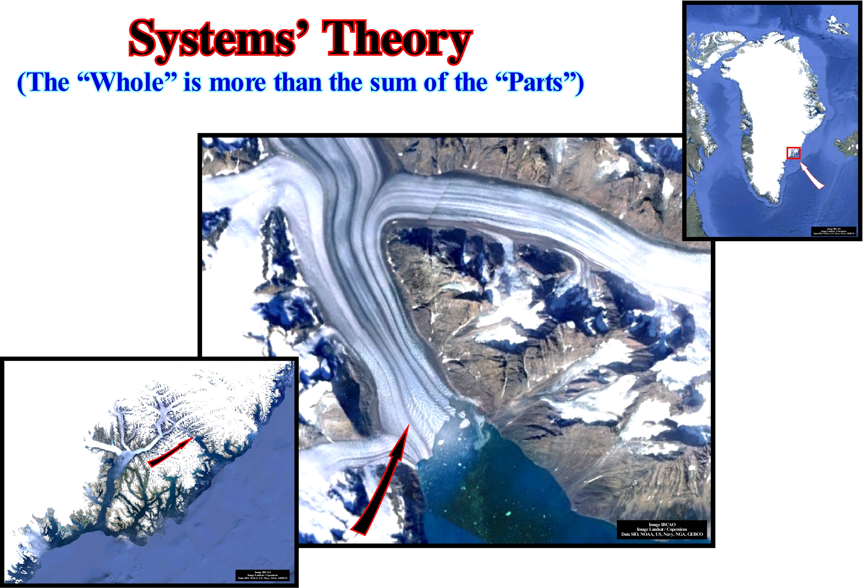 The systems' theory studies the abstract organization of phenomena, independent of their formation and present configuration. In a simplified way it says that the "Whole" is more than the sum of the "Parts". As suggested in this figure the understanding of a glacier system will never be obtained by studying its different elements in isolation. Systems' theory investigates all principles common to all complex entities and models that can be used to describe them. Systems' theory, whose first statements date back to 1925, was proposed in 1937 by the biologist Ludwig von Bertalanffy, who reached his peak of dissemination in the 1950s. Von Bertalanffy's researches were based on a different view of scientific reductionism, i.e., the idea that scientific explanations must be continually reduced to the simplest entities possible, Occam's razor is the basis of this type of reductionism, hitherto applied by conventional science. Some geoscientists say that it was a reaction against reductionism and an attempt to create scientific unification. The three basic conjectures of systems' theory can be summarized as follows: (i) A system is a set of interactive and interdependent "Parts" that together form a unitary "Whole" with a certain purpose and perform a certain function ; (ii) A system can be defined as a set of interdependent elements that interact with common objectives forming a "Whole" and where each of the component elements behaves, in turn, as a system whose result is greater than the result that the units they could have worked independently (any set of "parts" joined together can be considered a system, provided that the relations between the parts and the behaviour of the "whole" are the focus of attention) ; (iii) A system is a set of coordinate "parts", forming a complex or unitary "whole". According to systems' theory, instead of reducing an entity (a stratum for example) to the individual study of the properties of its "parts" or elements (minerals), we must focus on the arrangement of the "Whole", that is, on the relations between the interconnecting and interacting. One can not detect the behaviour of the "whole" as a function of the "parts" or, in other words, the study of the particles of a given element, whose individual behaviour, although predicted, can not indicate the position or movement of the "whole". This theory is fundamental in sequential stratigraphy where the understanding, for example, of a post-Pangea continental encroachment cycle (stratigraphic cycle induced by the first order eustatic cycle after the break-up of the supercontinent Pangea), can not be obtained just by the study of the sequence-cycles (stratigraphic cycles induced by third order eustatic cycles, whose time-duration ranges from 0.5 to 3/5 My) and, as the understanding of a sequence-cycle, can not be obtained just by study of the sedimentary systems tracts,that is, by the study of the lateral associations of synchronous and genetically connected depositional systems, which are deposited during the stability period of the relative sea level, which occurs after each marine ingression. That is why geoscientists, in sequential stratigraphy, progress from the "general" to the "particular" rather the opposite. In the same way, the understanding of a petroleum accumulation can only be obtained by the understanding of the associated petroleum system, that is to say, of the "Whole" that encompasses all the elements and geological processes necessary to the existence of a petroleum accumulation. In fact, if there is an oil or gas accumulation, it is necessary the presence of source-rocks (sedimentary rocks rich in organic matter), reservoir-rocks, sealing-rocks. In addition to the presence of these rocks, three geological processes are fundamental: (1) Burial so that the organic matter of the source-rocks reaches maturation (oil window) ; (2) The formation of traps ; (3) The migration, which transports the hydrocarbons generated by the source-rocks to the reservoir-rocks of the traps. All these conditions must occur synchronously with respect to geological time.