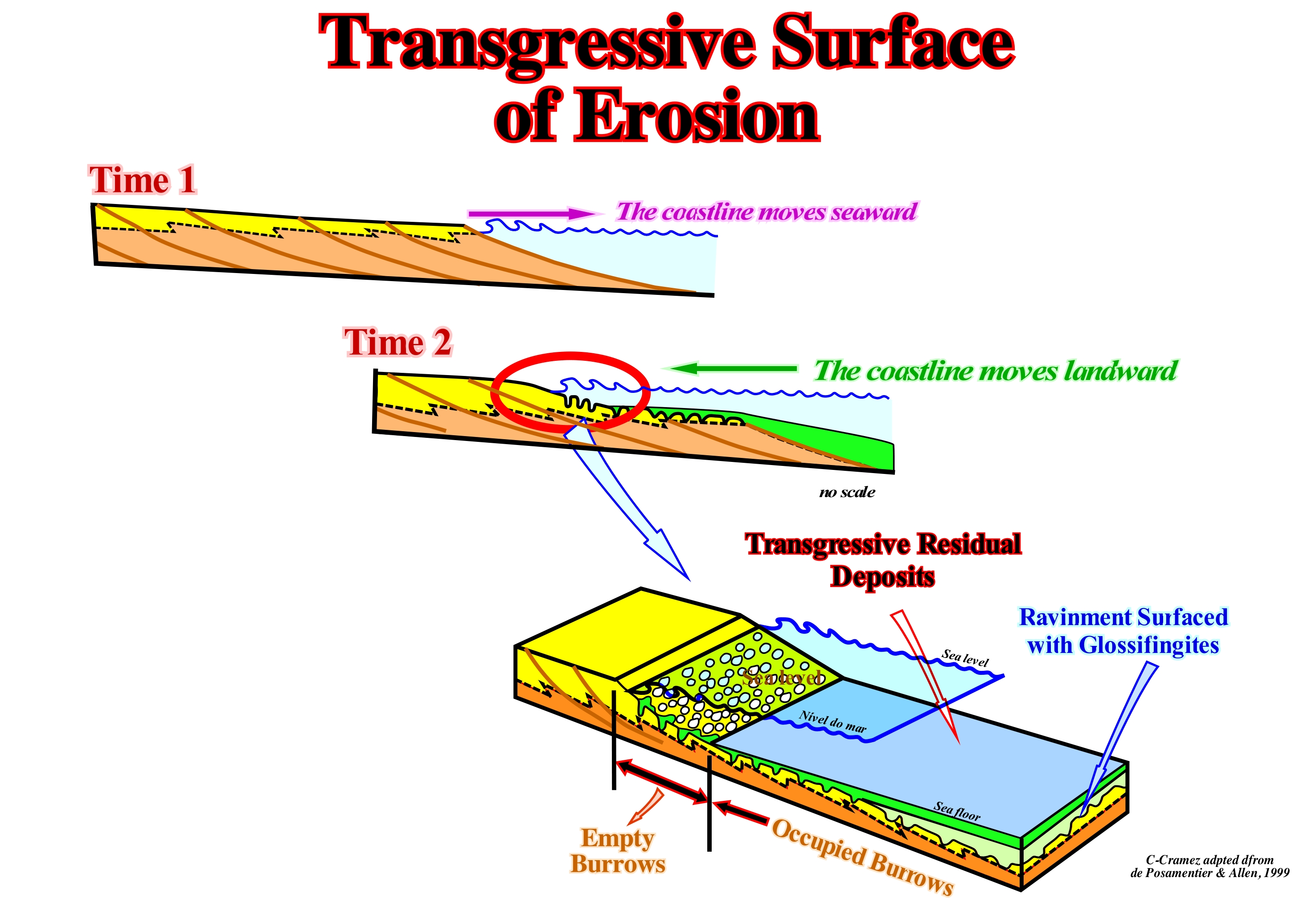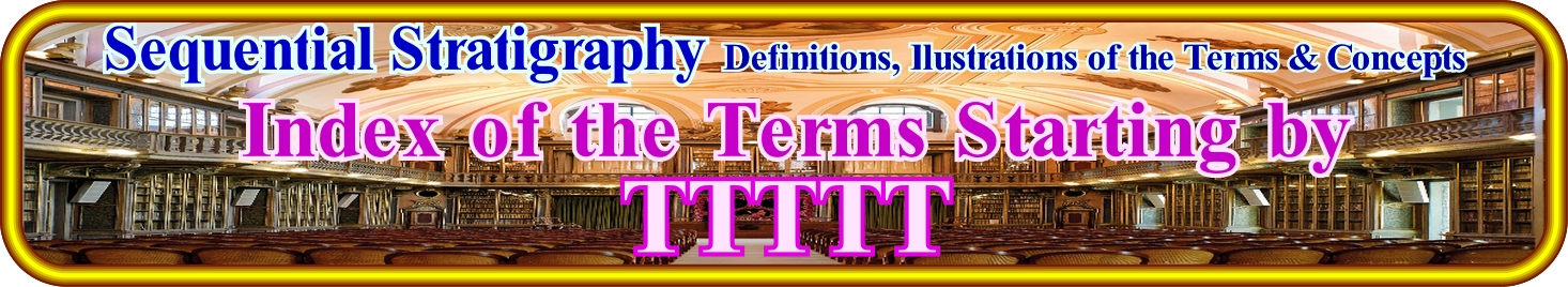 In set theory and algebra the notion of equivalence relation over a set, allows to establish a relation between the elements of the set that share a certain characteristic or property. This allows you to group these elements into equivalence classes, that is, into "packages" of similar elements. Thus it is possible to construct new sets by adding all elements of the same class as a single element that will represent and that defines the notion of set quotient*. In stratigraphy the time equivalence relation can be in: (i) Time by continuity ; (ii) Time by Interdigitations and (iii) Time by stratotype. In this sketch, two correlations in time are represented by continuity (change of facies and double hiatus). In the left sketch, the upper layers (C) are the same on one side and on the other, as are the lower layers (A). The intermediate layers, i.e. the layers or intervals B and B', have different facies, i.e. have a different lithology. However, since layers B and B' are framed by two chronostratigraphic sedimentary intervals (layers C and A), they are more likely to be the same, since the lithology change is continuous and progressive (equivalence time by changes in facies). In the sketch of the right, where the equivalence time is by double hiatus, the change of facies is done in a, totally, different way. The interval B, bounded between layers D and A (on the left side) disappears, laterally, by onlapping, while a new interval (interval C), bounded between layers D and A, on the right side, is deposited in In terms of sequential stratigraphy, these two time equivalents correspond to completely different geological histories. The first equivalence is typical. It corresponds to changes in facies, for example, within a sedimentary systems tract, along which the different depositional systems (lithology and associated fauna deposited in a given sedimentary environment) are synchronous, genetically linked. The second time equivalence implies an unconformity, that is, it implies an erosional surface induced by a significant the relative sea level ** fall, between the interval B and the interval C and that probably the top of the interval A was, slightly or locally, eroded during the exposure phase associated with relative sea level fall. This means that the intervals B and C belong to two different stratigraphic cycles interbedded between intervals A and D. In the left sketch (equivalence time by change of facies***) there are probably three stratigraphic cycles (cycles-sequence?), separated by unconformities whereas in the right sketch, there can be at least four sequence-cycles. The entire stratigraphic cycle, whatever its hierarchy (continental encroachment cycle, continental encroachment subcycle, cycle-sequence, etc.) is always limited between two unconformities, along which the intervals with or potential reservoir-rocks, whether they are low or highstand. Unconformities are erosional surfaces induced by significant relative sea level falls. The sequence-paracycles, which constitute the different subgroups of sedimentary systems tracts of a sequence-cycle, as its name implies, are not induced by eustatic cycles, but by eustatic paracycles, that is, by relative sea level rises (marine ingressions) without fallings between them. The associated sequence-paracycles (deposited during stability periods of relative sea level that occur after each marine ingression) are limited by flooding surfaces rather than by erosional surfaces, although at the base of each marine ingression a ravinment surface may develop.
