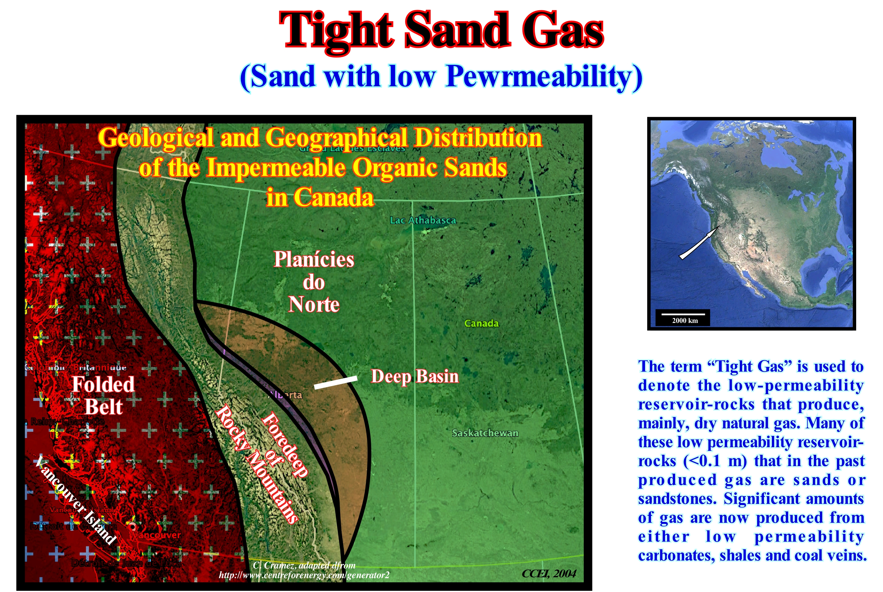 Gas impermeable organic sands * are very low permeability reservoir-rocks (ability of a material, such as a rock, to convey fluids or connectivity of the pores of a rock), which require artificial fracturing so that the gas can flow. In general, they are located in areas where there is conventional gas production in the shallow reservoir-rocks. In the 1970s, some oil companies discovered large amounts of gas (resources) in the deep eastern basin of the Alberta province (Canada), illustrated in this figure. In fact, most rocks in the stratigraphic column are saturated with natural gas (a mixture of light hydrocarbons derived from fossil fuels formed when sedimentary layers rich in organic matter are buried and subjected to high temperature and pressure for millions of years). The rocks have a very low permeability, but as they contain water a gas production is, sometimes, possible. Regions with the same characteristics were found in other basins in different parts of the world. Currently, natural gas is produced from impervious organic sands in Canada, USA, Australia and Argentina. In Canada, these sands are found in the deep basin and foreland basin of the Rockies (British Columbia and Alberta), and in the southern plains of the province of Alberta and the northern plains of British Columbia. USA Geological Services think gas impermeable sands can hold about 460 Tcf (1012 cubic feet) of gas in the United States (about three times the current amount of proven gas reserves) and of which probably 135 Tcf may be technically recoverable, but until recently, it was very difficult or impossible to produce large amounts of gas from impermeable rocks. At present-time, things have changed (gas prices are much higher and new production techniques have been discovered). In the United States, the current production of gas from sand and waterproof clays is about 20% of the total production.