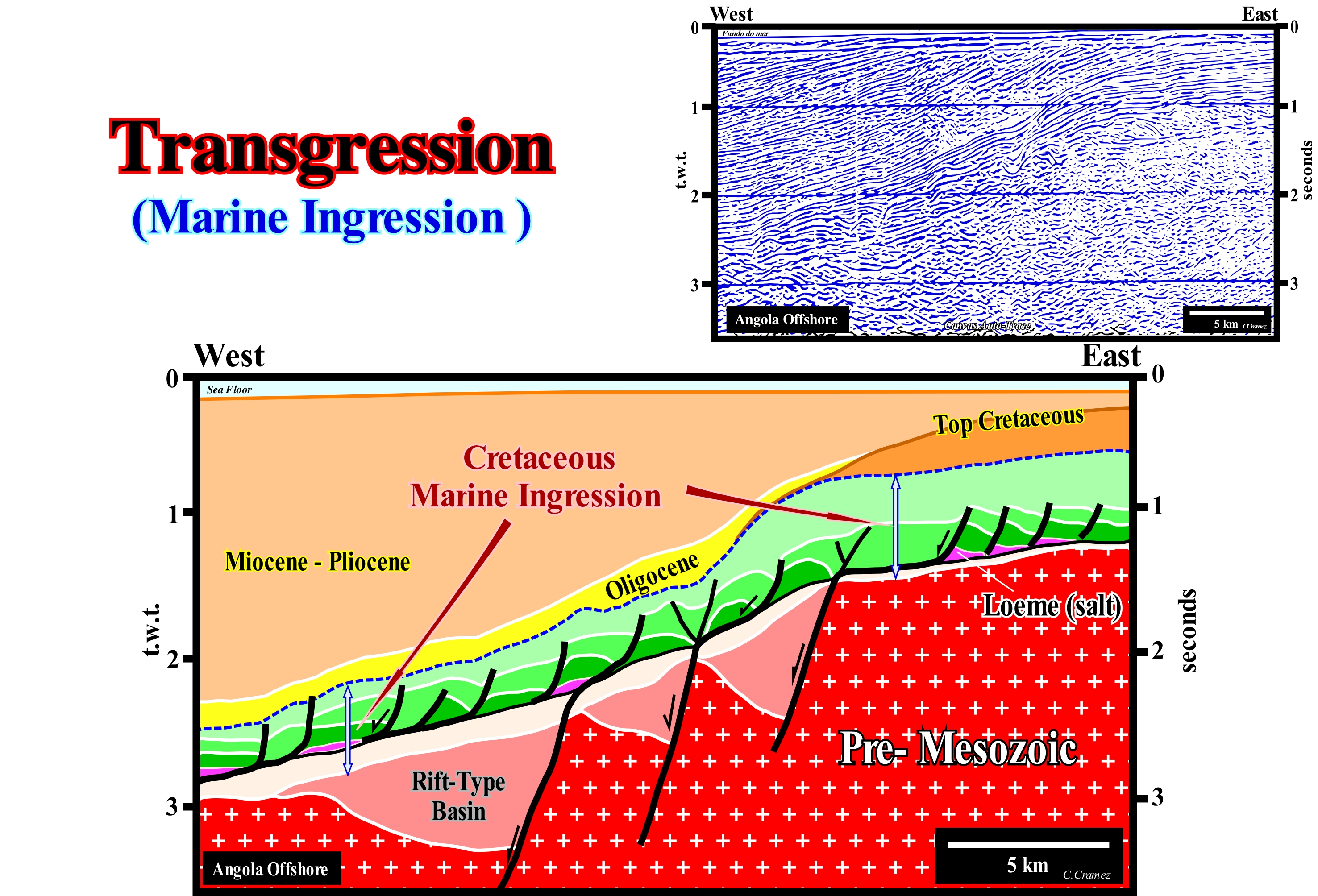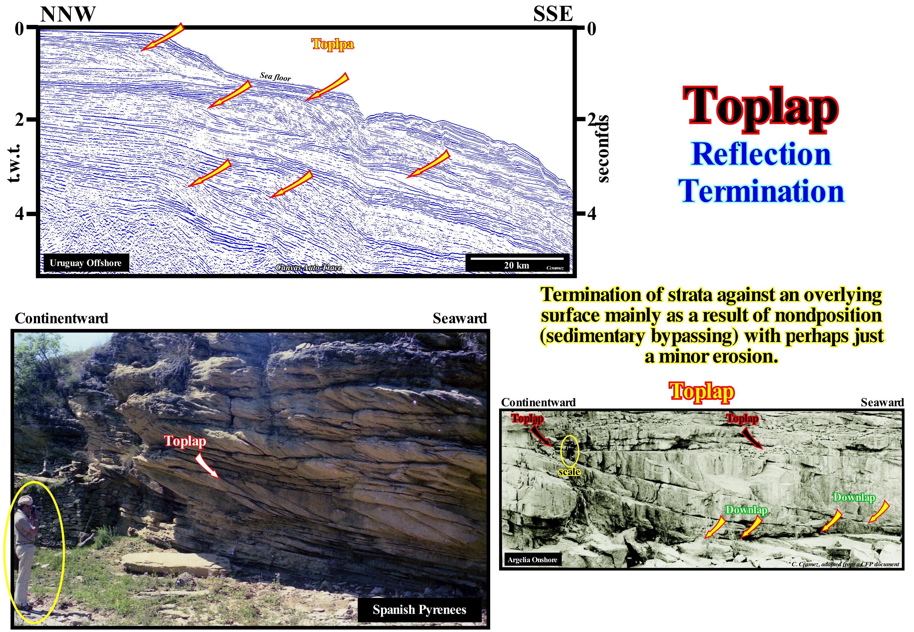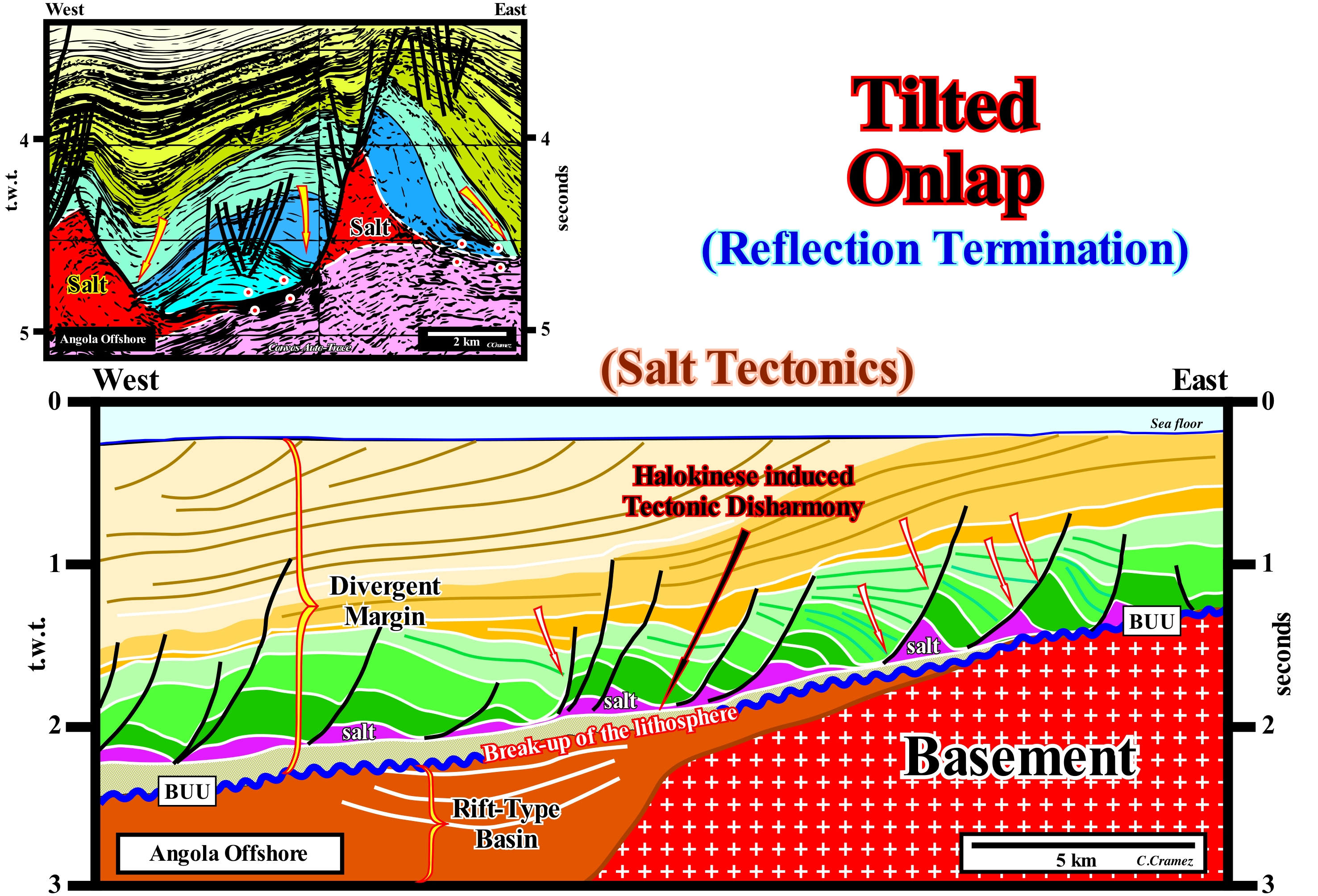 The Angola offshore, where the seismic lines of the auto-traces, of these tentative geological interpretations, illustrated in this figure, corresponds to the vertical stacking of three types basins of the classification of the sedimentary basins of Bally and Snelson (1980). From the bottom to top, it is easy to recognize : (i) A basement that, locally, corresponds to a Paleozoic flattened folded and flattened mountains belt ; (ii) Late Jurassic- Early Cretaceous rift-type basins and (iii) An Atlantic-type Divergent Margin. The rift-type basins forming during the lengthening of the Gondwana small supercontinent, which was part of the Pangea supercontinent, predated the BUU unconformity (acronym for "Breakup Unconformity") that underlines the breakup of lithosphere. The divergent margin underlines the post-Pangea continental encroachment stratigraphic cycle, in which some geoscientists, often wrongly, include the rift-type basins, which was induced by the post-Pangea 1st order eustatic cycle. Locally, at the bottom of the margin, lava flows fossilize the BUU unconformity. A relatively thick evaporitic level allows the subdivision of the margin infra- and suprasalt intervals, which, even in the absence of local salt, due to total or partial flowage (lower than the seismic resolution), are separated by a tectonic disharmony. Tilted onlaps (underscored by arrows) are, easily, recognized in suprasalt interval. The lateral and vertical flowage of the salt (in violet, on upper part of this tentative interpretation and in red, in the lower one), locally, creates a compensatory subsidence, which produces tectonic inversions in the sediments overlying the salt interval. The geometric relationships and the original terminations of the seismic reflectors associated with the postsalt sediments are deformed. Tectonic inversions create, sometimes, structures of antiform geometry, as illustrated in the upper tentative interpretation, which geoscientists call "turtle back". Certain raised or subhorizontal areas, at the time of deposition, become structurally low, due to decreasing thickness of the salt layer caused by lateral salt flowage. The reverse is, also, possible. A low area at the time of deposition may become, relatively, high if the adjacent high area sinks due to the flow of the underlying salt. Due to a compensatory subsidence, induced by a total or partial salt flowage, onlapping (by definition, at the time of deposition) can become an apparent downlapping, as illustrated in these tentatives. A lateral or vertical displacement of the salt causes a lengthening of the overlying sediments, which can be raised (salt domes) or tilted towards the more subsident area. The arrows indicate the areas where apparent downlaps can be recognized which, as stated above, are onlaps which were tilted continentward (eastward) due to the flow of the salt interval towards the basin. The base of the salt horizon, which is, more or less, discontinuous due to the formation of salt welds**, corresponds to a tectonic disharmony which, in these tentative interpretations, dips slightly westward. The meaning of strata or reflectors terminations (lapouts) has a geological value, when they retain their original depositional geometry. An onlap or downlap translates the geometry of the reflectors at the time of deposition. An onlap s translates, always, a sedimentary aggradation induced by a marine ingression or rise of the relative sea level (local sea level referenced to any point on the Earth's surface, which can be the sea floor or the base of the sediments). A deformed or tilted onlap is a lapout that was later affected by tectonics, that is, that was shortened or lengthened, and which may even acquire a geometry similar to that of a downlap.
