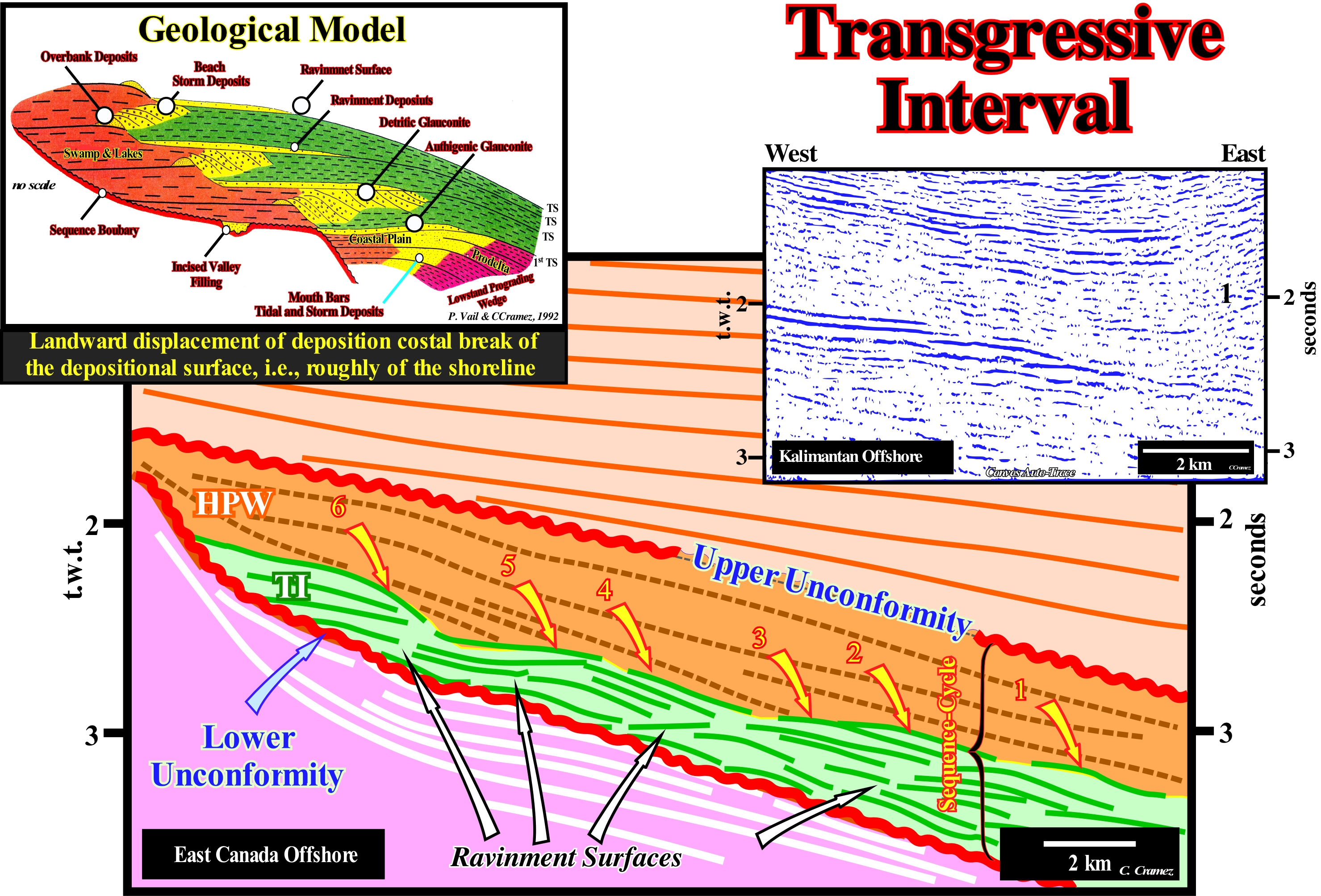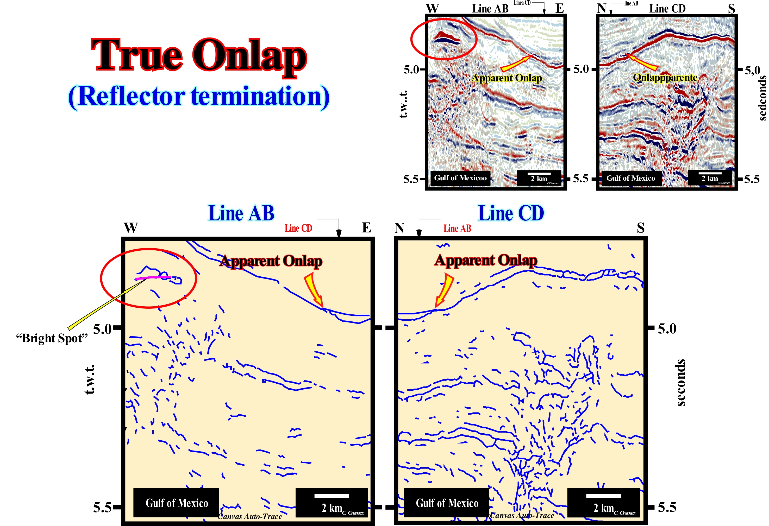 In this figure are represented the main reflectors of the Canvas auto-traces of two details of two perpendicular Gulf of Mexico seismic lines. The geological context of the sedimentary intervals, illustrated in these details, is of continental slope, i.e., the sediments were not, necessarily, deposited horizontal, but probably, slightly, slopping seaward. The onlaps underlined by the red arrows are apparent onlaps, since none of the seismic lines of these two tentative interpretations is oriented in the sense of the regional dip of the continental slope (at the time of deposition). The regional seismic lines from which the auto-traces were made are neither perpendicular nor parallel to the continental slope, but oblique. However, since they are orthogonal to each other (see crossing between lines AB and CD), the onlaps underlined by the arrows correspond to the same seismic reflector and are apparent onlaps. A true onlap (observed along the depositional slope which marks, more or less, the direction of the regional terrigeneous influx), must exist on a seismic line located between the AB and CD seismic lines. The seismic reflectors are associated to the lowstand systems tracts group (LSTG) and, above all, to the middle systems tract subgroup, i.e., the submarine slope fans (SSF). In fact: (i) Turbidite natural marginal dykes (turbidite levees), deposited by the overbanking of turbidity currents and (ii) Fills of depressions between marginal dikes, which certain geoscientists call turbiditic channels (when there is evident of erosion), are easily recognized. As these auto-traces are, relatively, small (4-5 km in length), it is difficult to highlight the paraconformity* (discontinuity between sedimentary intervals, more or less, with the same structural attitude, but separated by significant hiatus by nondeposition), which correlate, upstream, with the unconformity that underlie the relative sea level falls induced by the turbide current responsible for the deposition of submarine fans (submarine basin and slope fans). Within the submarine slope fans (SSF), it is important to differentiate the direction of the regional terrigeneous influx from the direction of the local terrigeneous influx, associated with the overbanking of the turbidite currents. The first influx corresponds, more or less, to the direction of the turbidite currents, which, in most cases, flow following the dip of the continental slope. The second influx is very local and variable. It is induced by overbanking and avulsion (abrupt and violent change of the trajectory of a current) of the turbidite currents. In addition, this local terrigeneous influx has opposing polarities, since the overbanking is, sometimes, done at the same time on either side of the depression where the currents flow towards the deep parts of the basin. When the depression between the natural marginal dikes becomes inactive, i.e., when the turbidite currents no longer use it to flow downdip, it is filled, in retrogradation, when the relative sea level begins to rise. It is said t there is avulsion when a turbidite current abandons the bathymetric anomaly** along which it flows to take another path. Unlike a river, a turbidite current does not need to have a bed (depression of terrain). Natural marginal fluvial dikes are deposited above the river bed (where the river is drained), where the river normally flows, while the first natural turbiditic marginal dikes are deposit at the same level of the turbidite current that have no bed (at least the first currents).