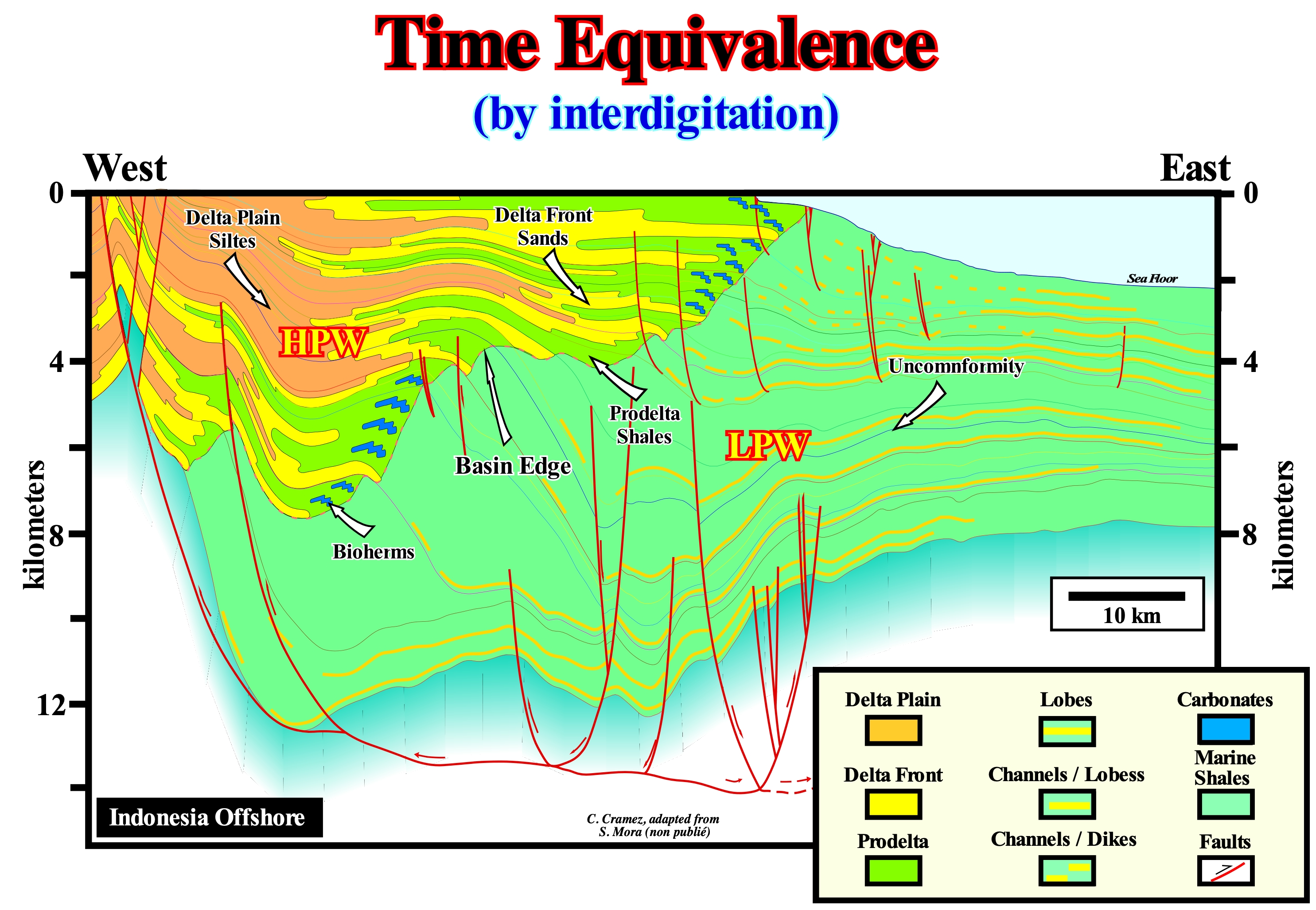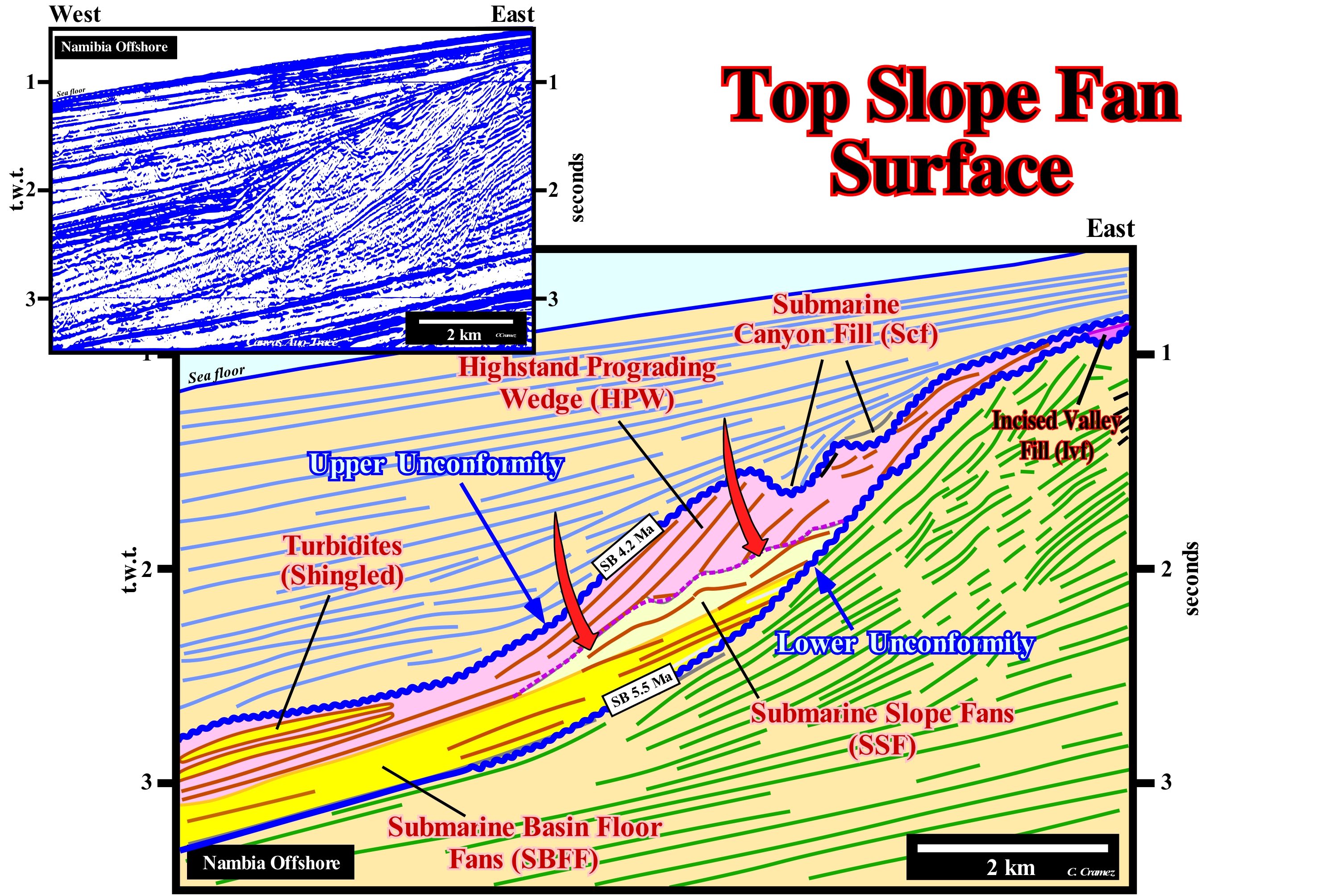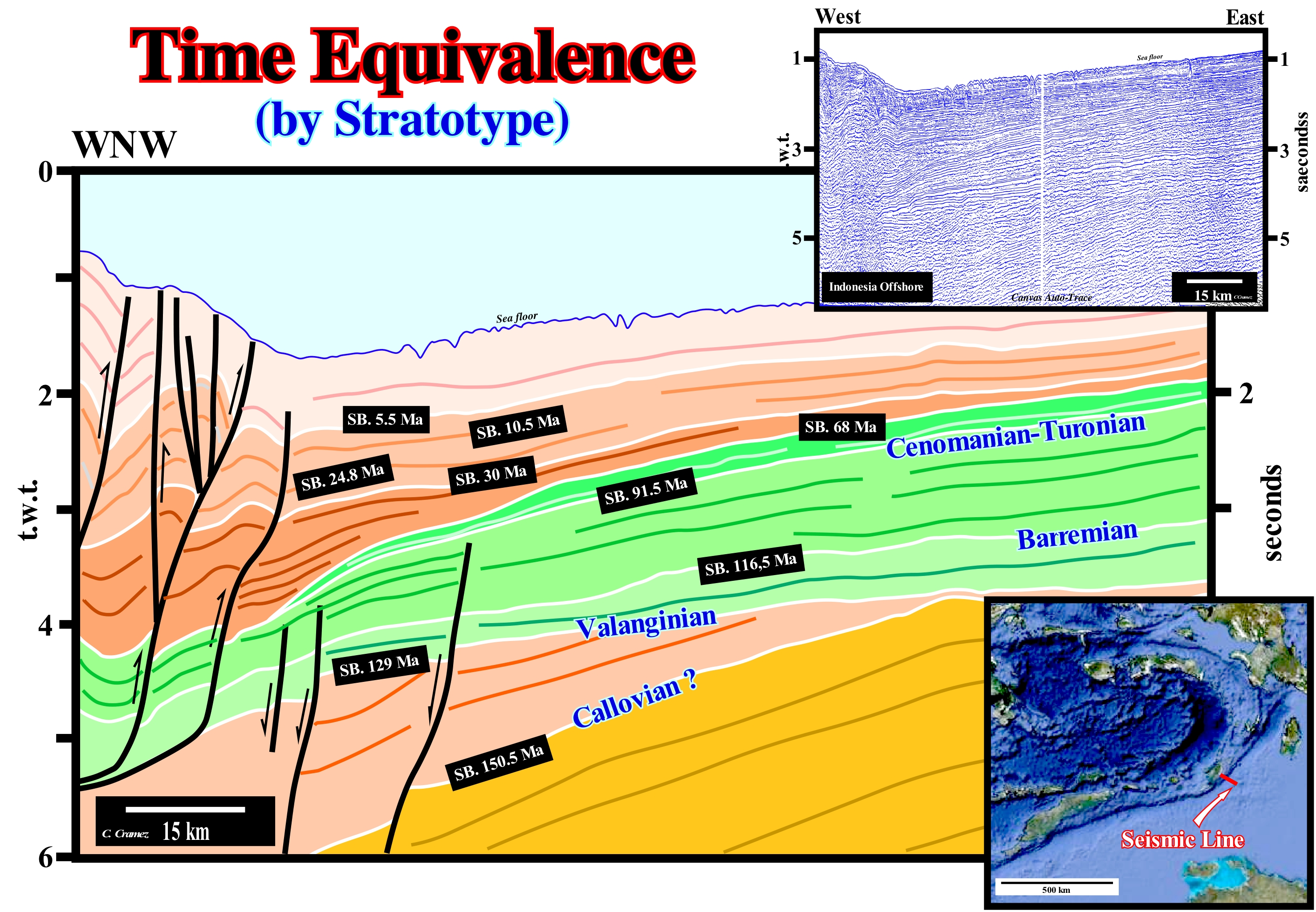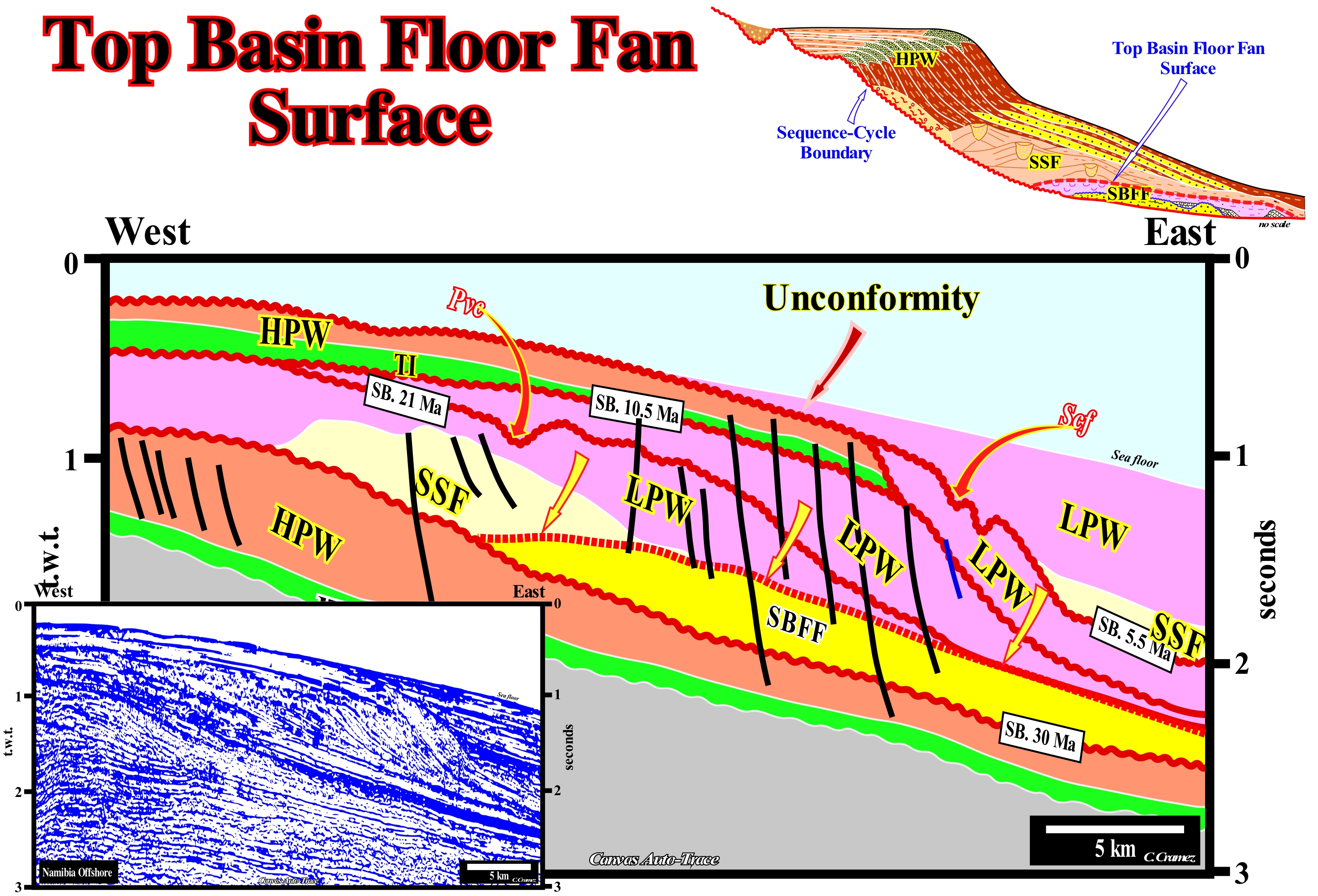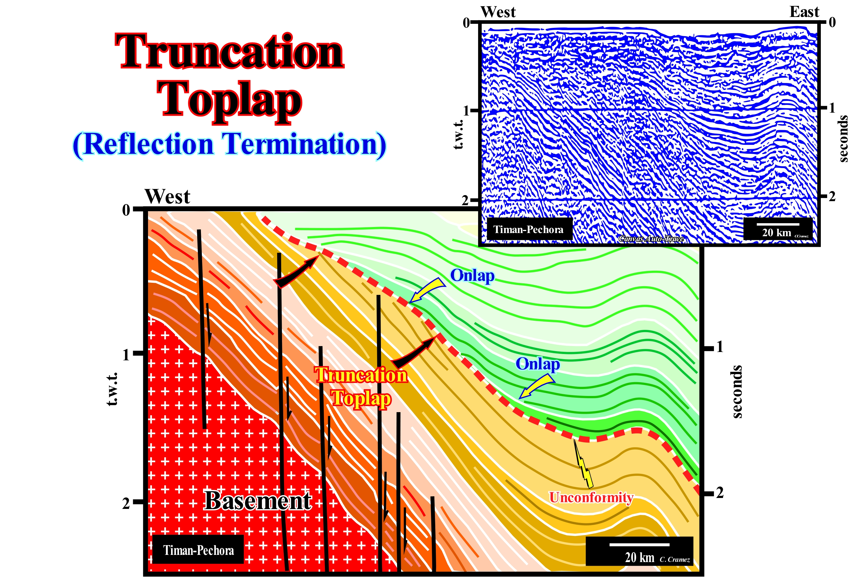 The onshore of Timan-Pechora (Russia) corresponds to the association of a foreland basin and a chain of folded mountains of the classification of the sedimentary basins of Bally and Snelson (1980). The closure of the Uralic ocean (small ancient ocean situated between the Siberia and Baltic continents, which formed in the Late Ordovician) occurred in the Early Permian/Early Triassic. In the north of the folded belt, thrusts with a West vergence produced a large foreland basin of westward of the mountain belt. In contrast, in the north extension of the orogen, in the Taymyr folded belt, the thrusts have a SE vergence. On this tentative geological interpretation of a Canvas auto-trace of a detail of a seismic line of this onshore, an unconformity, i.e., an erosional surface, limiting two seismic intervals is well individualized not only by the onlapping of the upper interval, but also by the toplaps by truncation (erosion) of the underlying interval. Take into account the horizontal scale of this auto-trace in order to understand the morphology of seismic surfaces and mechanical discontinuities* (faults). The onlaps of the intervals overlying the unconformity characterizes a seismic surface (onlapping surface) that underlines the erosional surface, that a significant relative sea level fall has created ("causa debet praecedere effectum", i.e., "there is no effect without cause"). The toplaps of the intervals underlying the unconformity strongly suggest that the unconformity was later tectonically enhanced (tectonics may reinforce an unconformity, but can not create it without the eustasy, which is responsible for the cyclicity of deposition). Although the main shortening of the sediments postdate the unconformity (which is deformed), an eastward slope of the basin, prior to the formation of the unconformity, is suggested by the obliquity of the reflectors and upper lapouts. These lapouts are not the consequence of an absence of deposition, but of a truncation. They formed by the action of erosion, which corroded and truncated the sedimentary layers already deposited. One of the most important points of the stratigraphic analysis is the determination of the age of the unconformity. On this tentative interpretation, the age of unconformity can not be determined correctly, since the original seismic line is very short. All that can be said on this tentative is that the age of unconformity precedes certain intervals (coloured intervals in dark green) and postdate others (coloured intervals in light brown). But this type of dating is not very precise. The accuracy interval is of the order of several millions of years, since in this area the hiatus between the lower and upper sediments is quite large. The age of an unconformity corresponds to the age of relative sea level fall, which can be determined by the age of the associated submarine basin floor fan (SBFF). The age of an unconformity corresponds to the minimum hiatus between the two stratigraphic cycles separating it, which are, usually, sequence-cycles. Such a hiatus is observed in the deep basin where the sequence-cycles are limited, in deep-water, by the correlative deep-waterr paraconformity of the unconformity. The age of the submarine fans deposited, immediately, above this correlative paraconformity corresponds roughly to the age of the unconformity that induced them, since, geologically, the time of deposition of the submarine fans is considered instantaneous. Thus, the age of the pelagic layer (E bed in the terminology of the Bouma sequence) that fossilizes the first turbidite layer, practically, gives the age of unconformity. The reason why the geoscientists use the first pelagic layer and not the first turbiditic layer is that all the fauna and flora of the turbidite layers is transported, which is not the case in the pelagic beds.