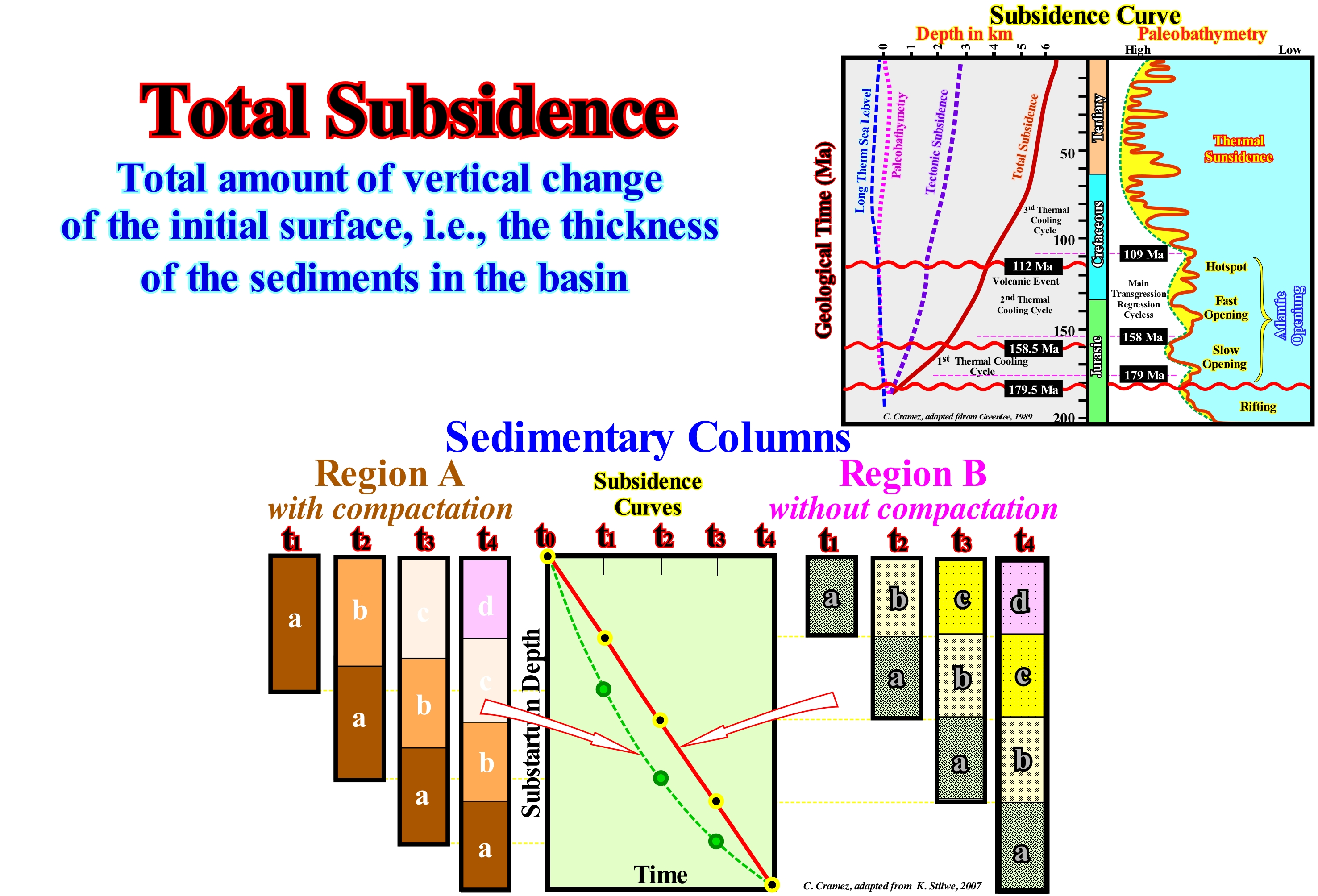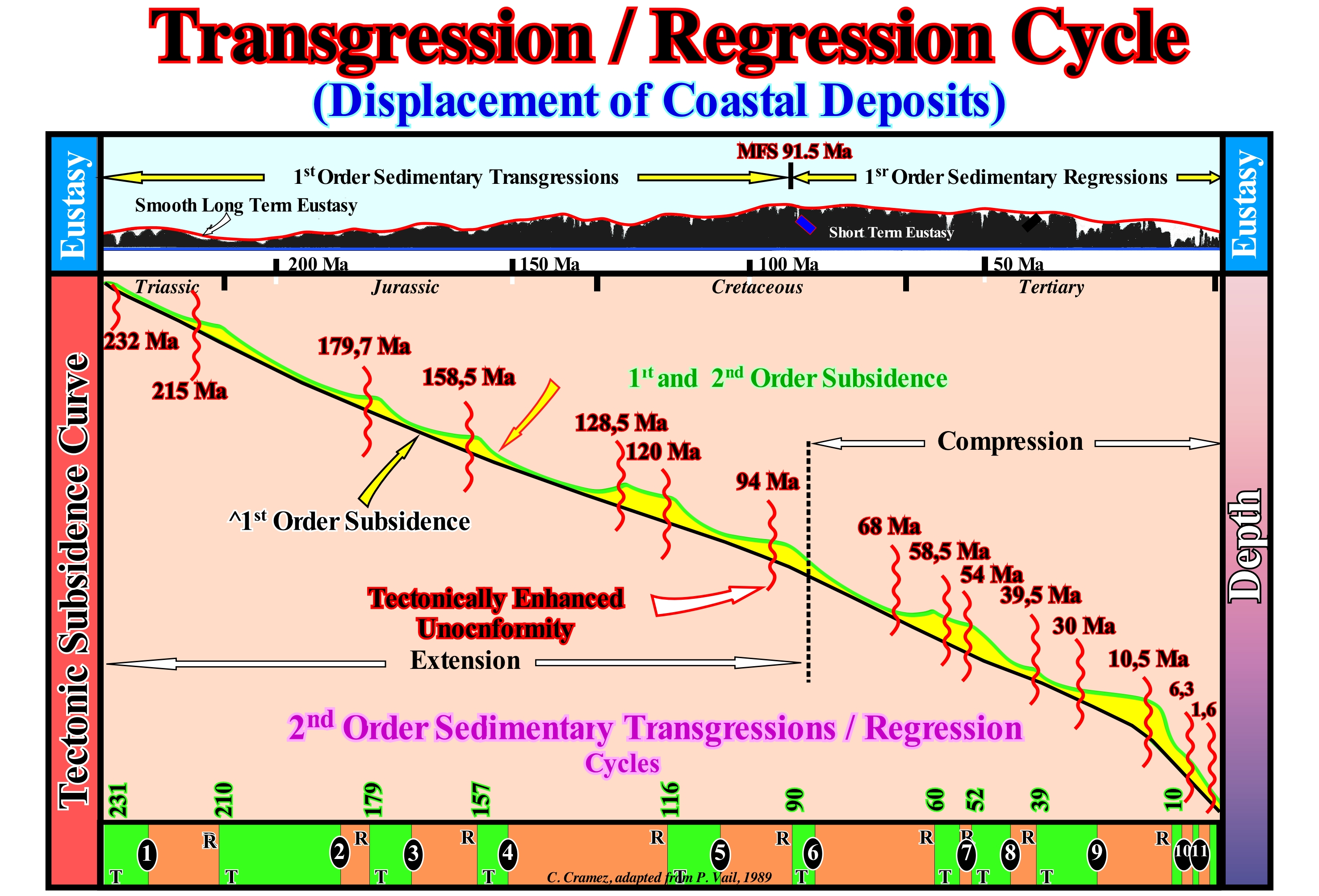 (*) Do not forget that in sequential stratigraphy it is fundamental not to confuse the relative sea level with the absolute (eustatic) sea level. The first is a local sea level, referenced to any fixed point on the Earth's surface, which can be the base of the sediments or the sea floor. The second, which supposed to be global, is referenced to the Earth's centre. The relative sea level is the result of the combined action of absolute ( eustatic) sea level and tectonics (subsidence or uplift of the sea floor). The absolute sea level is the result of the combination of: i) Tectono-Eustasy that is controlled by the volume variation of the ocean basins in association with oceanic expansion following the break-up of the supercontinents ; (ii) Glacio-Eustasy, which is controlled by the variation of water volume of the oceans as a function of the amount of ice (assuming that the amount of water in all its forms is constant since the Earth's formation, around 4.5 Ga) ; (iii) Geoidal-Eustasy which is controlled by the distribution of ocean water caused by variations in the Earth's gravity field (where gravity is stronger than normal, sea level is thrown to the centre of the Earth) and (iv) Steric sea level rise or thermal ocean expansion (if the temperature increases, the density of the water decreases, and for a constant mass, the volume increases). During a given geological time, the combination of the eustatic curve (curve of absolute sea level changes) and the tectonic (subsidence, when the predominant tectonic regime is in extensional or uplift, when the predominant tectonic regime is compressional) gives the curve of the relative sea level changes.