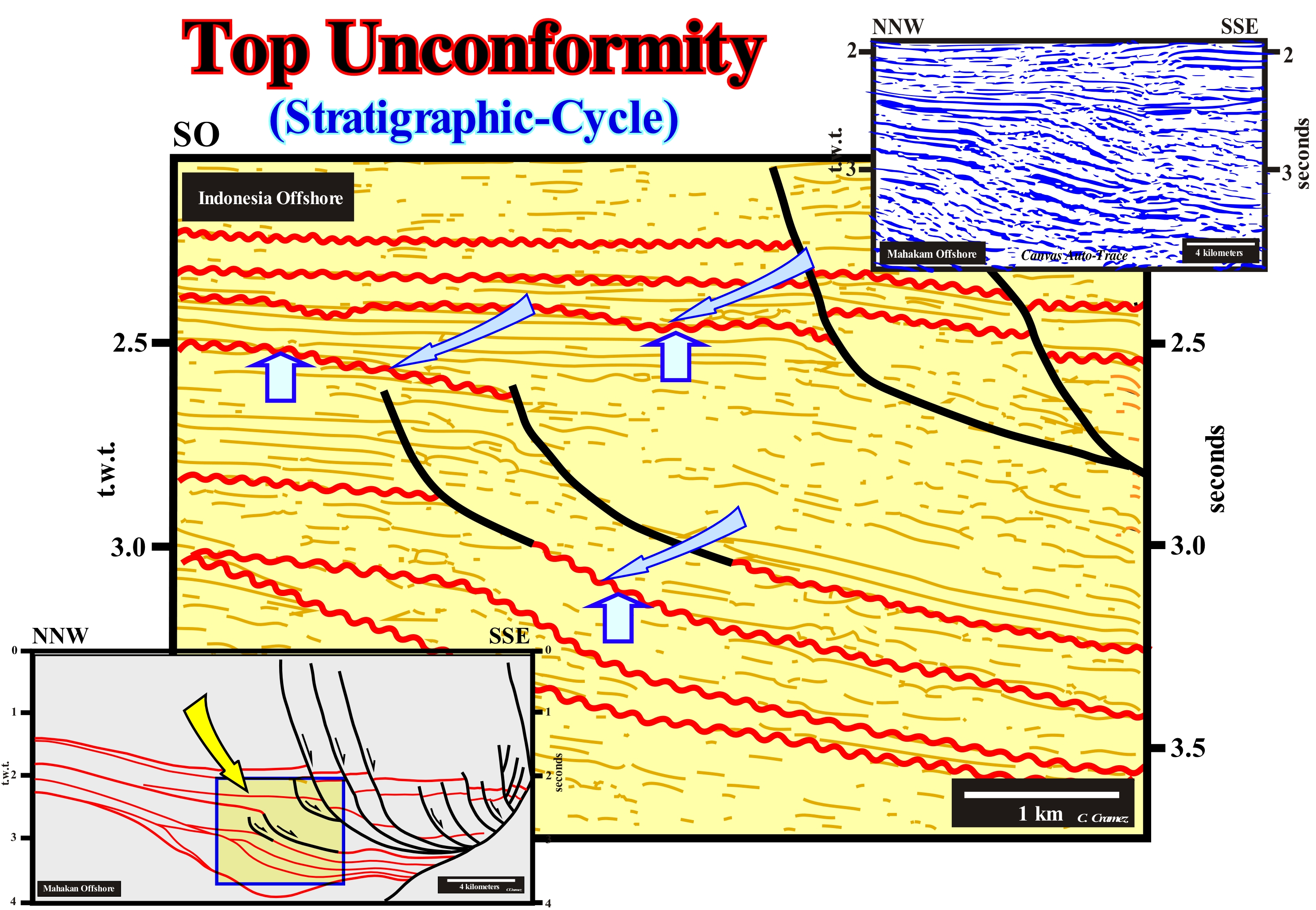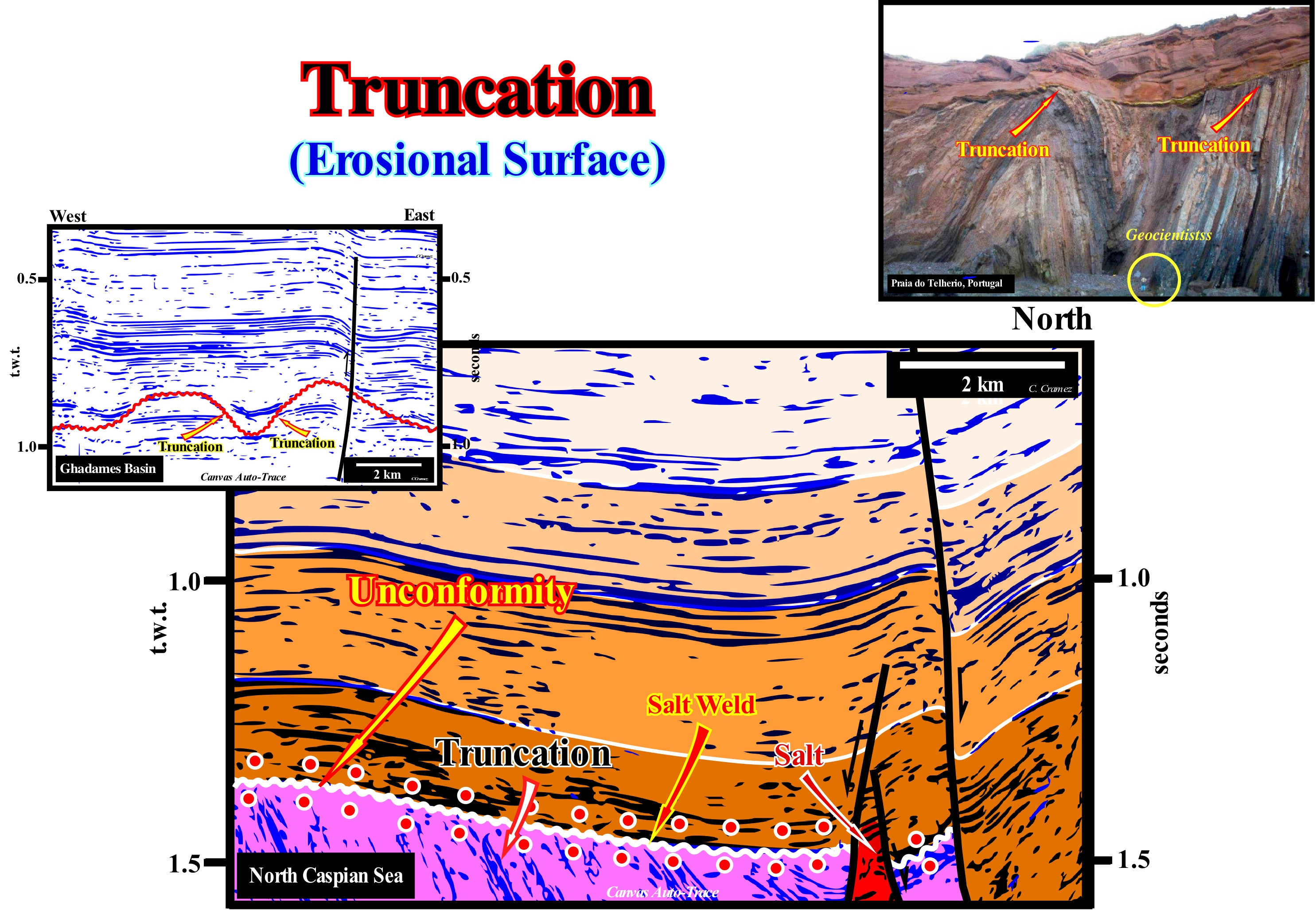 On this tentative geological interpretation of a Canvas auto-trace of a detail of a northern Caspian Sea seismic line, the terminations of the reflectors underlying the unconformity (white wavy line) are toplaps by truncation, i.e., that a part of the sediments underlying the unconformity was eroded after the sediments had been deformed. In sequential stratigraphy, an unconformity is an erosional surface induced by a relative sea level fall*, which put the sea level lower than the basin edge (continental edge when the basin has a shelf), which, in certain cases, is, more or less, coincident with the shoreline (during the 2nd stage of development of the highstand prograding wedge, of a sequence-cycle). Unconformities are, mainly, induced by eustasy (absolute or eustatic sea level changes) and not by tectonics. The sediments have to be exhumed to undergo the action of erosive agents (gravity, rain, wind , ice, rivers, etc.). However, unconformities may be tectonically enhanced and create, what certain geoscientists call angular unconformities. A shortening or a lengthening of the sediments can not produce an unconformity (erosional surface) if the sediments are not exhumed. Just when there is a significant and regional erosion, i.e., when the sediments are exhumed, an unconformity is developed. This is, easy, corroborated in salt basins, where the lateral or vertical flow of the salt deforms (lengthen) the overburden without creating an unconformity, i.e., without the overlying sediments being eroded. Between the infra and suprasalt sediments a tectonic disharmony (not to be confused with an unconformity) is formed. The tectonic disharmony which reaches its paroxysm when the salt layer is totally evacuated forming a salt weld (surface that puts in contact strata originally separated by an autochthonous or allochthonous evaporitic level) which corresponds to a negative structure resulting from the partial or total outflow or expulsion of the salt horizon). In the field or in well cores, a salt weld is, mostly, recognized by an insoluble, more or less, brecciated residue with halite pseudomorphs. Such a residue is too thin to be visible on seismic data, in which it is underlined by a tectonic disharmony. One of the characteristics of a salt welding is presence of tectonic inversions on the salt overburden. On this tentative geological interpretation, it is evident that the unconformity underlined by the white wavy line, which in this particular case coincides with a salt weld was tectonically enhanced (lengthening, followed by a shortening). The area where the seismic line was shot belongs to a sedimentary basin characterized, at the geological point of view, by the presence of a thick Permian saliferous interval (Hungarian, 258/263 Ma) that induced an important salt tectonic. At petroleum exploration point of view, this area is well known due to the recent (2000) discovery of a giant field (Kasaghan), whose reserves (recoverable) seem to be quite important, which is, probably, sufficient to counterbalance the high SH2 content and climate conditions the area. The lateral and vertical flow of salt, deposited on the Artinskian (263 / 268 Ma) shaly source-rocks, deformed and raised (extension, lengthening) the Triassic sediments, which were. partially, eroded before being covered by Jurassic marine sediments. Later, the whole set was shortened (compressed) by a regional compressional tectonic regime associated with the closure of the Tethys Sea (former sea between the NE of the Gondwana small supercontinent and SE of the Laurasia small supercontinent , which replaced the Paleo-Tethys ocean, since the expansion of the Tethys Sea forced the Cimmerian plate to collide with the Laurasia, to, finally, the Tethys Sea replace, completely, the Paleo-Tethys.