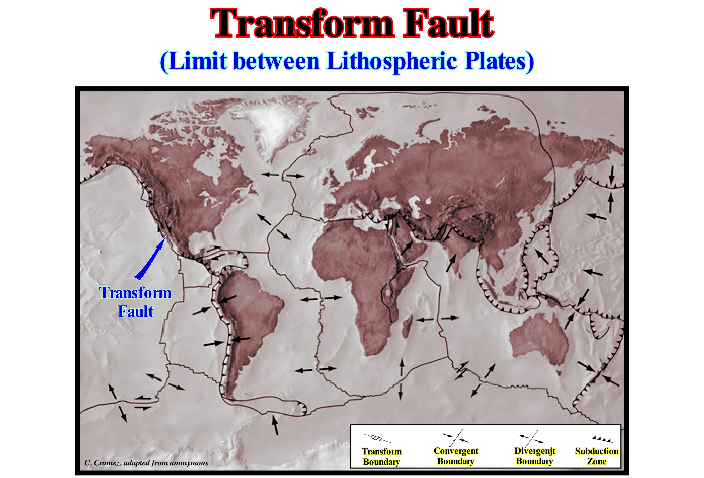 On Earth, the lithospheric plates are in constant motion. They move relative to one another with speeds varying from 2.5 to 5/7 centimeters per year. The movement of the plates occurs in the oceanic ridges, transform faults and subduction zones and can produce earthquakes and volcanic eruptions that can cause tsunamis. In certain subduction zones, the less dense lithospheric plate (usually the overriding plate) may, abruptly, move upwards due to the pressure exerted by the heavier descending plate. This abrupt displacement, as illustrated in this scheme, can produce an earthquake. The focus of the earthquake is the point or area where the first rupture occurred and where seismic waves are generated, while the earthquake's epicentre is the bottom point of the sea (or the surface of the earth) above focus. When a portion of the overriding lithospheric plate is uplift, the released energy is transferred to the sea-water, which pushes the water above sea level. Tsunamis can be said to be very long (3 minutes and 3 hours), of high wavelength (sometimes over 200 km), low amplitude (centimeters to decimetres) and with a high velocity (speeds between 600 and 800 km/h are frequent) produced by coastal or submarine earthquakes. A tsunami of 200 km wavelength and 25 cm amplitude displaces 50,000 tons of water per meter of the shoreline. The damages are, particularly, severe when the water converges to a relatively narrow bay, which can create a wave height (h) of the order of 50 meters. The velocity of the wave (v) is a function of the wavelength (L). If the water-depth is greater than the wavelength (l), the velocity v is equal to (gL/2π)1/2 which is equal to (1.56 L)1/2, where g is the acceleration of gravity (9.81 m/s2). If the water-depth is less than the length of water, the speed is equal (gh)1/2. However, do not forget that the velocity of the wave, actually, means a phase velocity, since what moves is not the water, but the crest and the trough of the wave, that is to say, the phase of the surface of the water.