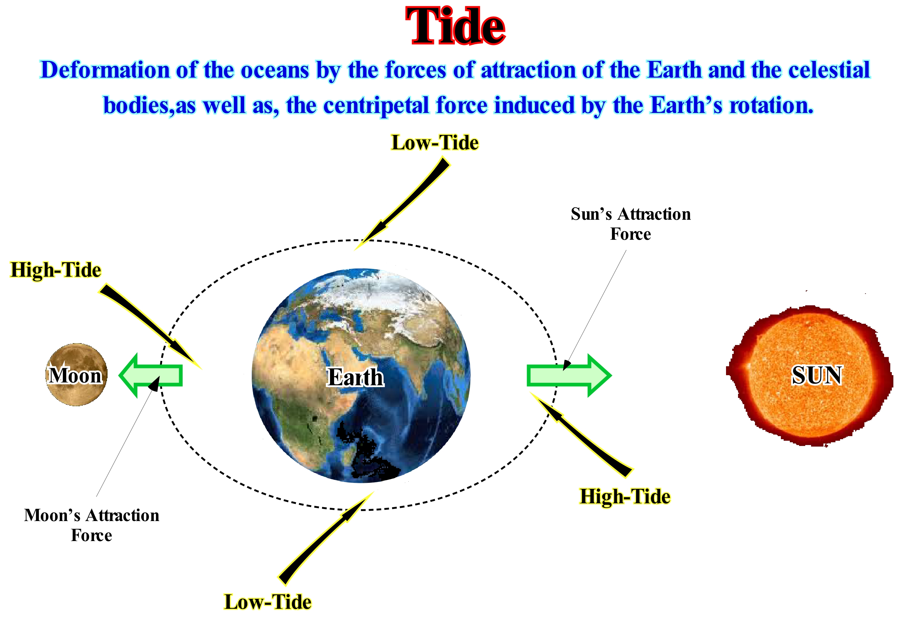 In an ideal terrestrial gravitational field, that is, without interference, the Earth's surface waters would suffer an identical acceleration towards the centre of terrestrial mass, being thus in an isopotential situation. But due to the existence of bodies with significant gravitational fields interfering with that of Earth (Moon and Sun), they cause accelerations that act on the Earth mass with different intensities. As the gravitational fields act with an intensity inversely proportional to the square of the distance, the accelerations felt in the different points of the Earth are not the same. The acceleration caused by the Moon has, significantly, different intensities between the points closest to and farther from the Moon. In this way, the oceanic masses that are closest to the Moon undergo an acceleration of intensity, significantly, higher than the ocean masses further away from the Moon. It is this differential that causes the changes in the height of the masses of Earth's surface waters. When the tide is at its acme it is called high-tide, or full-tide. When the tide is at its lowest level it is called low-tide. On average, the tides fluctuate in a period of 12 hours and 24 minutes. Twelve hours due to Earth's rotation and 24 minutes due to lunar orbit. The height of high and low-tides (relative to mean sea level) also varies. In the new and full moon, the gravitational forces of the Sun are in the same direction as those of the Moon, producing higher tides, called tides syzygies. On the waning crescent moon, the gravitational forces of the Sun are in different directions than those of the Moon, cancelling part of them, producing lower tides called quadrature-tides. High-tide is maximum level of a full-tide. Low-tide is minimum level of an ebb-tide. Stack water or tidal recharge, which occurs between tides, is a short period in which there is no change in level height. Flood-tide is the period between a low-tide and-the following high-tide, when tide height increases. The Ebb (falling) is a period between a succession of high-tide and the following low-tide, when the height of the tide decreases. Tidal height is the height of the water level, at a given moment, relative to the zero hydrographic plane.
