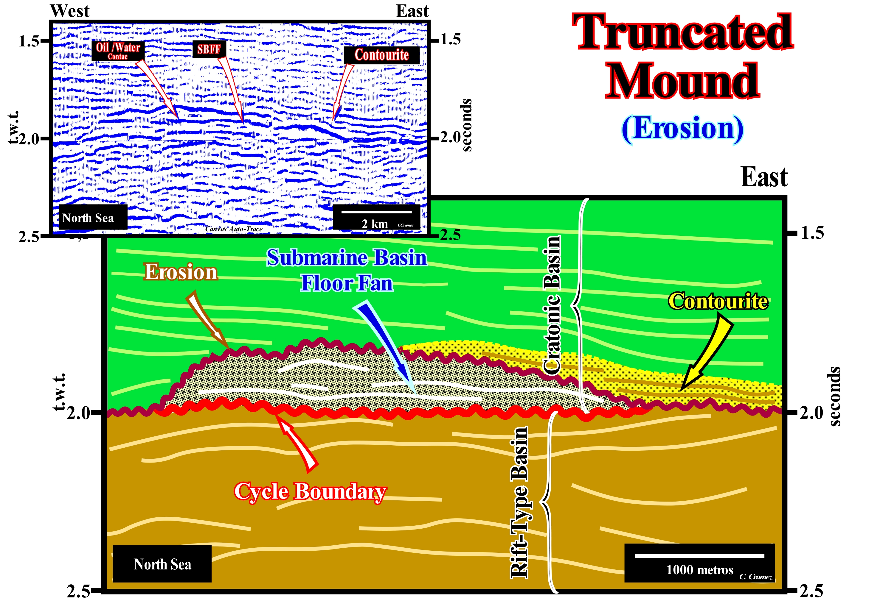 On this tentative geological interpretation of a Canvas auto-trace of a detail of a North Sea seismic line, it is, easy, to recognize that the original morphology of the submarine basin floor fans (SBFF, coloured in grey) was very affected by the erosion of the contour currents (which flow along isopycnic lines, i.e., of equal density, more or less, parallel to the bathymetric contours of the lower part of the continental slope and which is, often, responsible for the deposition of contourites), which created a truncated mound. Above the unconformity (coloured in red), which separates the rift-type basin, characterized by a differential subsidence (halfgraben structures), from the North Sea cratonic basin, which is characterized by thermal subsidence (isotherms reequilibrium), submarine basin floor fans were deposited. The causes of the subsidence may be a sedimentary loading, a tectonic activity or a thermal contraction during the cooling of the crust. A thermal subsidence corresponds to a cooling of the Earth's surface. In fact, sedimentary basins are not produced by sedimentation, but by tectonic and thermal processes. When a basin forms by lengthening in association with a positive thermal anomaly (induced by a tightening of the isotherms), normal faults control the available space for sedimentation, but this does not seem sufficient to develop a cratonic basin such as North Sea. A deep lithospheric cooling (tightening of the isotherms) is necessary which induces a thermal contraction in order to recover the isostatic equilibrium, which causes, naturally, a thermal subsidence that normally plays the main role in the evolution of the basin after the tectonic subsidence cease. These turbidite fans, deposited during the significant fall of relative sea level (local sea level referenced to the base of the sediments or to the sea floor and which is the result of the joint action of the tectonics and the absolute or eustatic sea level referenced to the Earth's centre), which induced the unconformity between the two sedimentary basins, have a, more or less, parallel internal configuration. Contour currents that eroded a large part of the submarine basin floor fans, laterally and vertically, redeposited the eroded sediments as contourites (coloured in khaki). A part of these contourites even fossilize the submarine basin floor fans. Several petroleum exploration wells have crossed not only the contourites but the submarine basin floor fans as well. The logs of these wells, and especially the dipmeters, corroborate the, more or less, parallel internal configuration of submarine basin floor fans (coloured in grey), suggested by the seismic data, with maximum values of the dip of 1°, practically, in all directions. The results of the dipmeter, obtained in the contourites, show, clearly, the difference between these two types of sedimentary anomalies, since they suggest dips of about 10-15 ° to East. Another important difference for the oil industry between these two sandy bodies is that the reservoir-rocks associated with the submarine basin floor fans, generally, have an important clayey matrix, whereas it does not exist in the contourites, which, on the other hand, are, particularly, rich in heavy minerals, such as zircon, allanite, etc. It should be remembered the flysch is a clastic sedimentary deposit consisting of an alternation of sandstone and marl accumulated in an oceanic basin, in the course of an orogenesis, in particular in the Swiss Alps. It corresponds, practically, to what today is called, in the sequential stratigraphy, turbidite deposits and, particularly, to the submarine basin floor fans. In the 1960s, Bouma recognized in the flysch of the Swiss Alps, channels filled by sands, with no clayey matrix, but with a great amount of heavy minerals, that some peasants exploited economically. Bouma considered that these channel fills were the result of erosion produced by contour currents (bottom currents flowing parallel to the base of the continental slope) and that the fillings, which he called contourites, were directly or indirectly associated with erosion of the flysch.
