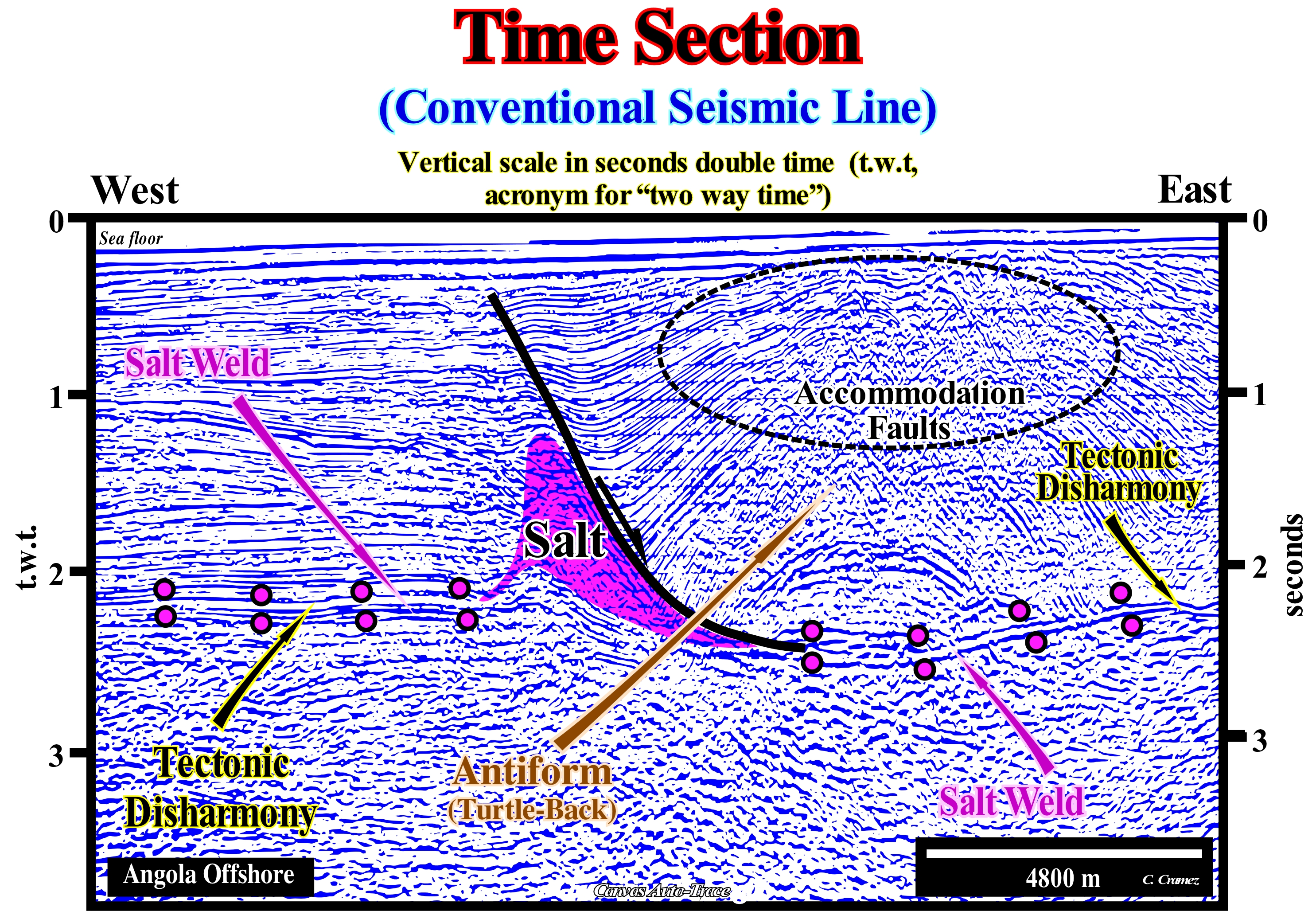 (*) Anderson's theory of failure suggests that in the field or in a 1: 1 seismic line, the slope of the fault planes (surfaces of mechanical discontinuities) is about 30° in the normal faults of, more or less, 60° for inverse faults and more or less 90° for strike slip faults. This means, among other things, that there are no normal vertical faults. In very compressed seismic lines (very large horizontal scale), as is the case in this interpretation attempt, the normal fault planes are almost vertical.