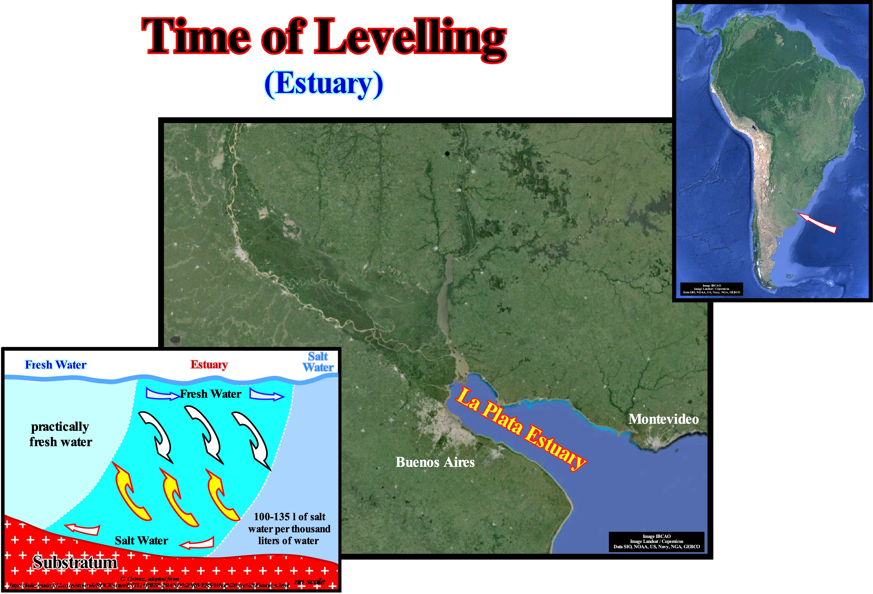 Based on the physical processes responsible for their formation, the vast majority of estuaries can be grouped into four geomorphological categories: (1) Sea level rise ; (2) Sand and sandbank movement ; (3) Glacial processes, and (4) Tectonic processes. Estuaries created by the flooding of the river valleys and estuaries of the coastal plain were formed by the rise in sea level during the last interglacial period (about 15,000 years ago), which flooded the river valleys that returned to their original position when sea level got down. The movement of sand and formation of barrier bars along the shoreline can block water-bodies and form lagoons or estuaries, as is the case of Laguna Madre, Texas. In colder climates, glaciers cut deep valleys into the ground. When glaciers thin, this is when they advance less, during periods of warmer weather, coastal waters fill the valley to form fjord-type estuaries, which are common in New England and Alaska. Finally, earthquakes and faults can cause rapid sinking of coastal areas below sea level and form estuaries produced by tectonics, with, for example, San Francisco Bay, California. The characteristics of water circulation can also be used to classify the different types of estuaries. The movement of water in estuaries is regulated by the ebb and flow of tides, the differences in water and wind density. Most estuaries are influenced by lunar tides, once a day (diurnal) or twice a day (semidiurne). The rise and fall of the water results in a flow of liquid out of the estuary. The estuarine circulation, usually, refers to the movement of residual water (short term) after the removal of tidal effects. The evolution of fresh and salt water within an estuary is shown in the geological sketch on the lower corner of this figure. Such geological model can be applied to the La Plata river estuary between Argentina and Uruguay.