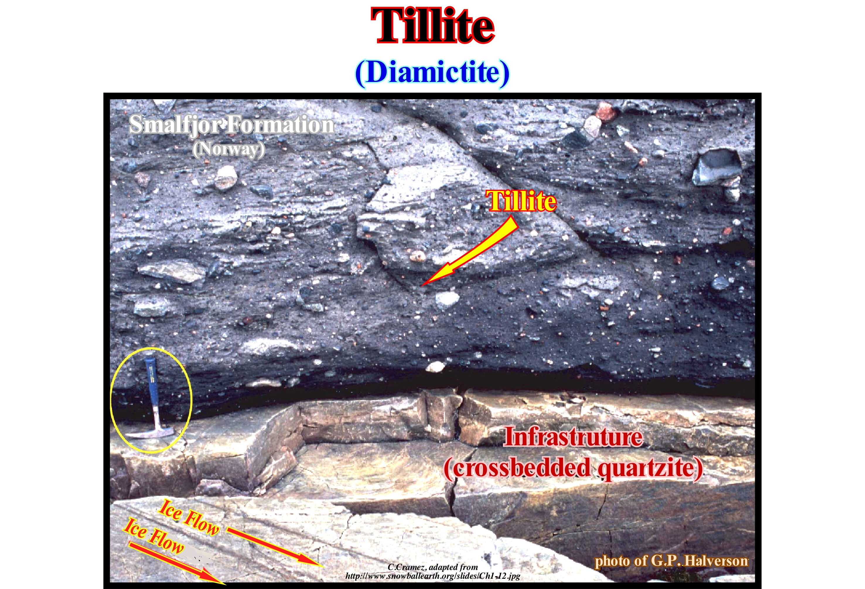 This outcropping near Biggenjarga, on Varanger peninsula (northern Norway), was interpreted in 1981 by H. Reusch (Norwegian Geological Survey), as a illite overlying a subglacial pavement, on top of which the slickensides induced by the base of the glacier (roughness and small starter figures) indicate the direction of the ice flow. He strongly suggested the illite of the Smalfjor formation corresponds to a lithiated till. It was this type of rocks, of Paleozoic age, that were found on both sides of the South Atlantic Ocean, that is, in Brazil and Africa, that reinforced the evidence of the oceanic expansion suggested by the geometries of the coastlines and by the distribution fossil plant Glossopteris (gymnosperm plant, with bare seeds). The tillites also provided hard-to-refute evidence of Precambrian glaciation (Terrestrial Snowball*). The distribution of tillites is difficult to explain in terms of the present geography of the world. However, it is important not to forget that there are about 400 Ma, North Africa was located to the right of the South Pole and that later about 300 Ma, South America, the southern part of Africa, Madagascar, India and Australia were agglutinated near the South Pole. When Pangea fractured all continents (except Antarctica) migrated northward, and much of the ice disappeared from the Earth's surface. As North America and Eurasia are, currently, jammed together around the north pole, it can be said that another glaciation is, certainly, in progress. The tillites, and particularly the tills, often contain alluvial deposits of precious stones and ores that are plucked from the rocks of the substrate during the flow of glaciers. Diamonds have been found in these rocks and sediments not only in the United States (Wisconsin, Indiana, etc.) but also in Canada. Prospectors when they encounter diamonds or gold in this type of sediment following the traces of flow upstream in order to find the diamond source- rocks, such as kimberlites.