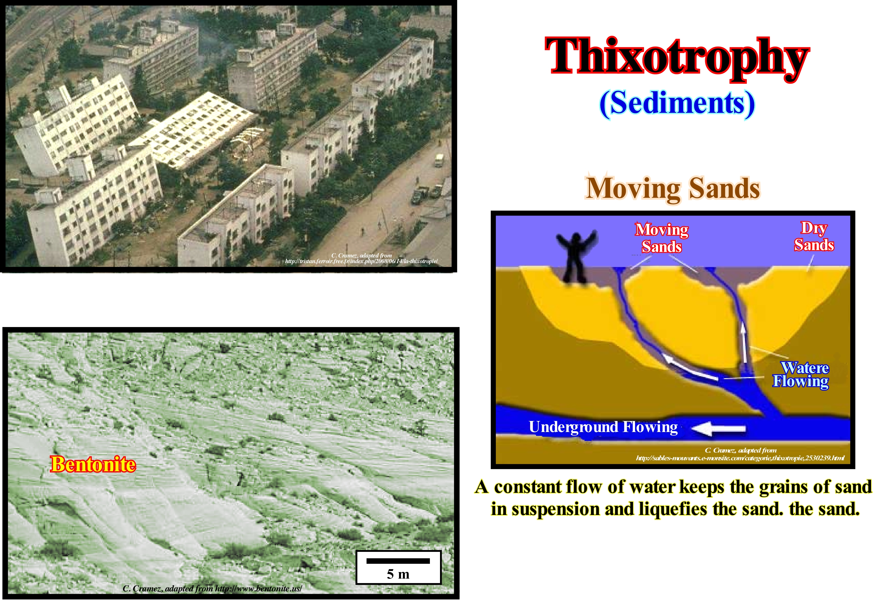 In nature, there are certain mixtures that are thixotrophic. Certain types of clay, for example, are thixotrophic. The shales which are formed of clay, contain solid particles and water molecules, which are contained in a relatively rigid structure. Often, certain dwellings are built on rocks without major problems. However, when an earthquake occurs, for example, even of weak amplitude, the shales, due to agitation, become thixotrophic and the structure of the particle decomposes and disappear like a house of cards. The water molecules are free to move and provide the lubrication, which turns the shales into a liquid state and, in most cases, the houses fall. Ordinary mud, sometimes, also acts this way. If a person is careful to put his feet on the hard, dry surface of the mud, he can cross it without problem. But if she twists her foot as she walks, or if she leans very tightly, her shoes or boots are buried in a liquefied mud. In geology, observed behaviour, for example in thixotrophic shales can have dramatic consequences in the case of earthquakes, as was the case in Niigata, illustrated in this figure. Such behaviour is also used in the mud of oil exploration wells to facilitate drilling work. The moving sands correspond to a natural phenomenon, which most people have seen on film or television, work by the same principle of thixotrophic. However, unlike what happens in the movies, nobody disappears into a moving sand. The formation of moving sand occurs when fine and loose sand particles are subjected to an upward flow of water, which fills the spaces between the grains, reducing the friction between them, which makes the sand behave like a liquid. The viscosity of the moving sand increases with abrupt movements (thixotrophy). So if you get into moving sand you should move slowly and try to float, which is very easy, since the density of a moving sand is much greater than that of salt water.
