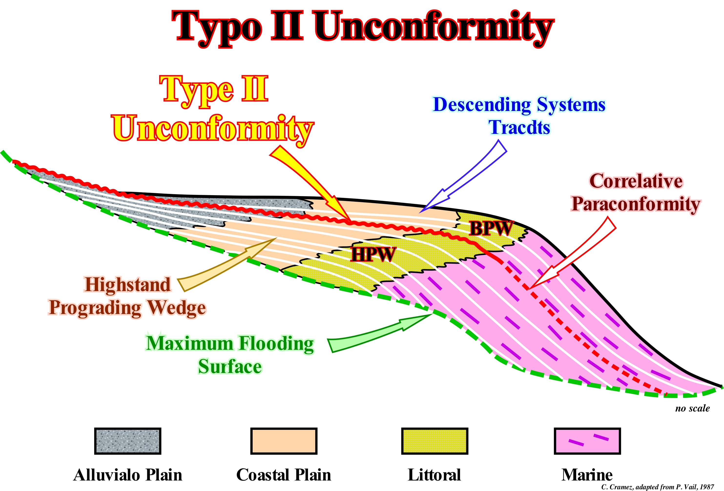 In this scheme, a Type I unconformity separates two sequence-cycles (stratigraphic cycles induced by a 3rd order eustatic cycle, i.e. cycles with a time-duration between 0.5 My and 3-5 My). It is characterized not only by the onlapping of overlying sediments, but also by the toplaps (by erosion or non-deposition) of the underlying sediments. The lower sequence-cycle is incomplete. It is represented only by the highstand systems tracts group (HSTG) which forms the progradational subgroup, i.e., the highstand prograding wedge (HPW), which at the base is limited by the flooding surface (green coloured dashed line) that limits it from the retrogradational lower subgroup, that is, the transgressive interval (TI) that is not represented in this scheme. Within the highstand prograding wedge (HPW), chronostratigraphic lines have a sigmoid geometry. In this sketch, it is easy to see that each of the sequence-paracycles that form the highstand prograding wedge (HPW) corresponds to a sedimentary systems tracts along which different depositional systems characterized by a lithology with a fauna, more or less, typical deposited in a given sedimentary environment. Also, it is not difficult to verify that the chronostratigraphic lines intersect the facies lines (lithology) defined by the same lithology of the different sequence-paracycles. Thus, in the highstand prograding wedge (HPW) of the lower sequence-cycle, different depositional systems with lithology and sedimentary environments can be highlighted, which from the continent seaward are: (i) Alluvial Plain (often, the topography of the coastal plains of the rivers has the form of a fan, which means that the bed of the river can move, easily, flooding areas, relatively, far from the main bed) ; (ii) Coastal Plain (associated with a set of factors such as relative sea level changes, coastal drifting currents, juxtaposition of littoral barriers bars, etc.) ; (iii) Littoral (portion of the marine region that covers the area affected by the high-tide and low-tide) and (iv) Marine. During the highstand prograding wedge (HPW), which is deposited when the relative sea level* is decelerating (there are no relative sea level fall between eustatic paracycles), the basin edge, which initially did not coincide with the shoreline (the basin had a shelf) from one determined, when the basin edge was, more or less, coincident with the shoreline, the basin has continental shelf. Since the relative sea level stopped rising and began to descend, the coastal plain was, relatively, lifted and the upper part of the continental slope was exhumed creating an erosion surface, that is a Type I unconformity. Erosion has, dramatically, increased the terrigeneous influx, which, since it reaches the continental slope, is carried by gravity to the sea floor, where the sedimentary particles are deposited in the form of submarine basin or slope fans (sedimentary intervals deposited during significant of relative sea level falls), thus beginning a new sequence-cycle. As long as the relative level of the sea begins to rise, the coastal onlaps, gradually, fossilize a Type I unconformity. The upper sequence-cycle is also incomplete. However, unlike the lower sequence-cycle, it is only constituted by the sedimentary systems tracts subgroups that form the lowstand systems tracts group, namely: (i) Submarine basin floor fans (SBFF) ; (ii) Submarine slope fans (SSF) and (iii) Lowstand prograding wedge (LPW). The former are, easily, recognized by their aggradation pleasing geometry. The submarine slope fan, which in this sketch are grouped with the submarine basin floor fans, are recognized, mainly in the seismic lines by the gull-wings structures, whereas the lowstand prograding wedge is, easily, recognized, by its progradational geometry. To conclude, it can be said that with Type I unconformity, there are, always, associated, in the deep basin, submarine basin floor and slope fans, which is not the case in Type II unconformities, as can be seen in the geological sketch shown in the next figure.