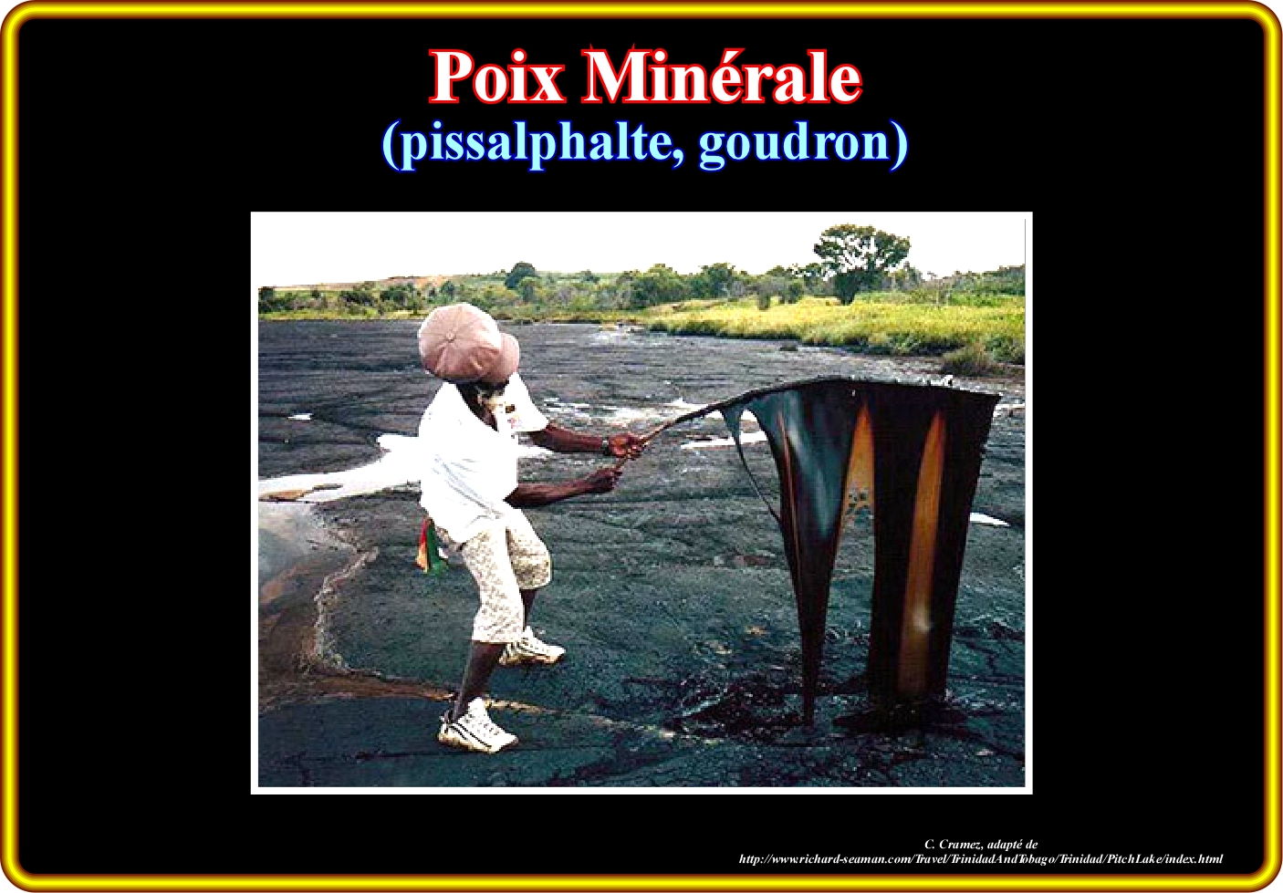 Bien que le terme "pitch", en anglais, est utilisé de manière interchangeable avec le terme "tar". "Pitch" est considéré comme plus solide que «tar». Le terme pitch minéral est utilisé pour désigner un pitch résultant d'un produit minéral. En fait, les britanniques, pas nécessairement les géoscientistes, utilisent terme pitch pour désigner toute une série de liquides visqueux qui semblent solides et qui peuvent être produits soit à partir de plantes soit de minéraux comme à partir d'hydrocarbures fossiles. Le terme « tar » est défini (Wikipedia) comme une résine noire visqueuse produite à partir du bois et racines du sapin par distillation destructive sur pyrolyse. Ainsi, un poix minérale (pissalphate, goudron) est un pitch qui a été produit à partir d'un d'hydrocarbure fossile, comme c'est le cas illustré sur cette figure (Trinidad). En France, les termes goudron, breu, asphalte et bitume sont souvent considérés comme synonymes. Dans certains dictionnaires le terme goudron correspond à la substance noire et très visqueuse dérivée du charbon (pitcher une table, c'est-à-dire l'application de goudron ou de poix minérale sur la surface d'une table) qui est en contradiction avec la définition des anglais qui considèrent le pitch est plus solide que le bitume et goudron. Cependant, les même dictionnaires considèrent que le pitch minérale ou résine (pitch résultant de plantes ou pitch organique) est synonyme de : (i) Goudron qui est une substance visqueuse, foncée, d'odeur pénétrante, plus ou moins, liquide obtenue par distillation de la matière organique tel que du charbon, bois, huile, etc. ; (ii) Breu (colophane ?) qui est une substance solide très très foncée, qui est obtenu par distillation du goudron de houille, huiles ou résines et (iii) Bitume qui est une substance minérale de consistance variable, riche en carbone et hydrogène, qui se trouve dans la nature et qui brûle avec une flamme épaisse, et est provient de la décomposition des matières organiques. La meilleure façon, peut-être, d'utiliser de terme pitch minérale serait d'utiliser pitch minéral quand l'origine est minéral et pitch organique ("tar") lorsque l'origine est végétale. Quoi qu'il en soit il faut toujours éviter d'utiliser ces termes. Toutefois, quand utilisés, ces termes doivent être définis auparavant.
