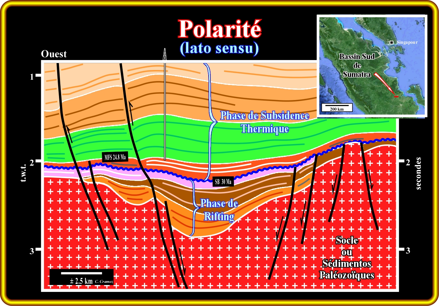 Dans cette tentative d'interprétation géologique d'une ligne sismique de l'onshore de Sumatra (Indonésie), les failles ont une polarité opposée, c'est-à-dire, qui elles inclinent dans des directions opposées. A l'origine, ces failles étaient normales et se sont développées pendant la phase de rifting su bassin derrière l'arc du sud de l'île de Sumatra. Cependant, plus tard, au cours de la phase de subsidence thermique, certaines d'elles ont été réactivées comme des failles inverses, ce qui a créé des inversions tectoniques bien marquées sur cette tentative d'interprétation. Cette interprétation suggère l'histoire géologique suivante : (i) En association avec la zone de subduction de type-B situé à l'ouest de l'île de Sumatra, la croûte continentale de la plaque lithosphérique chevauchante a été allongée par des failles normales avec polarité opposée ou de convergence ; (ii) Les failles normales ont créé des bassins de type-rift, c'est-à-dire, des hémi-grabens qui ont été remplis en grande partie par des roches lacustres riches en matière organique (roches-mères potentiels) ; (iii) La subsidence différentielle qui est à l'origine de la formation des bassins de type-rift, a produit (cause ou effet) une montée des isothermes (anomalie thermique) ; (iv) Plus tard, les isothermes se sont approfondies et ont rétablit l'équilibre thermique, ce qui signifie que le subsidence différentielle a été remplacée par une subsidence thermique ; (v) La subsidence thermique en association avec l'eustasie (variations globales du niveau de la mer) ont crée, au-dessus de croûte continentale et des bassins de type-rift , un bassin cratonique (phase de subsidence thermique du bassin derrière l'arc) ; (vi) Ce bassin est rempli par des sédiments marins, au cours de l'épisode basal transgressif, et surtout, non-marins, durant l'épisode régressif supérieur ; (vii) les intervalles sédimentaires avec des caractéristiques pétrophysiques de roches-réservoirs (récifs et grès) et les roches-de-couverture (argiles) se sont déposées, principalement, au cours de la phase de subsidence thermique ; (viii) Comme ce bassin est situé à l'intérieure la mégasuture Méso-Cénozoïque (contexte tectonique globalement compressif), à partir d'un certain moment, les sédiments ont été raccourcies et les anciennes failles normales ont joué comme des failles inverses, ce qui a produit des magnifiques inversions tectoniques, dans lesquelles les points structuraux bas deviennent des point hauts et les points hauts deviennent structuralement bas, comme illustré ci-dessus.