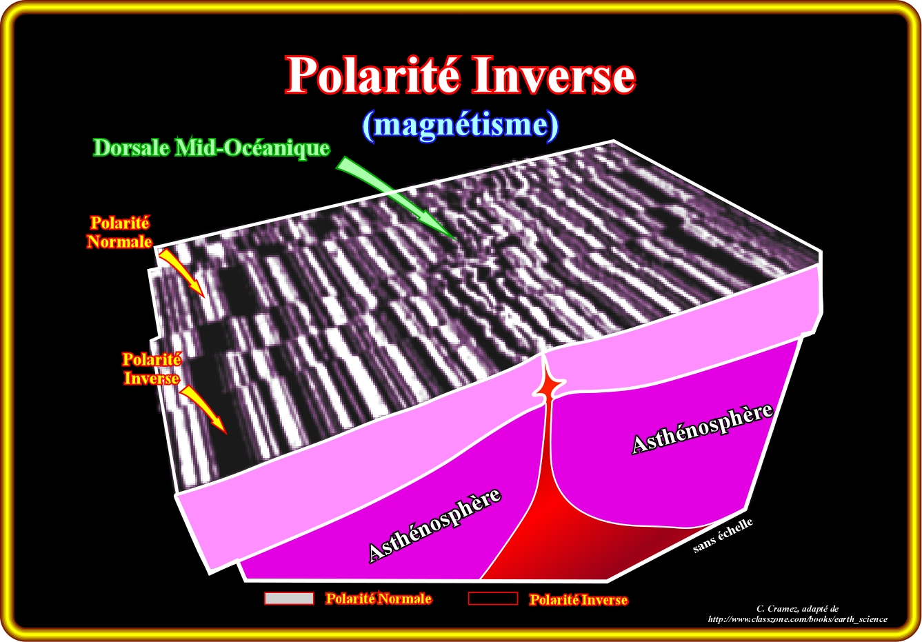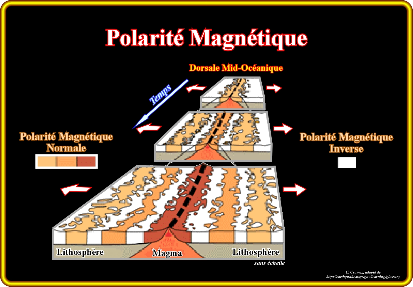 La position du champ magnétique terrestre change avec le temps. Actuellement, le pôle magnétique nord est proche du pôle Nord de la Terre, une condition géologique qui est appelé polarité normale. Les périodes de temps pendant lesquels le pôle magnétique nord se trouvait près du pôle Sud de la Terre sont appelées des périodes de polarité inversée. La détermination des différentes polarités est possible une fois que quand les laves se solidifient, dans les dorsales médio-océaniques, les minéraux contenant du fer s'orientent en fonction du champ magnétique terrestre, ce qui signifie qu'ils enregistrent, pour ainsi dire, l'orientation du champ magnétique terrestre au moment où elles se solidifient. De manière erratique, plus ou moins, les 500 ky, le champ magnétique terrestre change de polarité, dépensant peut-être quelques milliers d'années à disparaître et à réapparaître dans la direction opposée. En effet, en association avec l'expansion océanique, à partir des dorsales médio-océaniques, se forment des bandes de la croûte avec des magnétisations différentes, comme indiqué dans le schéma illustrée sur cette figure. Ce fait a permis aux géoscientistes d'établir une stratigraphie magnétique sur la base des périodes de polarité normale et inversée. Toutefois, en superposition aux grands époques magnétiques, il y a de courtes périodes d'inversion de la polarité magnétique, appelés événements magnétiques qui peuvent durer entre quelques milliers d'années et 200 ky. Les roches qui actuellement se forment dans les crêtes des dorsales médio-océaniques sont, normalement, magnétisées, une fois qu'elles se solidifient pendant la présente polarité magnétique qui est considérée comme normal. Cependant, n'oublions pas que les roches magnétisées, correspondant à l'époque qui existait à environ un million d'années, ont été déplacées à une certaine distance de la dorsale. Si l'expansion océanique a été de 2 cm par an, ces roches sont maintenant à environ 20 km de chaque côté de la dorsale, ou à 40 km si l'expansion océanique a été de 4 cm par an. Selon ce principe, les géoscientistes ont déterminé que le taux d'expansion océanique le plus fort est dans la partie orientale de l'océan Pacifique, où il est d'environ 10-12 cm par an, tandis que dans l'Atlantique, elle est seulement de 2 cm par an.