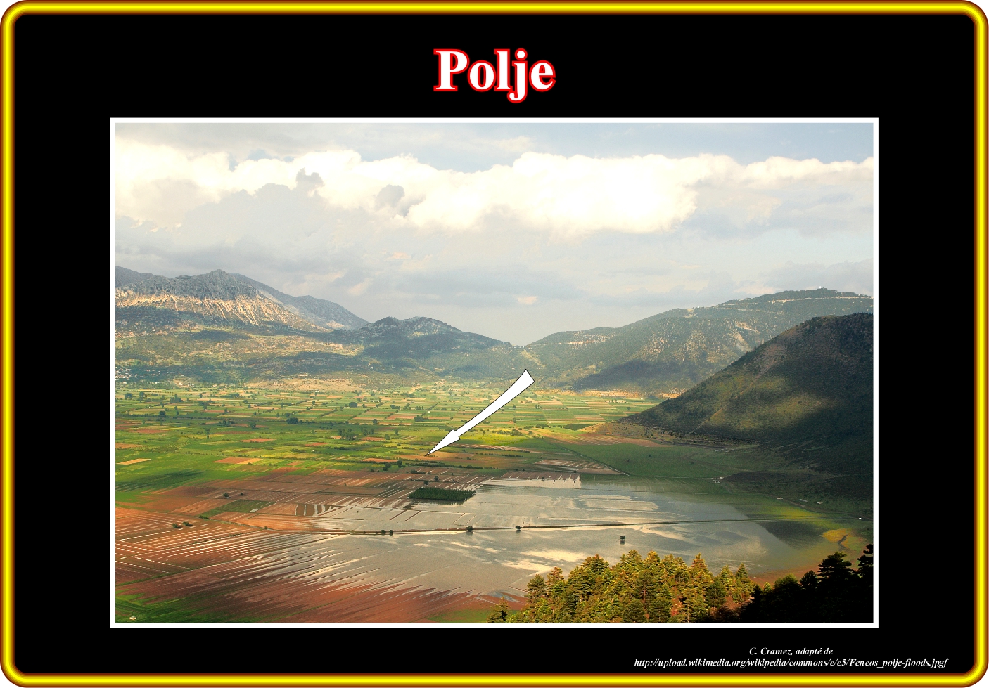 Comme l'illustre cette figure, un polje est une dépression fermée ou ouverte dans le karst, avec des dimensions significatives et des versants avec un inclinaison forte et brusque et un fond, généralement, plat recouvert par de la terra rossa et alluvions. Le bassin versant a un drainage endoréique et centripète. Les poljes peuvent rester à sec, être traversés par un cours d'eau ou être inondée en permanence ou temporairement. Avec la montée du niveau phréatique, ils peuvent être alimentés par exsurgences ou par pornors (ouvertures naturelles dans les zones karstiques qui communiquent avec un réseau de galeries qui peuvent servir d'évier ou exsurgence en fonction de la nappe phréatique) qui peuvent fonctionner comme des éviers quand le niveaux phréatique descend. Parfois ils ont des hums (relief résiduel calcaire qui s'élève d'une surface de corrosion karstique et qui peut avoir des formes diverses, généralement pyramidales, avec un sommet aiguë, plat, massif ou arrondie) qui sont une forme de relief rocheux escarpé, isolé et dispersé à l'intérieur des poljes. Un polje, en général, est une dépression fermée qui peut avoir environ 3 km de large et de 10 km de long. Il s'agit de plaines calcaires qui ont commencé à se détériorer dans le Tertiaire, quand le climat était chaud et humide et il y avait beaucoup d'eau avec une végétation abondante et une grande quantité de CO_2 due à la décomposition. Ainsi, certainement, il y a eu une carbonatation puisque l'eau était acidifiée par le CO_2 de l'atmosphère. Ces conditions qui ont provoquée une activité, plus ou moins, importante en fonction de la région du globe considérée, ont produit une dissolution totale du calcaire par la combinaison du carbone de l'eau et du calcium des roches, formant une solution d' eau chargée de calcium et dioxyde de carbone. Notons que les poljes sont reliés aux aquifères par des voies naturelles. Ces résurgences ou remontées d'eau (endroits où les courants d'eau souterraine réapparaissent à la surface du sol après avoir disparut en amont de la nappe phréatique) forment des cours d'eau ou des inondation des dépressions associées.