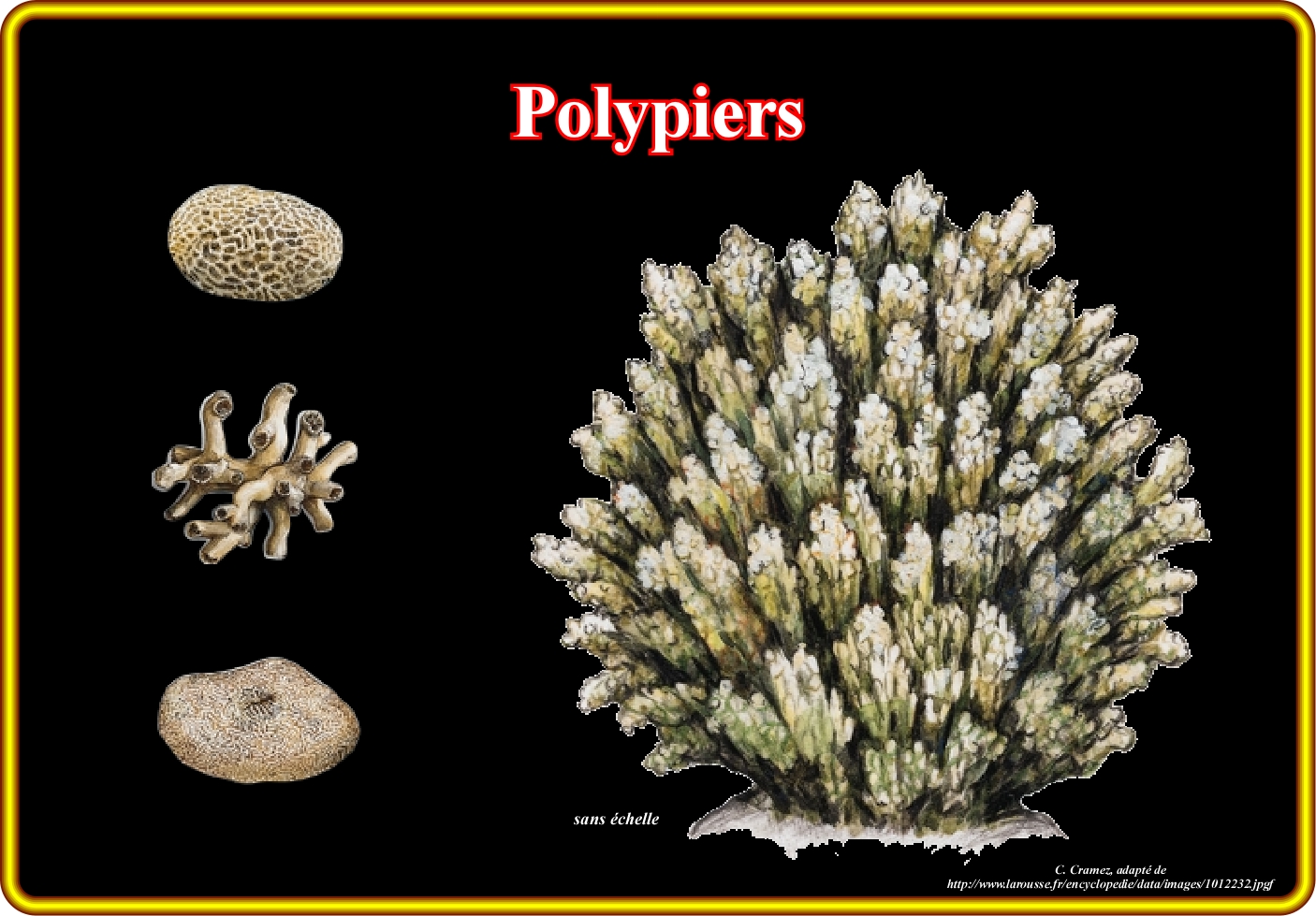 Construction biogénique faite par coalescence des squelettes externes de coraux qui vivaient en colonies. Animal ou colonie animale formée par la réunion des polypes.