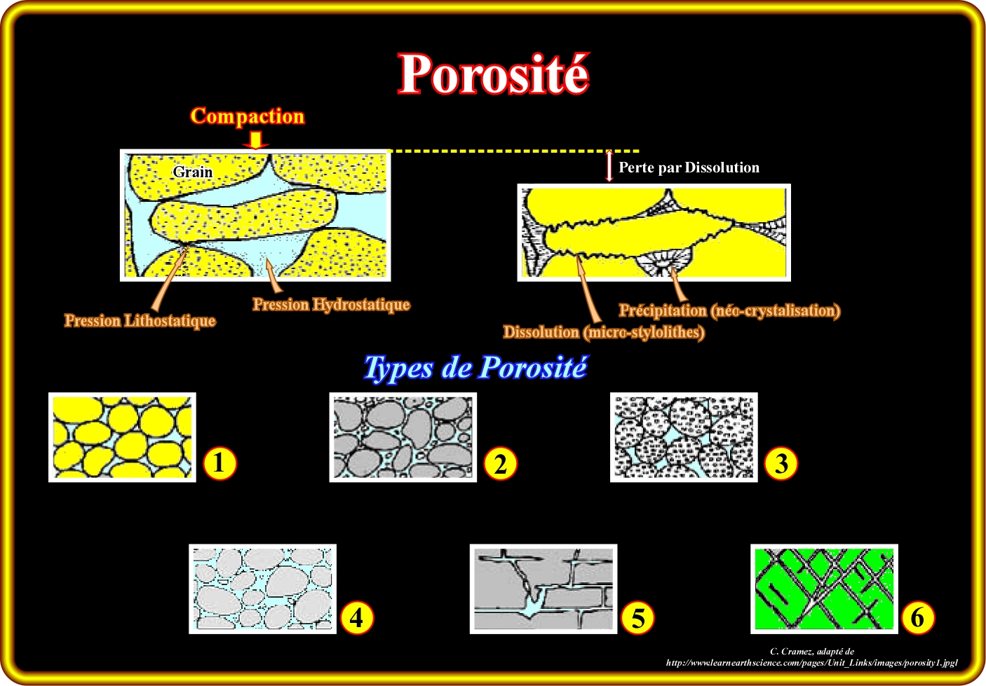 Comme l'illustré sur cette figure, la porosité d'une roche peut être définie soit comme le volume des pores (espace entre les grains) ou comme le volume d'une roche contenant des fluides (eau, pétrole ou gaz). La porosité peut être le résultat du dépôt (porosité primaire) qui est l'espace entre les grains qui n'ont pas été entièrement compactés ou elle peut se développer par l'altération des grains (porosité secondaire), comme, par exemple, lorsque les grains de feldspaths ou fossiles sont partiel ou complètement dissous. D'autre part, il est important de différencier la porosité effective de la porosité totale. La porosité effective est déterminée par des pores qui sont interconnectés et qui permet l'écoulement de fluides dans une roche-réservoir. La porosité totale est donnée par le volume total des pores de la roche, indépendamment du fait, qu'ils sont interconnectés. La porosité totale peut être déterminée par les diagraphies électriques de densité, neutron porosité et résonance magnétique nucléaire. La porosité effective est toujours beaucoup plus petite que la porosité totale. Ce schéma illustre la compaction d'une roche et donc la perte de porosité par dissolution et précipitation (néocristalization), au fur et à mesure que la roche est enterrée sous des roches plus jeunes, c'est-à-dire, au fur et à mesure que la pression lithostatique (poids de la colonne sédimentaire) et hydrostatique (poids de la colonne d'eau) augmentent. Différents types de porosité sont illustrés dans cette figure : (1) Porosité primaire forte qui est induite par la bonne calibration des grains qui forment la roche ; (2) Porosité primaire faible qui est induite par une mauvaise calibrage des grains constituant la roche ; (3) Porosité primaire très forte qui est induite par un bon calibrage des grains, mais également par la nature des grains poreux (porosité dans les grains) ; (4) Porosité primaire très faible, quand la roche a des grains est bien calibrée, mais qui sont partiellement cimentés, autrement dit, porosité due au remplissage partiel des pores par un ciment ; (5) Porosité secondaire par dissolution et (6) Porosité secondaire par fracturation induite par la formation d'un système de fractures, en association avec un régime tectonique compressif, au cours du quel les roches sont raccourcies et soulevées.