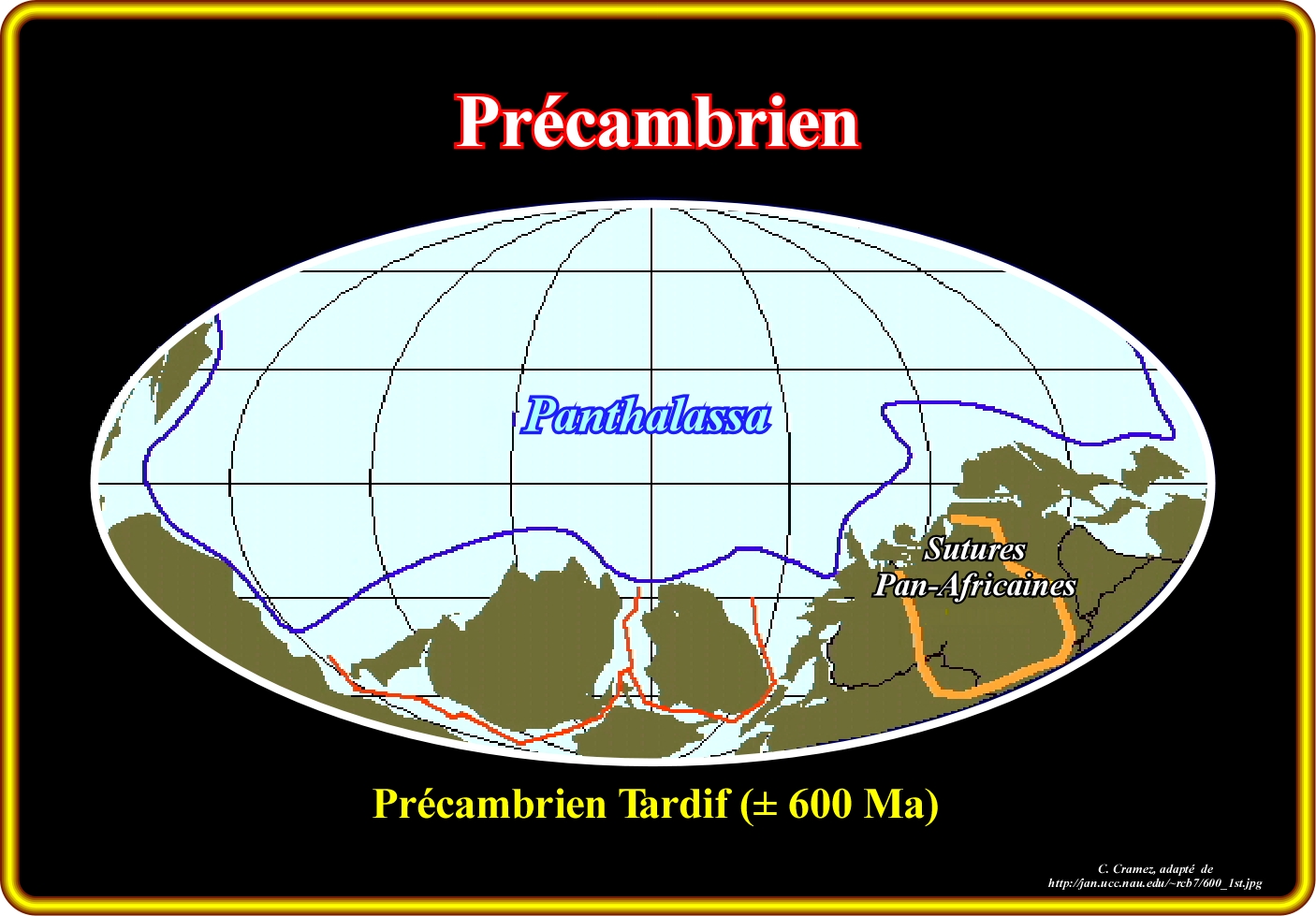 La Terre s'est formée à environ 4.5 Ga (il y a 4.5 milliards d'années), mais presque 4.0 Gy (4.0 milliards d'années) se sont écoulé avant l'apparition des premiers animaux. C'est ce laps de temps que les géoscientistes appellent Précambrien. Cependant, certains géoscientistes évitent ce terme et préfèrent considérer, avant le Phanérozoïque, trois Éons (Harland et al., 1982) : (i) Protérozoïque ; (ii) Archéen et (iii) Priscoanien. Mais les noms des périodes et époques qui composent ces éons n'ont pas un statut international et varient d'un géoscientiste à un autre. Ainsi, le schéma paléogéographique illustré dans cette figure (Précambrien Tardif ± 600 Ma) pour certains géoscientistes, correspond à la période Vendien qui fait partie de l'ère Riphéen de l'éon Paléozoïque. Quoi qu'il en soit, parler de Précambrien comme un simple intervalle de temps est trompeur car il implique environ 7 / 8 de l'histoire de la Terre. Pendant cet intervalle de temps, se sont produit les événements géologiques et biologiques le plus important de l'histoire de la Terre : (i) La Terre s'est formée ; (ii) La vie est apparue ; (iii) Les premières plaques lithosphériques se sont formées et ont commencé à se déplacer les unes par rapport aux autres (tectonique des plaques) ; (iv) Les cellules eucaryontes ou eucaryotes (aussi appelé eucélules) sont apparus et ont évolué ; (v) L'atmosphère s'est enrichie en oxygène et (vi) Les organismes multicellulaires, y compris les premiers animaux, ont apparu. A la fin du Précambrien, presque la totalité de la masse continentale était agglutinée et formait le supercontinent Pré-Pangée ou Rodinia, qui, comme illustré ci-dessus, était situé, presque entièrement, dans l'hémisphère sud. Le grand océan qui entourait la Pré-Pangée était le Panthalassa. Le niveau de la mer était bas une fois que le volume des bassins océaniques était trop grand, puisque la plupart des montagnes océaniques (dorsales océaniques induites par l'expansion l'océanique) ont été englouties le long des zones de subduction de type-B. Le volume d'eau, sous toutes ses formes, est considéré constant depuis la formation de la Terre (autrement dit depuis ± 4.5 Gy).
