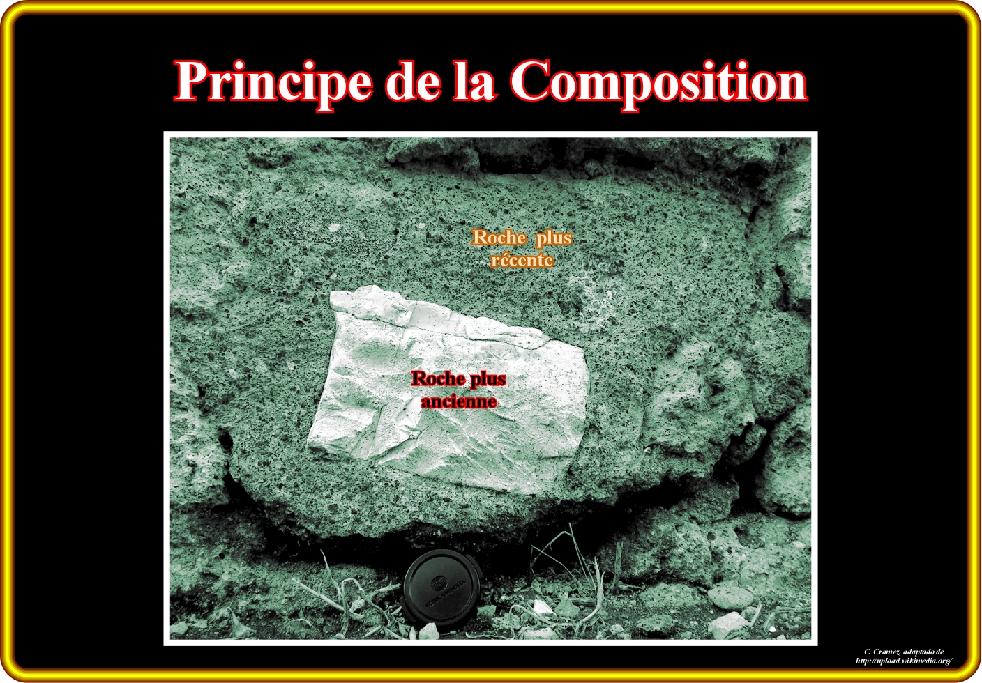 Selon ce principe, une roche est plus jeune que ses composants. Il s'applique à tous les types de roches : "Une roche représenté par des fragments dans une autre roche est plus ancienne que la roche qui les contient". Une roche granitique est plus jeune que les inclusions (enclaves) qu'elle contient. Un conglomérat est plus jeune que ses cailloux, qui sont, souvent, des fragments de roches sédimentaires plus anciennes.