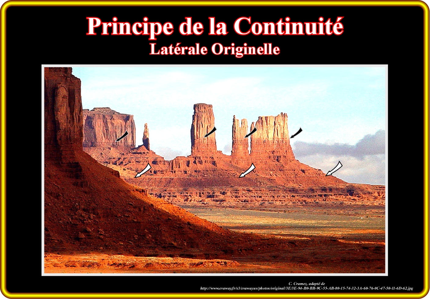 "Les couches sédimentaires se déposent en continuité latérale". Elles s'amincissent jusqu'à disparaître par des biseaux d'aggradation ou de progradation contre les bords des zones de déposition originelle". Ce principe est toujours valable. Il admet que la continuité latérale des sédiments peut disparaître en raison de l'érosion ou des mouvements tectoniques. En fait, les sédiments, au moment du dépôt, sont connectés, mais ils peuvent ensuite être séparés, par exemple, en raison de la formation de vallées fluviales. Une telle discontinuité, si évidente aujourd'hui, était très difficile d'expliquer au XVIIe siècle .