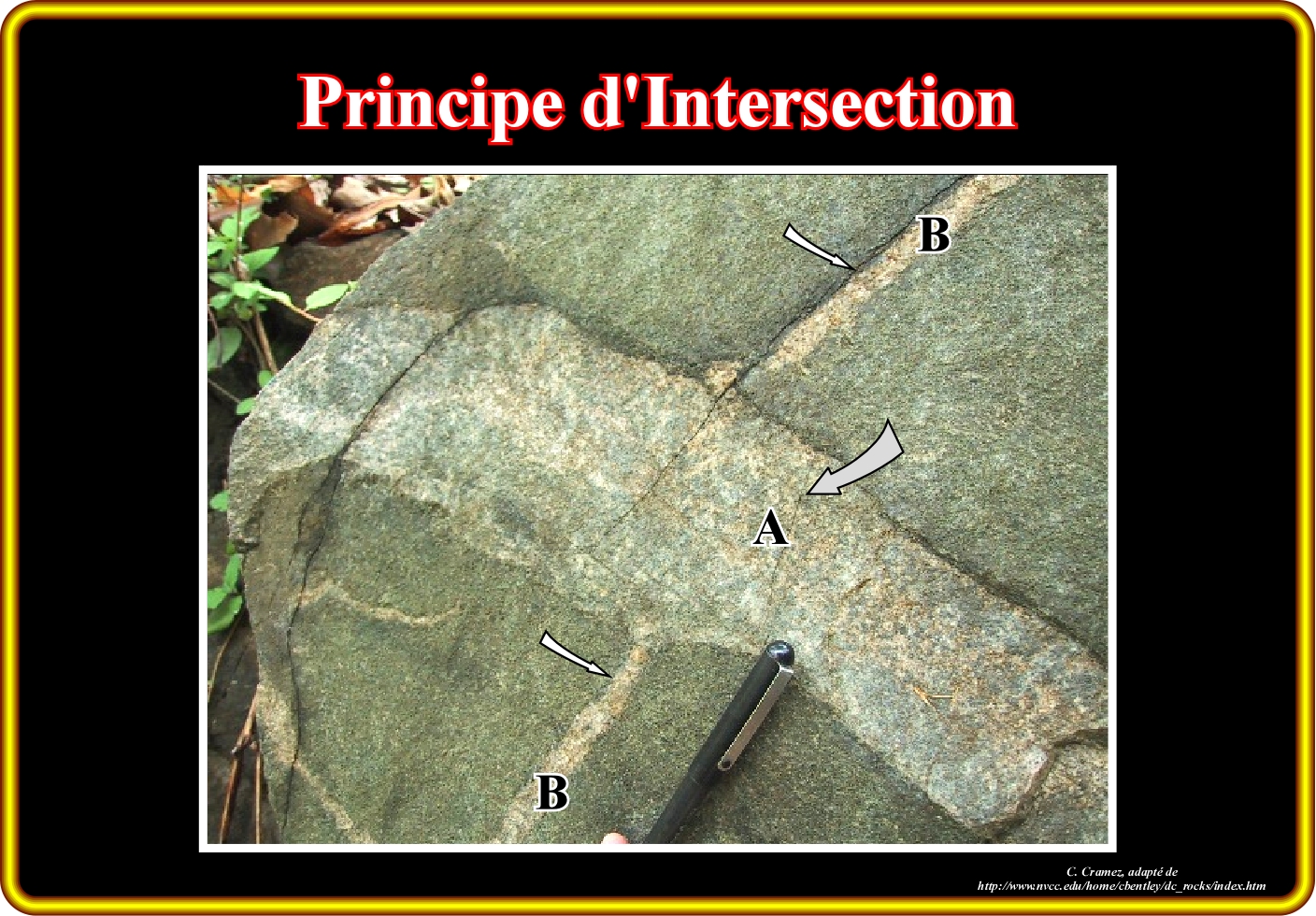 Dans cette figure, c'est le filon A, qui a été déplacé par le filon B qui est, certainement, le plus récent (notons que la surface d'observation est plus ou moins plate). Ce principe, appelé principe de l'intersection peut, également, être utilisé pour dater les systèmes de faille. Les failles sont plus jeunes que les roches qu'elles déplacent et plus ancienne que les roches que les fossilisent en discordance. Également, on peut dire que les failles plus jeunes déplacent les failles les plus anciennes. Toutefois, ce principe est valable uniquement lorsqu'il est appliqué sur des surfaces d'observation relativement plates. Dans des les cartes structurales en isochrones (égal temps) ou en isohypses (courbes de niveau), en raison de la topographie, c'est la faille ou le filon apparemment déplacé qui est le plus récent (voir : Relations d'Intersection). Outre ce principe géologique, il y a d'autres principes géologiques dont les plus importantes sont : (i) Principe de composition - une roche représentée par des fragments dans une autre roche est plus ancienne que la roche qui les contient ; (ii) Principe de Goguel - pendant la déformation, le volume de sédiments reste, plus ou moins, constant; (iii) Principe d'horizontalité originale, qui dit que les couches sédimentaires sont déposées horizontalement ; (iv) Principe de l'intrusion - une roche intrusive ignée est plus jeune que celle qu'elle pénètre ; (v) Principe le superposition - dans une série sédimentaire non ou légèrement déformée, les couches les plus anciennes sont à la base et les couches les plus récentes sont successivement vers le haut ; (vi) Principe de la succession des fossiles - la distribution des fossiles dans les roches n'est pas imprévisible, ils suivent une succession verticale définie ; (vii) Principe de Walther - les faciès qui se suivent verticalement dans des strates conformes, se suivent latéralement dans les environnements adjacents ; (viii) Principe du sceau carbonaté qui dit que la croissance d'une plate-forme auréolée est déterminée par la croissance de l'auréole ; (ix) Principe de Uniformitarianisme - les changements géologiques sont dues, principalement, aux mêmes processus et les changements continus qui peuvent être observés actuellement ; (x) Principe d'Ochkam - la pluralité ne doit pas être invoqué sans besoin “Pluritas non est ponenda sine necessita” ; (ix) Principe dextrogyre - si un système de référence tourne dans ce sens des aiguilles d'une montre, la déflexion d'un objet (effet de Coriolis) est vers la gauche.