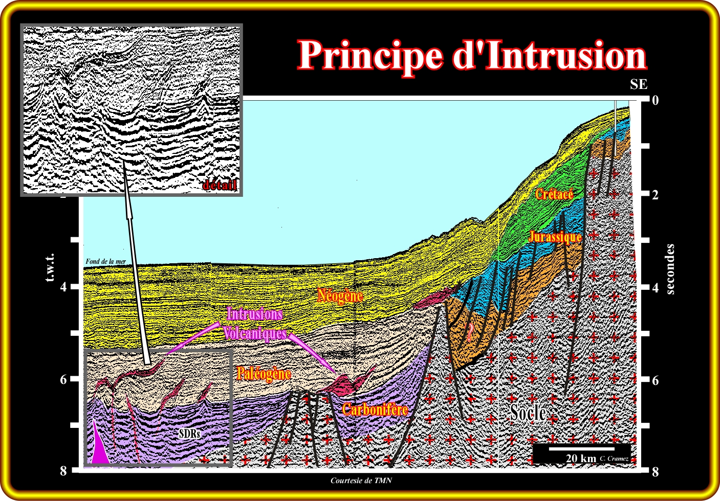 Dans cette tentative d'interprétation géologique d'une ligne sismique régionale de l'offshore profond au Nigeria, les structures compressives régionales (anticlinaux cylindriques et failles inverses), avec de polarité vers le continent (Est) sont, facilement, expliquées comme le résultat d'un raccourcissement sédimentaire produit par une contrainte créée par la dorsale médio-Atlantique (Atlantique Sud). En réalité, ces structures qui sont situés à des dizaines de kilomètres à l'ouest de structures de compression de la base du talus continental, ne peuvent pas être expliquées comme une contrepartie de l'extension (autrement dit, l'allongement des sédiments) qui a eu lieu en amont, c'est-à-dire, dans la plate-forme et talus continental. En effet, les structures de compression qui se sont formées en contrepartie de l'extension, qui caractérise le plateau continental et le talus continental supérieur, ont une polarité vers l'ouest. En d'autres termes, les plans de faille des failles inverses et les plans axiaux anticlinaux associés aux régime tectonique compressif local (contrepartie du régime tectonique en extension de la plate-forme et talus continental) inclinent vers le continent et non en direction de la dorsale médio-Atlantique, comme c'est le cas des structures illustrées dans cette tentative d'interprétation. Bien que ces structures qui affectent le fond de la mer, c'est-à-dire, qu'elles sont récentes, une fois que le régime compressif, que les a créée est encore actif, forment des pièges de grandes dimensions, elles ne sont pas des bons objectifs pour l'exploration pétrolière. En effet : (i) Le sous-système pétrolier générateur (roches-mères) principal de la région manque ici (il se trouve beaucoup plus à l'Est des chevauchement frontaux) ; (ii) Les roches-réservoirs, probablement sont, aussi, absentes (la colonne sédimentaire est ici est presque entièrement composée de sédiments argileux). Notons que l'absence du sous-système pétrolier générateur (probabilité 0) est un paramètre pétrolier mortel, une fois que huile de générateur de sous-système (probabilité 0) est un paramètre mortel, une fois que dans le calcul des probabilités de découverte 1 x 1 x 1 x 1 x 0 est toujours égal à zéro.