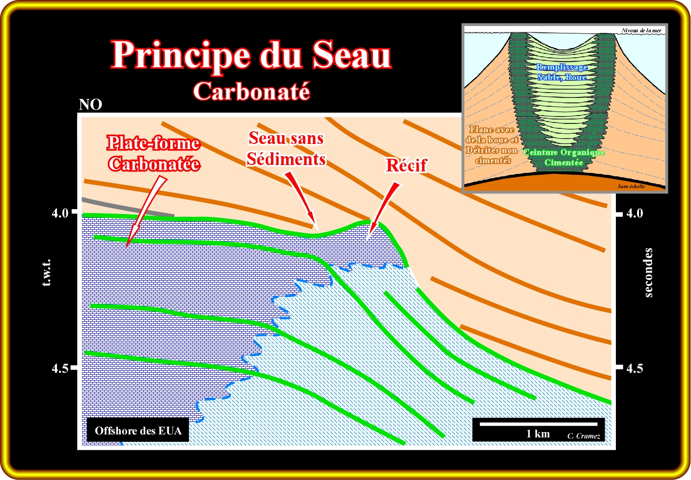 L'architecture de la croissance d'une plate-forme carbonatée auréolée ressemble à la géométrie d'un seau soutenue, soit par des bordures rigides formées par des récifs ou par rapide cémentation de sable de haut fond (sables carbonatés), soit par le remplissage de sédiments non-consolidés sédiments du lagon ou de la plaine marée. N'oublions pas que trois concepts de base doivent être prises en compte dans la sédimentation carbonatée : (a) Les carbonates sont, principalement, d'origine organique ; (b) Les carbonates construisent structures résistantes aux vagues de la mer et (c) Les carbonates subissent un changement diagénétique très intense, une fois que le minéral d'origine est métastable. Outre ce principe géologique, il y a d'autres principes géologiques dont les plus importantes sont : (i) Principe de composition - une roche représentée par des fragments dans une autre roche est plus ancienne que la roche qui les contient ; (ii) Principe de Goguel - pendant la déformation, le volume de sédiments reste, plus ou moins, constant ; (iii) Principe d'horizontalité originale - les couches sédimentaires sont déposées horizontalement ; (iv) Principe de l'intersection - les filons plus récents déplacent les filons plus anciens ; (v) Principe le superposition - dans une série sédimentaire non ou légèrement déformée, les couches les plus anciennes sont à la base et les couches les plus récentes sont successivement vers le haut ; (vi) Principe de la succession des fossiles, la distribution des fossiles dans les roches n'est pas imprévisible, ils suivent une succession verticale définie ; (vii) Principe de Walther - les faciès qui se suivent verticalement dans des strates conformes, se suivent latéralement dans les environnements adjacents ; (viii) Principe d'Ochkam - la pluralité ne doit pas être invoquée sans besoin “Pluritas non est ponenda sine necessita” ; (ix) Principe de Uniformitarianisme - les changements géologiques sont dues, principalement, aux mêmes processus et les changements continus qui peuvent être observés actuellement ; (x) Principe de l'intrusion - une roche intrusive ignée est plus jeune que celle qu'elle pénètre ; (ix) Principe dextrogyre, qui dit que si un système de référence tourne dans ce sens des aiguilles d'une montre, la déflexion d'un objet (effet de Coriolis) est vers la gauche.