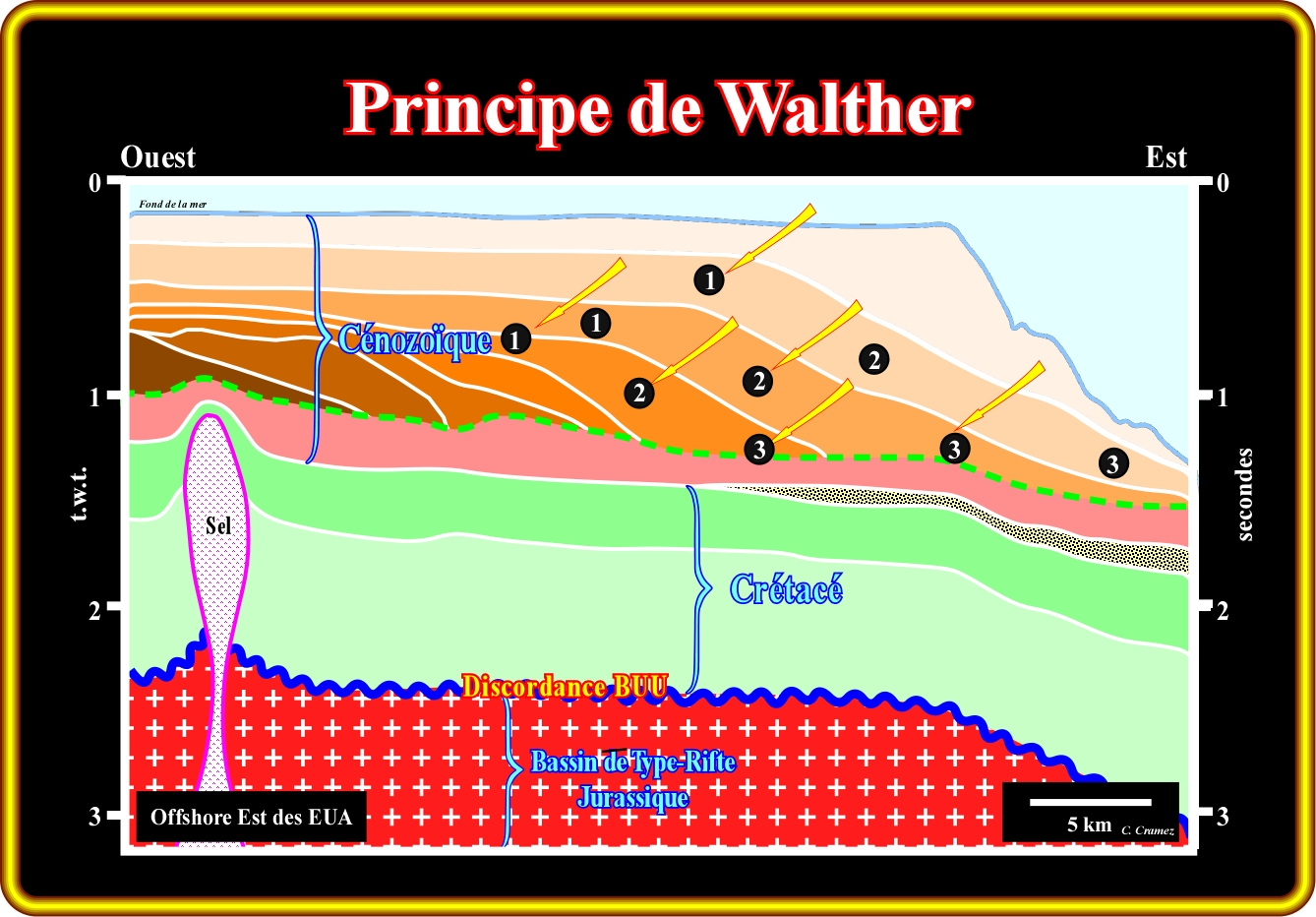 8 ) Principe de Walther -Ce principe, ou loi de corrélation des faciès de Walther, indique que : «Les faciès qui se suivent verticalement dans des strates conformes se suivent verticalement dans les environnements adjacents". En d'autres termes, en continuité de sédimentation, si un géoscientiste reconnaît, latéralement, un faciès sableux de la plaine côtière, un faciès argileux de talus continentale et enfin un faciès argileux de la plaine abyssale, il reconnaîtra, verticalement et du bas vers le haut, un faciès argileux de plaine abyssale, un des faciès argileux de talus continental et enfin un faciès sableux de la plaine côtière.